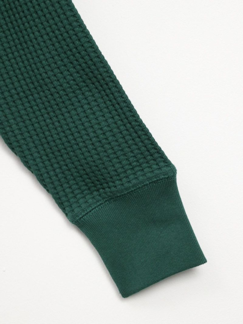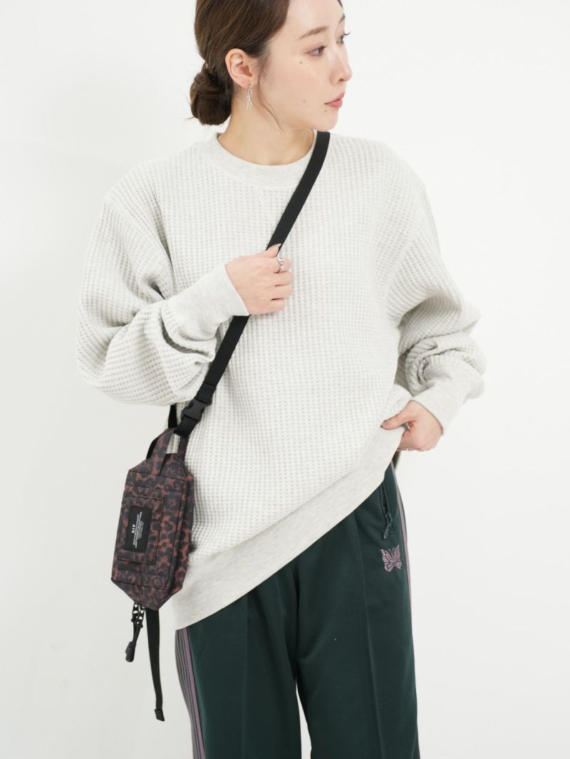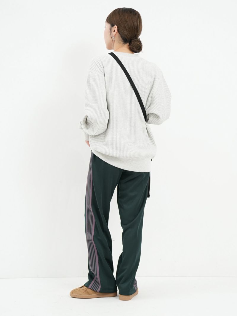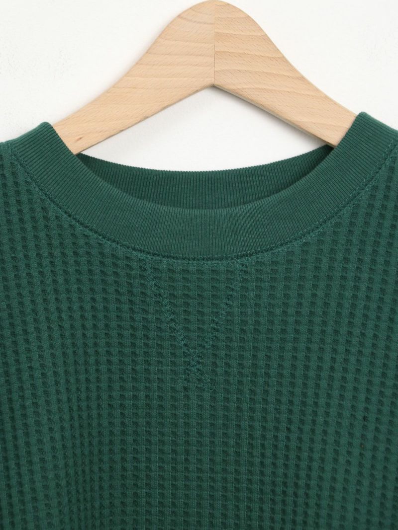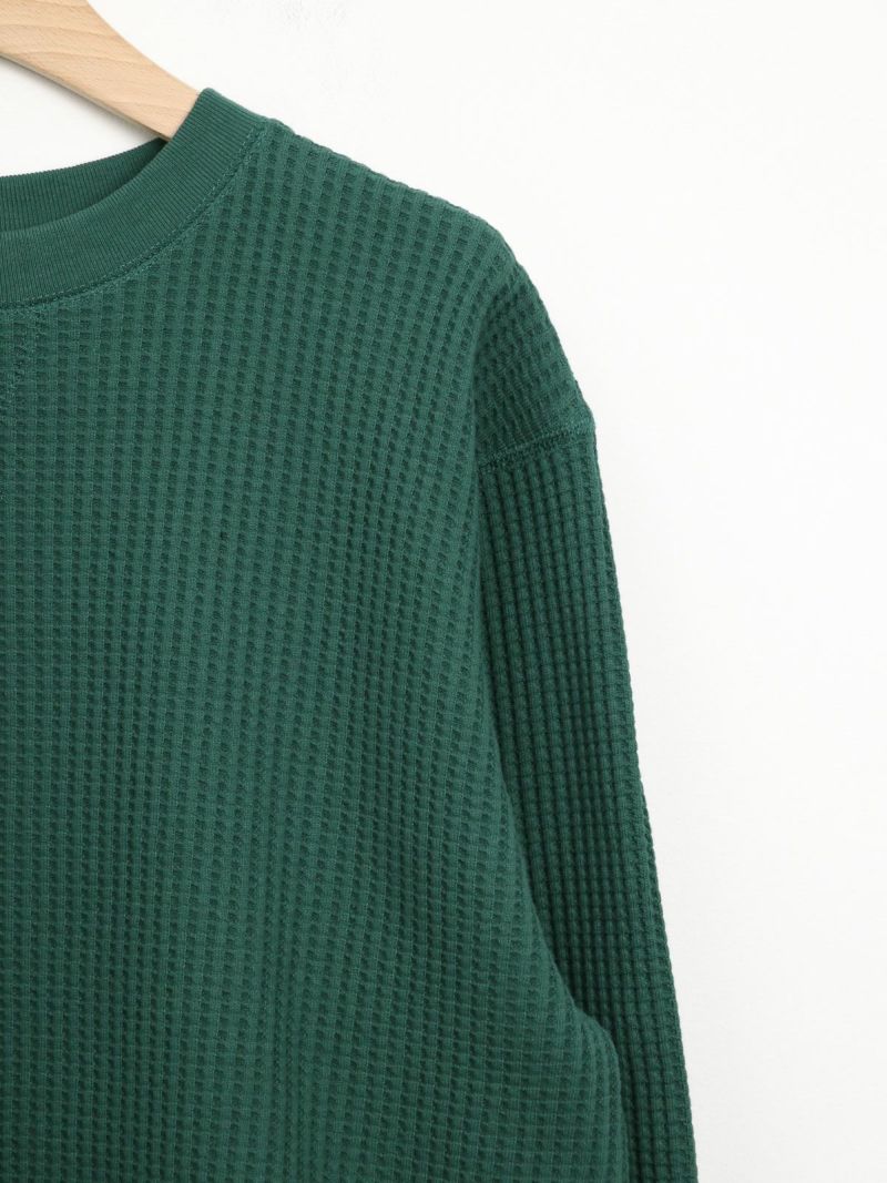 JEMORGANを代表するビッグワッフル素材のNEW ITEM。 ヘビーウェイトなワッフルを使用したクルーネックで、スウェットのように気軽に1枚でも、ニットのようにシャツと合わせて綺麗めな着こなしなど、幅広くお使いいただけます。混紡生地を使用し、コットン100%に比べて型崩れしずらく、衿・裾・袖口はリブ仕様で防寒性にも優れたしっかりとした仕上がり。
