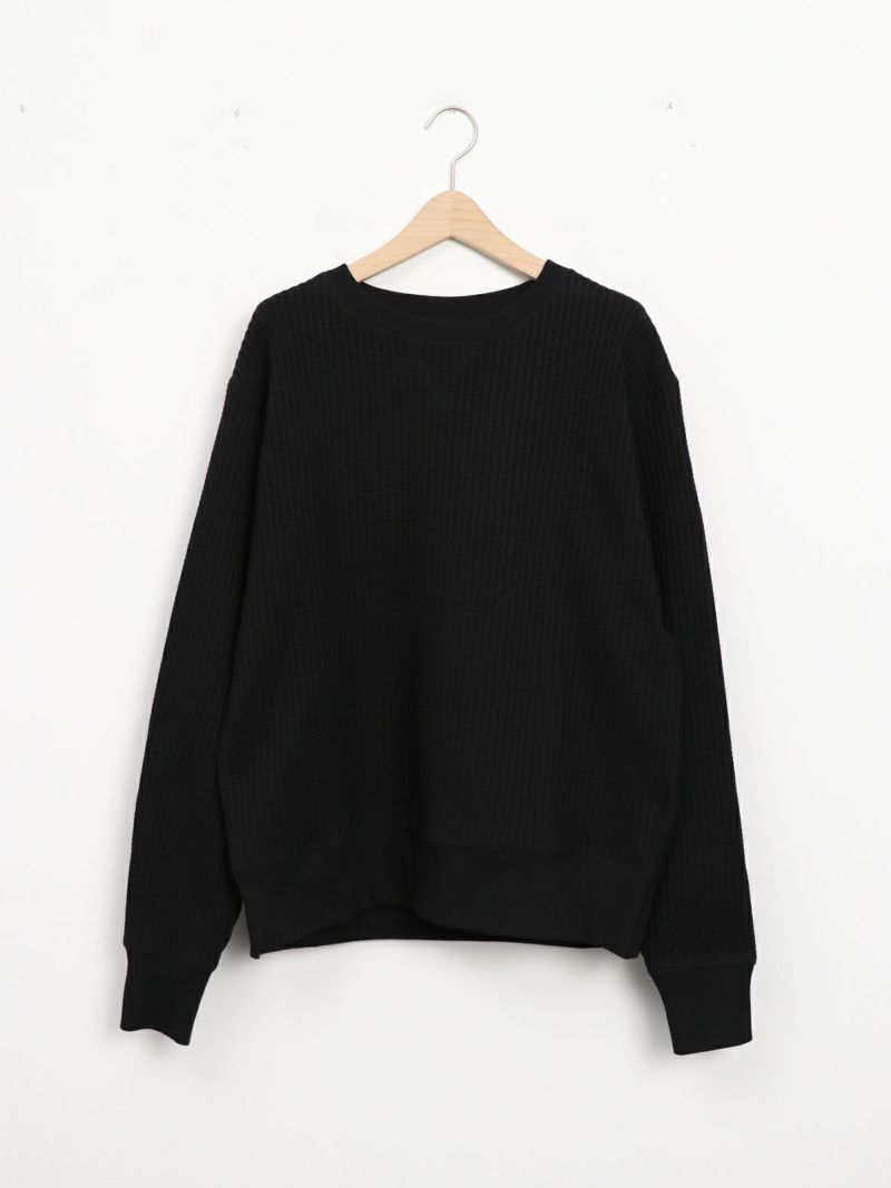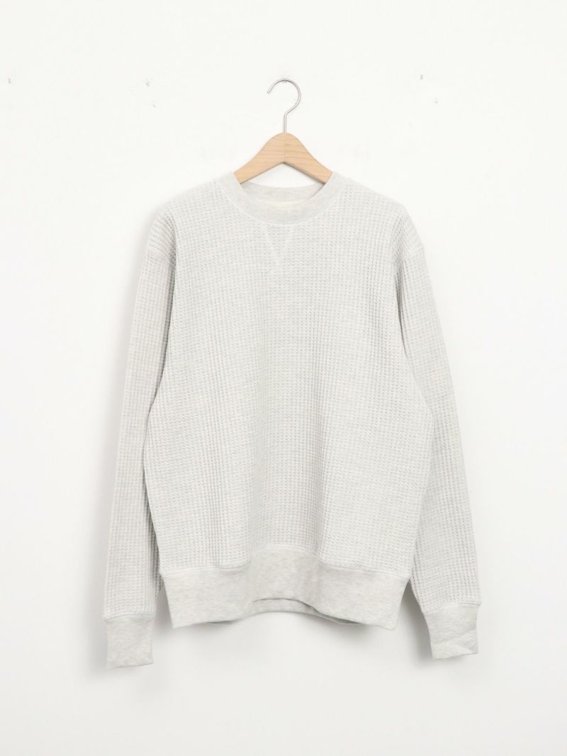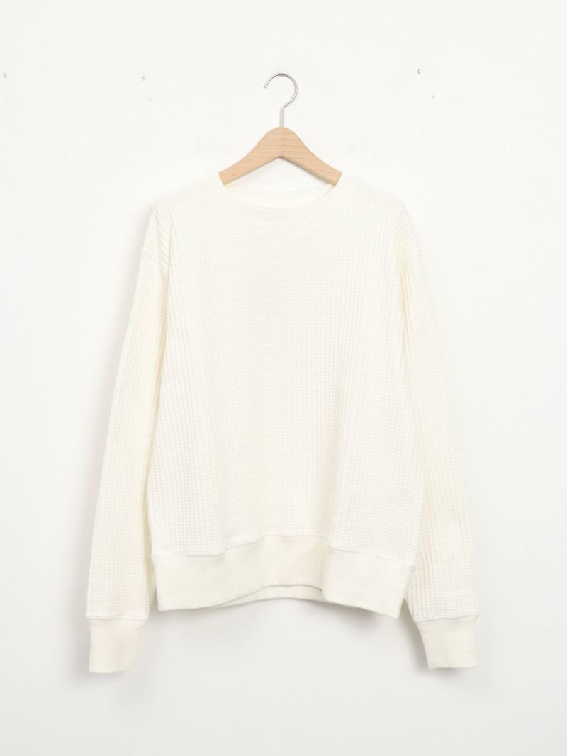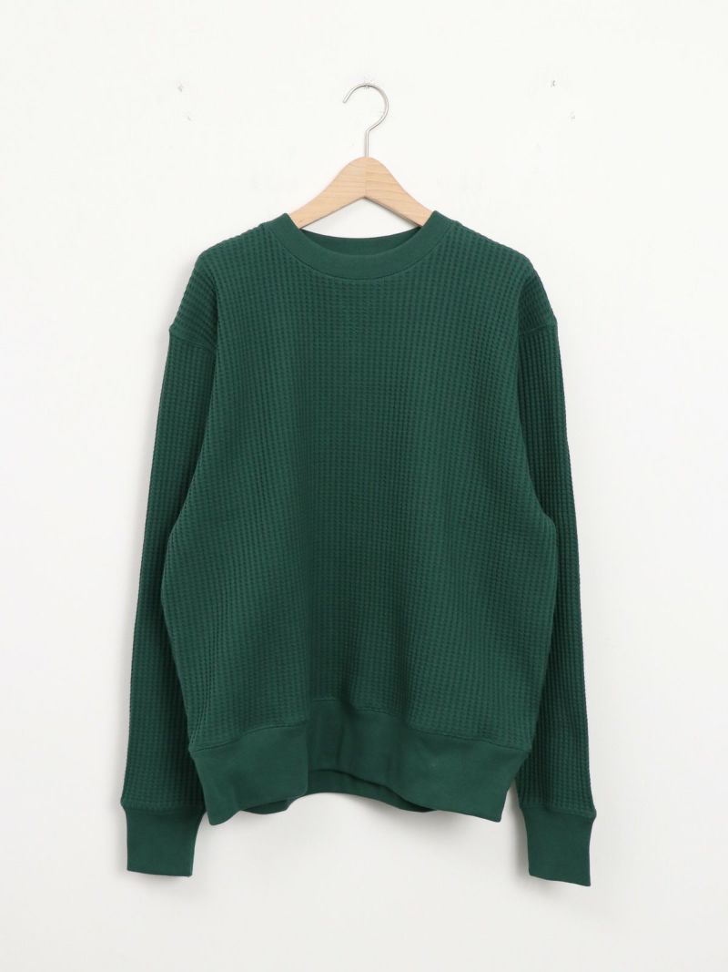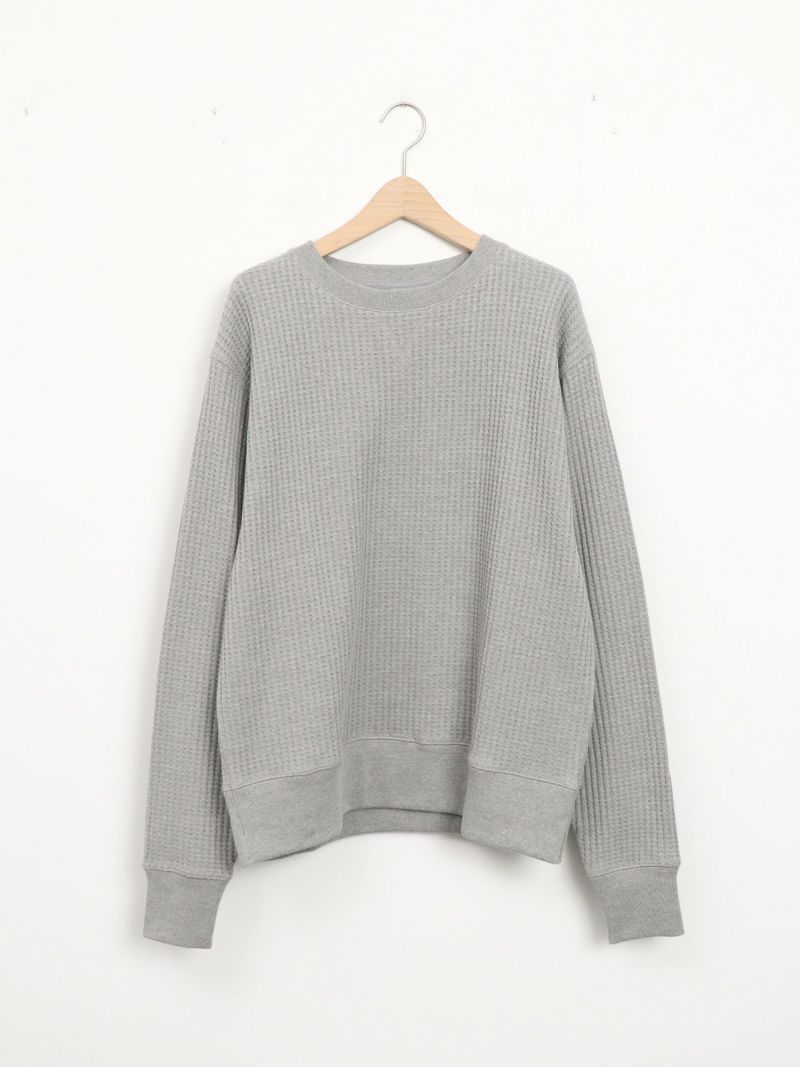 JEMORGANを代表するビッグワッフル素材のNEW ITEM。 ヘビーウェイトなワッフルを使用したクルーネックで、スウェットのように気軽に1枚でも、ニットのようにシャツと合わせて綺麗めな着こなしなど、幅広くお使いいただけます。混紡生地を使用し、コットン100%に比べて型崩れしずらく、衿・裾・袖口はリブ仕様で防寒性にも優れたしっかりとした仕上がり。