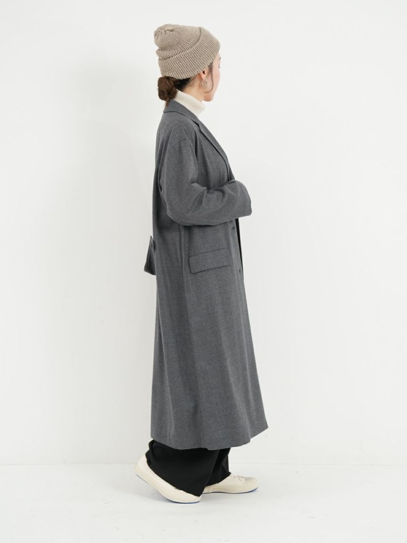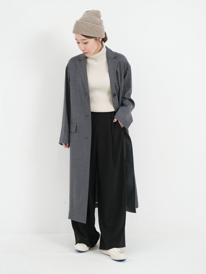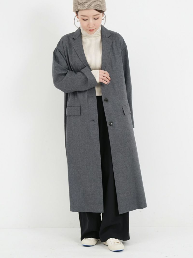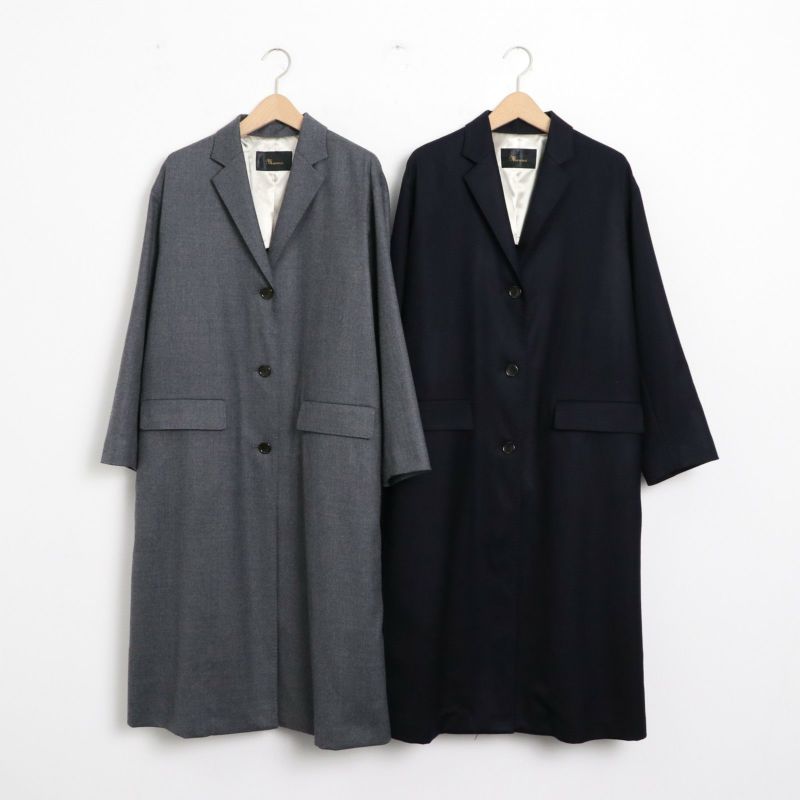 Manna定番のウールサキソニーコート。 程よく光沢感のある上品な素材感に、長く愛用できるシンプルかつモードなデザインが魅力です。あえてカジュアルにデニムやチノパンツなどと合わせても◎寒くなったらインナーダウンなどと合わせるのもおすすめです。