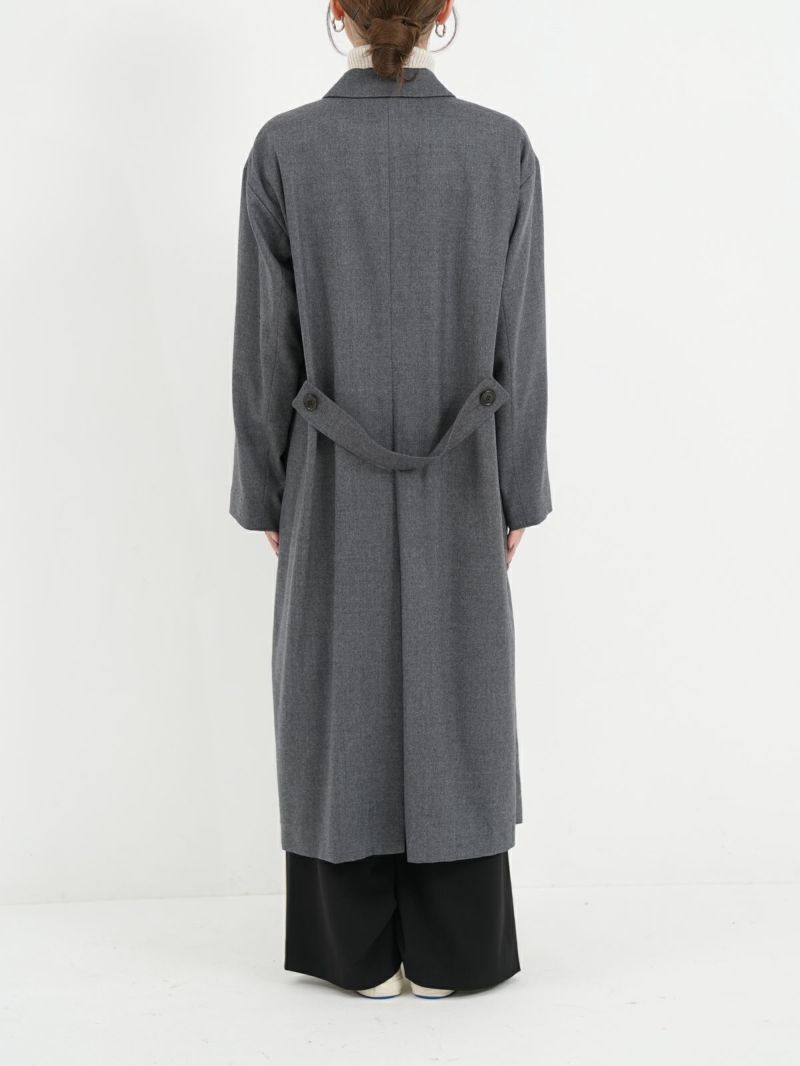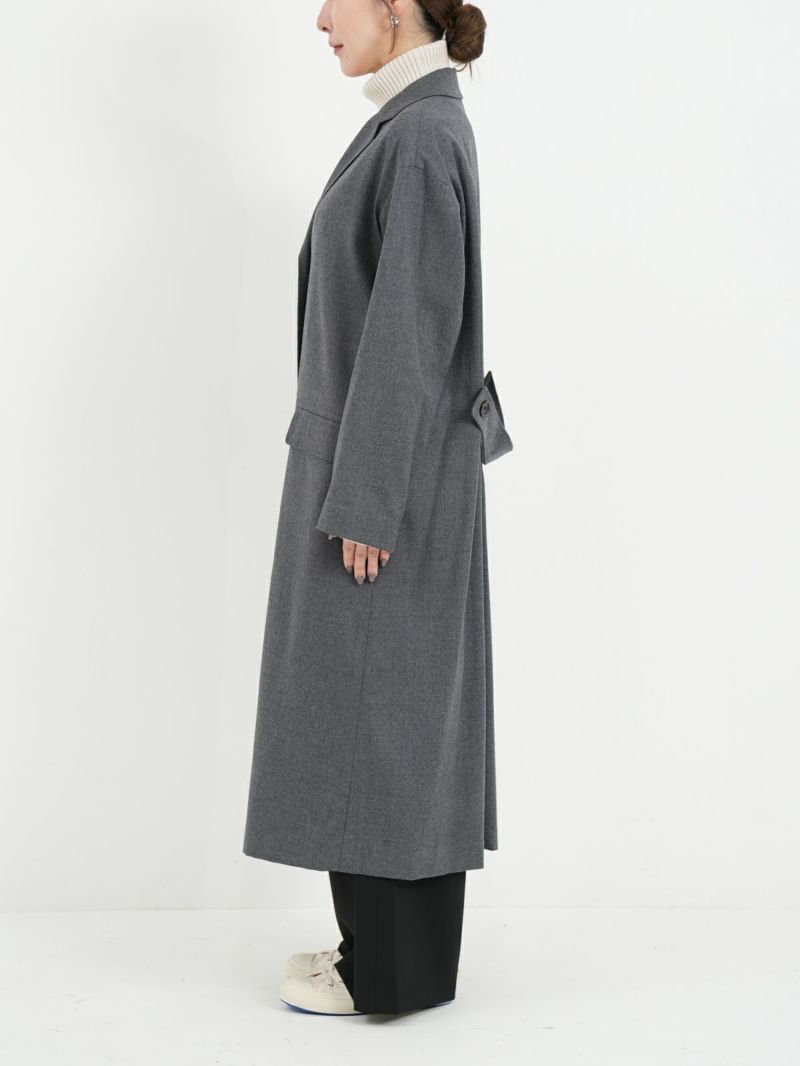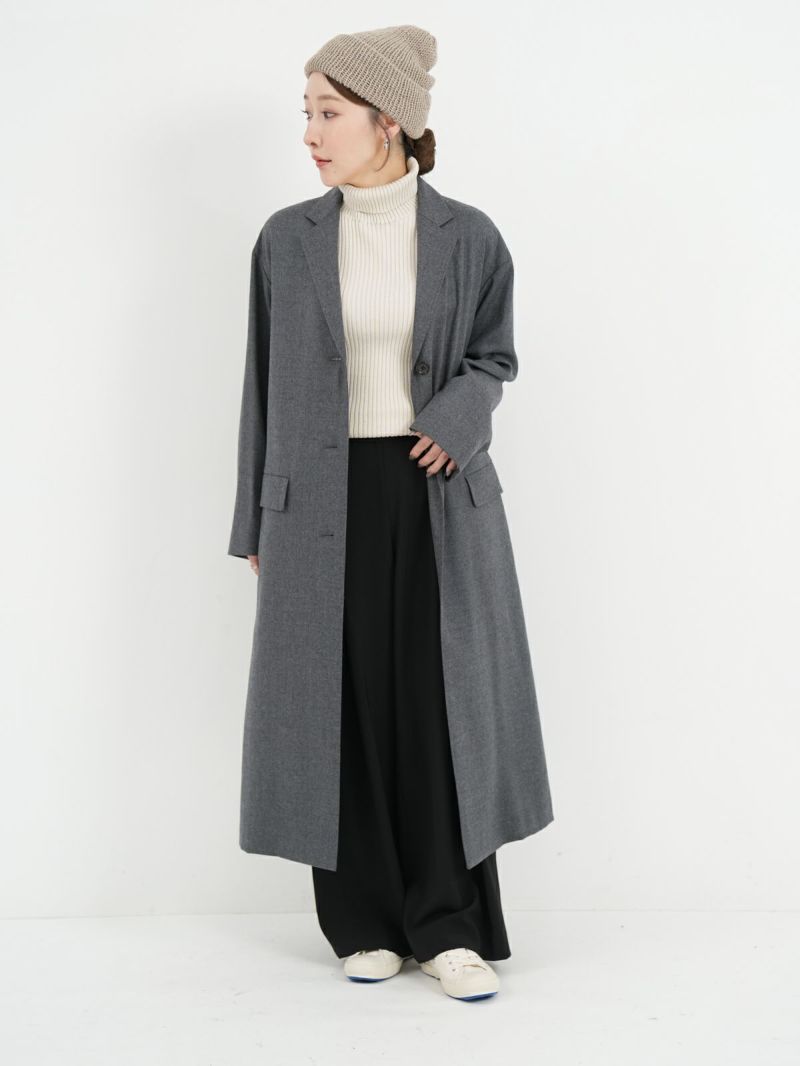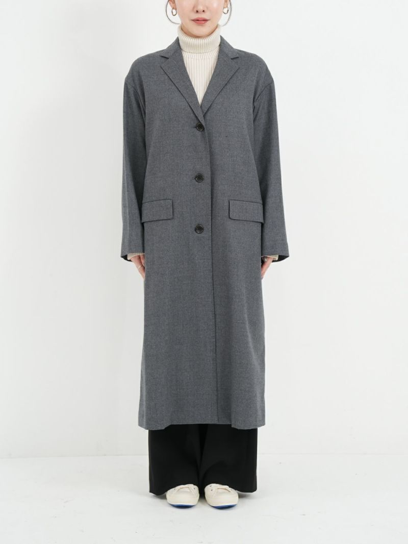 Manna定番のウールサキソニーコート。 程よく光沢感のある上品な素材感に、長く愛用できるシンプルかつモードなデザインが魅力です。あえてカジュアルにデニムやチノパンツなどと合わせても◎寒くなったらインナーダウンなどと合わせるのもおすすめです。