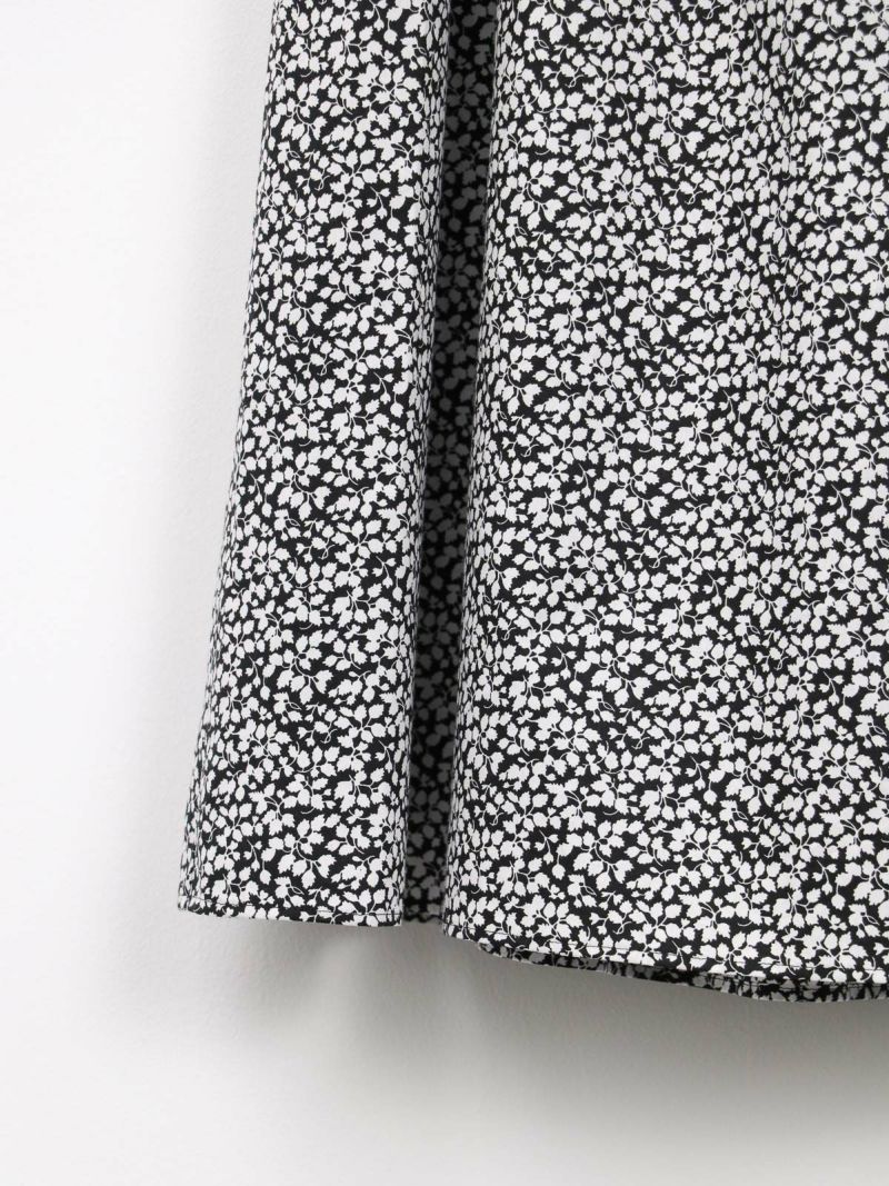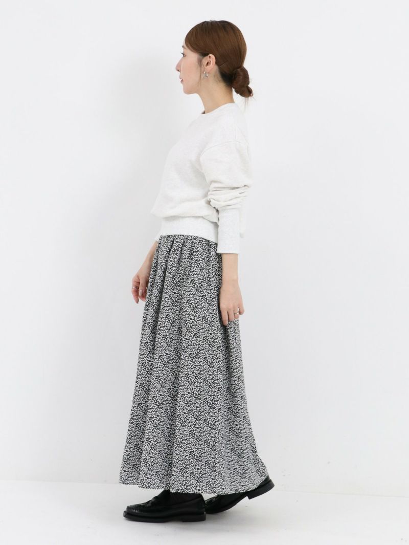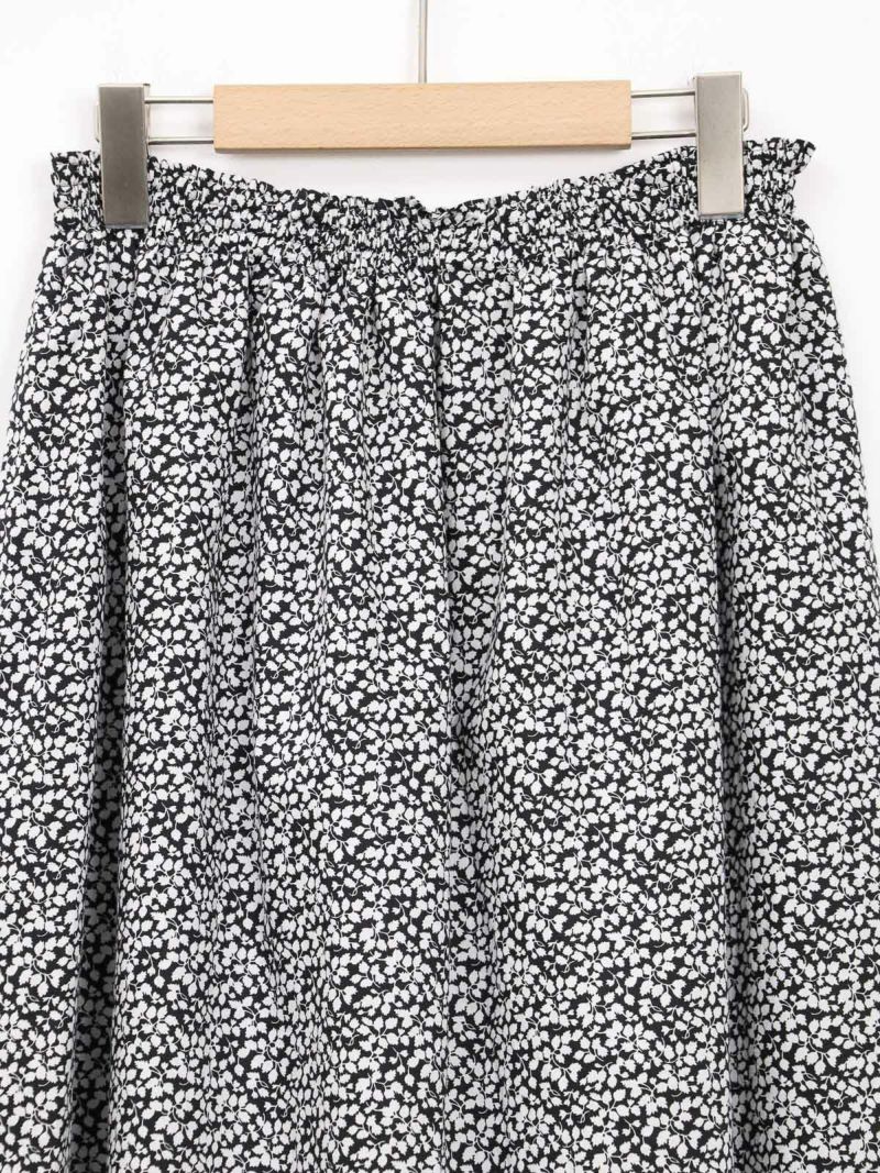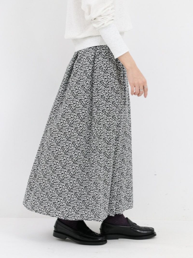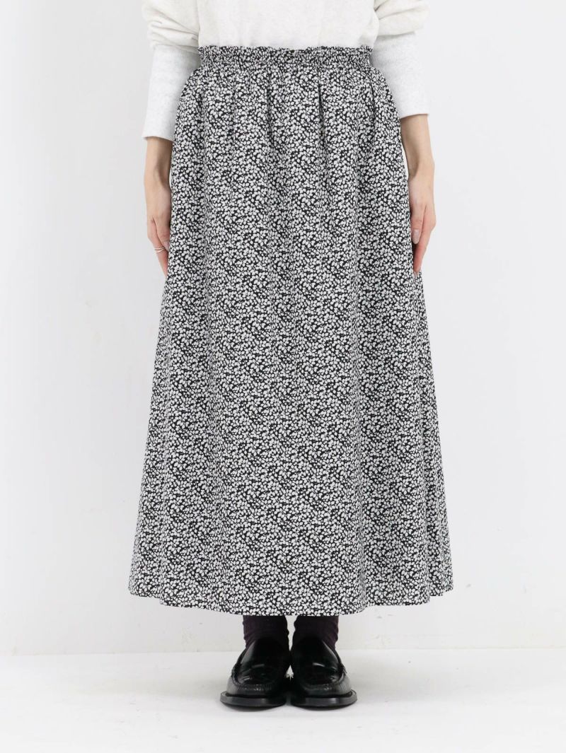 小花柄の白抜きプリントが印象的な、タナローン素材のギャザースカート。 ウエストは紐付きでサイズ調節ができ、リラックス感のある穿き心地です。生地は英国リバティ社が独自に開発した「タナローン」を使用。 上質なシルクのような艶と手触りを綿で再現した、なめらかで軽やかなローン素材です。 やわらかな肌ざわりと豊かなドレープ性で、暑い季節にも心地よく着られる一枚です。