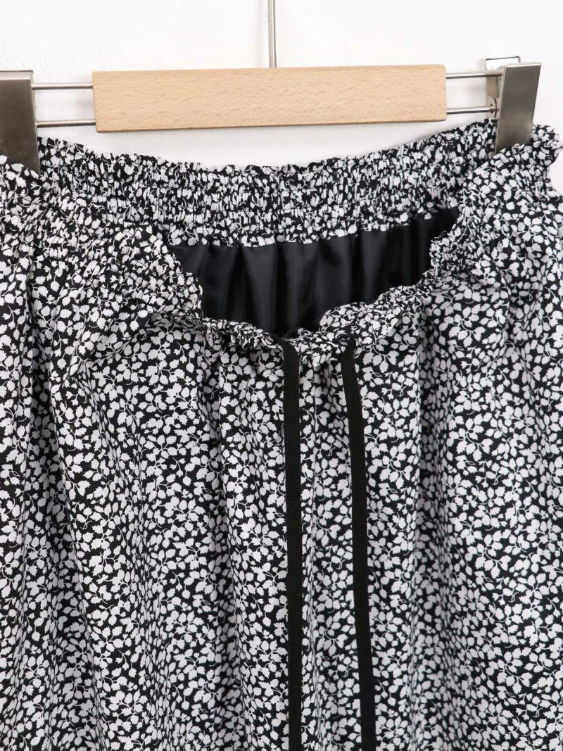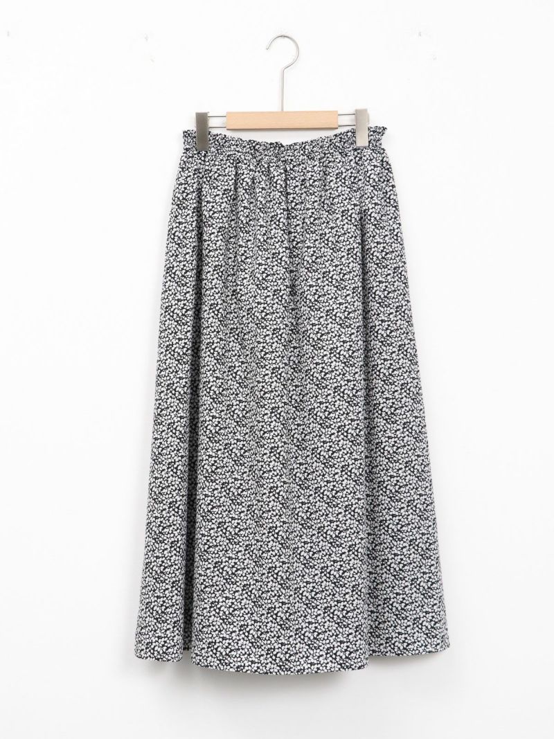 小花柄の白抜きプリントが印象的な、タナローン素材のギャザースカート。 ウエストは紐付きでサイズ調節ができ、リラックス感のある穿き心地です。生地は英国リバティ社が独自に開発した「タナローン」を使用。 上質なシルクのような艶と手触りを綿で再現した、なめらかで軽やかなローン素材です。 やわらかな肌ざわりと豊かなドレープ性で、暑い季節にも心地よく着られる一枚です。