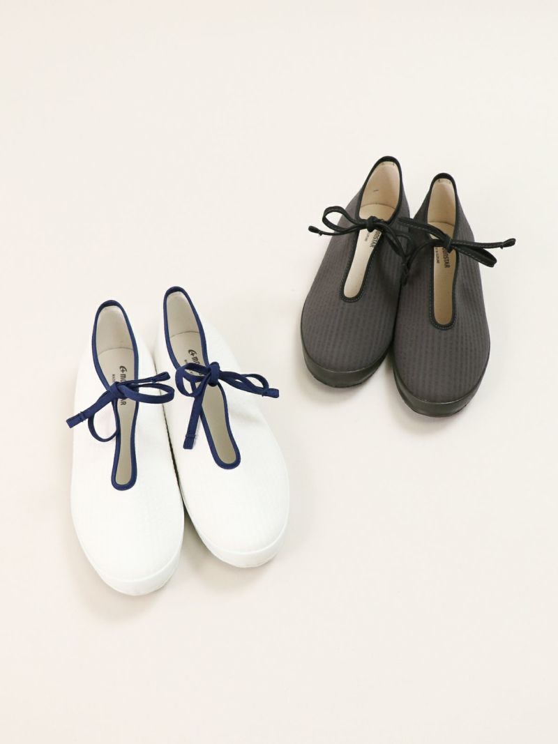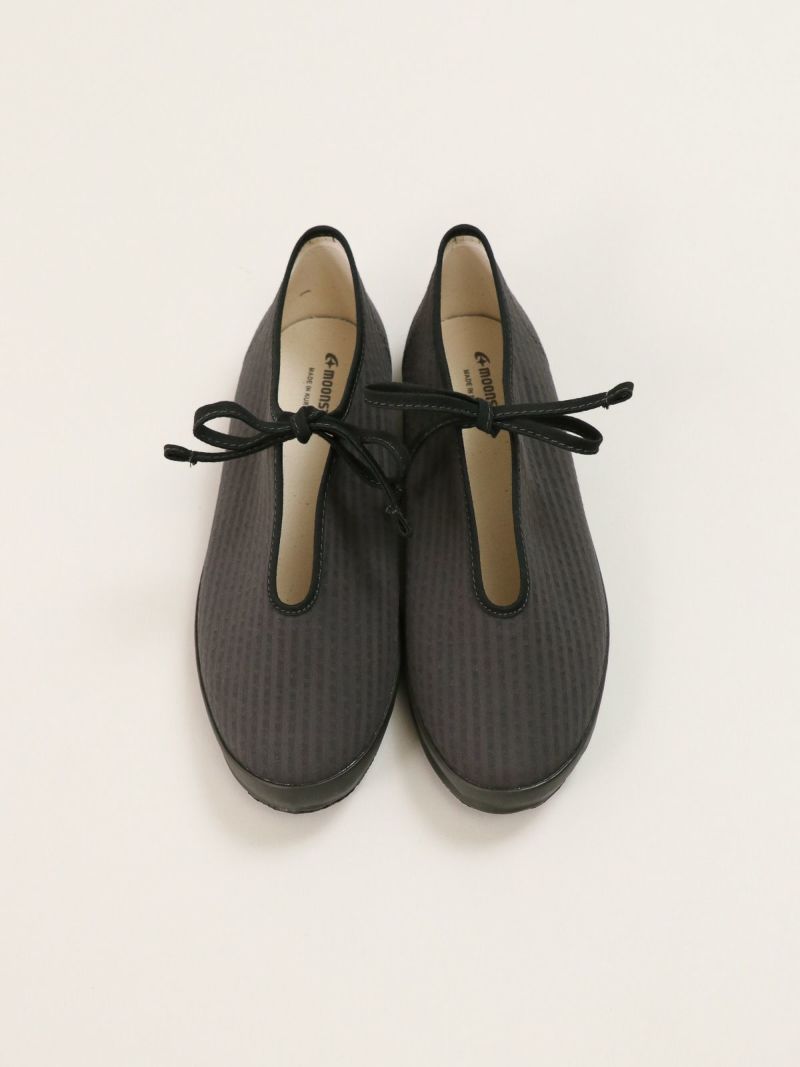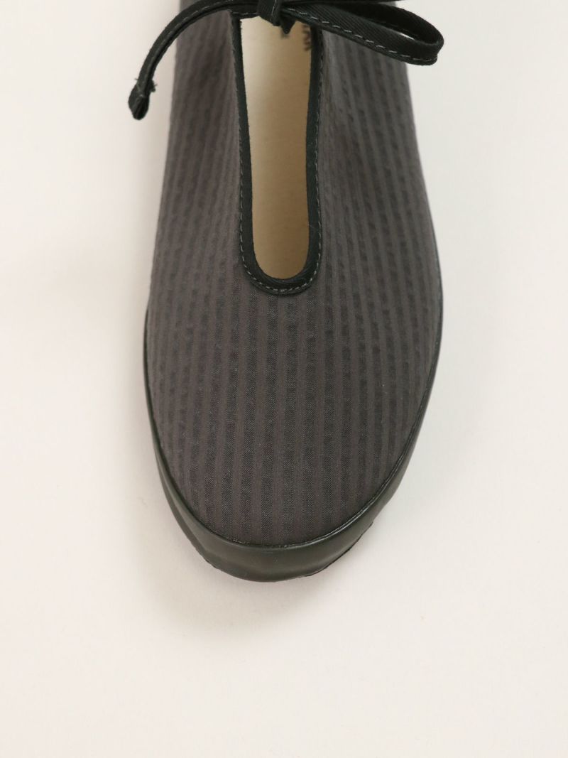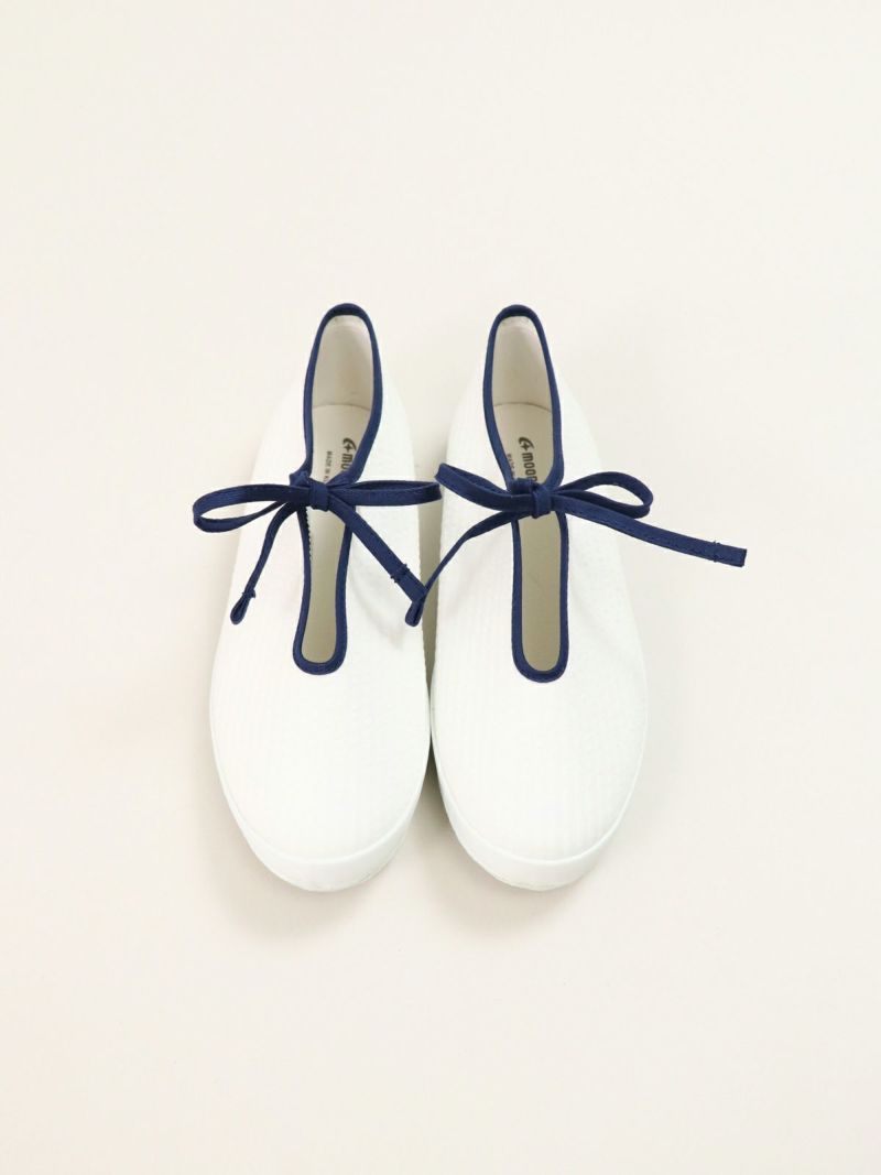 1枚もののアッパーに履口のパイピングを靴紐にしたシンプルな一足。素材にはシアサッカーを使用し、上品で柔らかなフォルムに蝶結びがアクセントになっています。