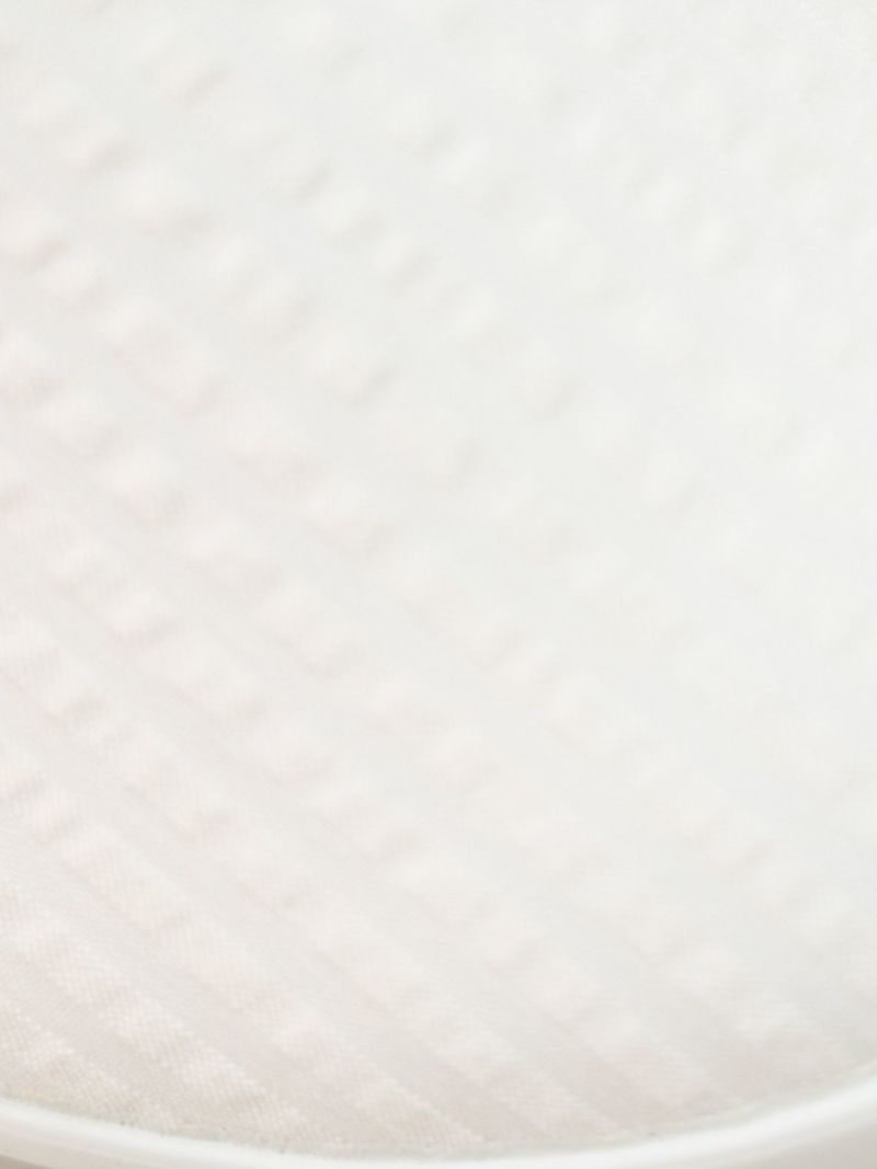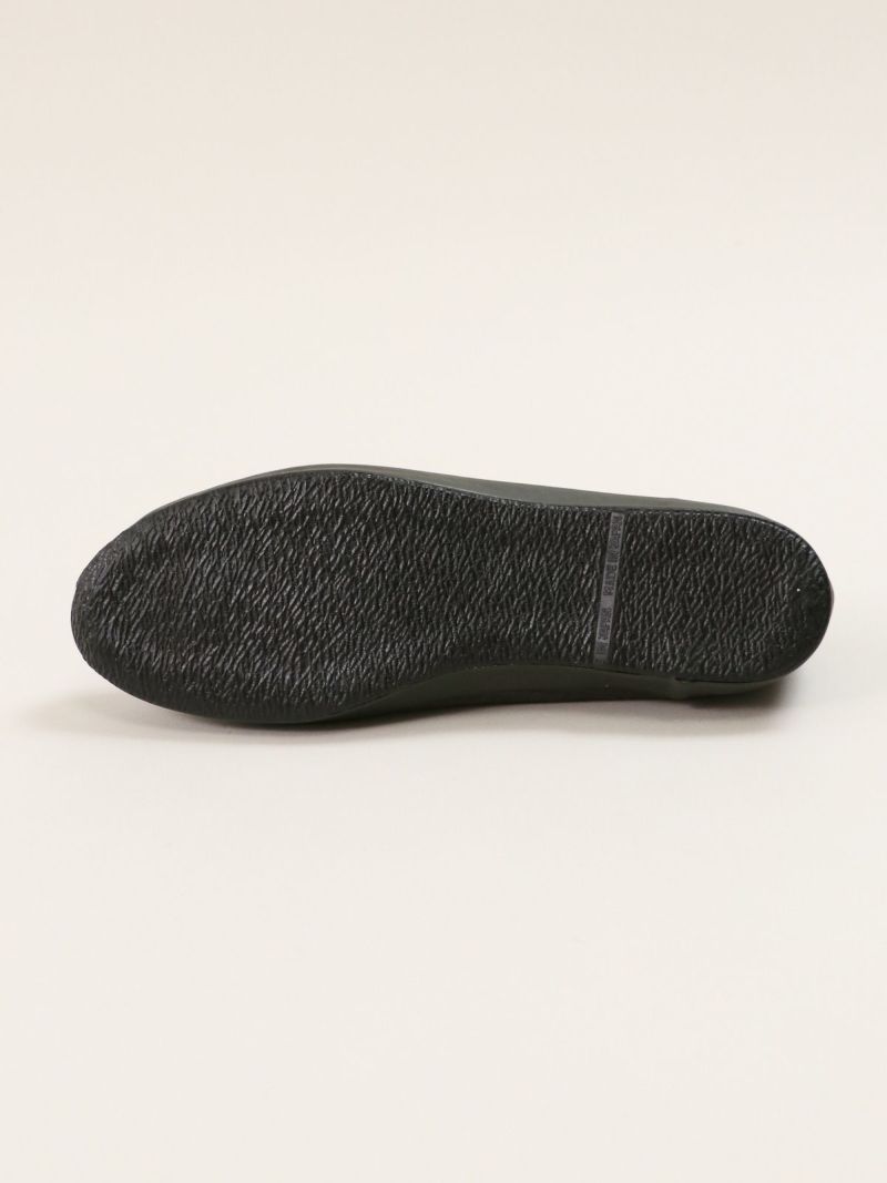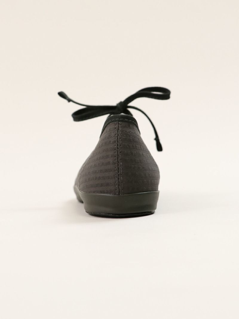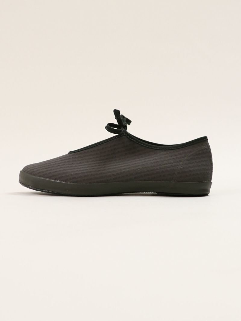 1枚もののアッパーに履口のパイピングを靴紐にしたシンプルな一足。素材にはシアサッカーを使用し、上品で柔らかなフォルムに蝶結びがアクセントになっています。