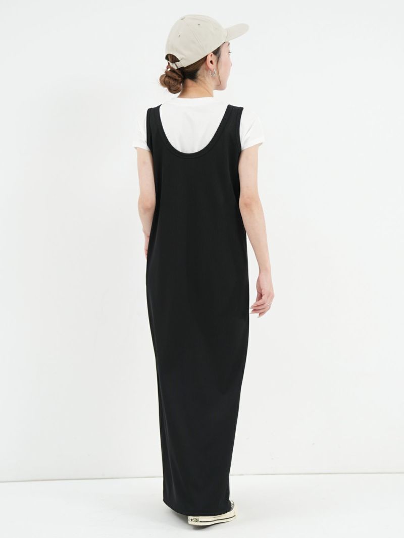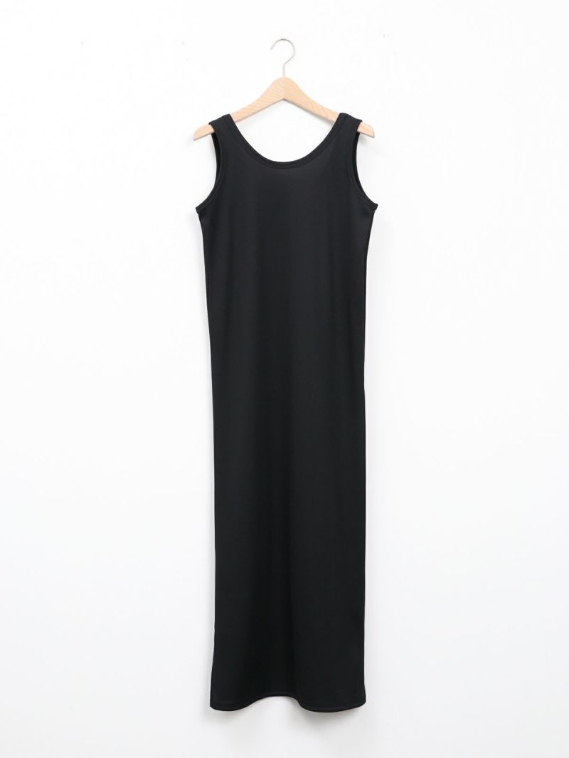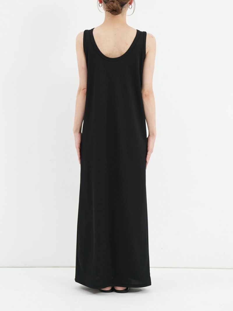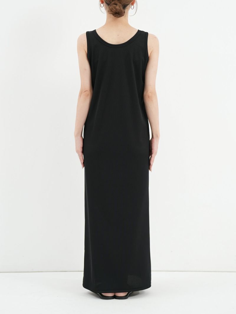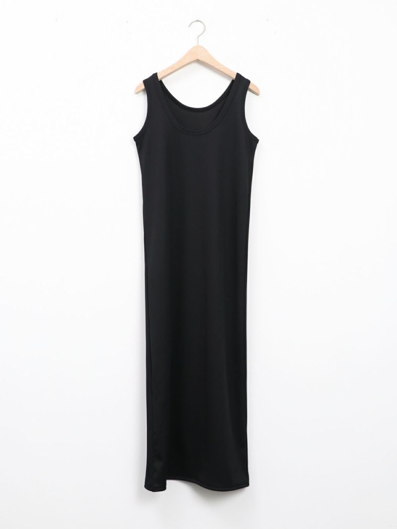 リブ素材のタンクトップワンピース。 程よい光沢と落ち感がありながらもハリ感のある生地を使用。シワになりにくくシルクのような滑らかなタッチとストレッチ性がポイント。1枚ではもちろん、シャツやカットソーを合わせて着ていただくのもおすすめです。