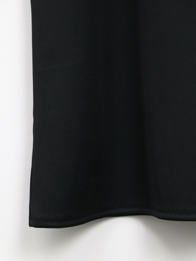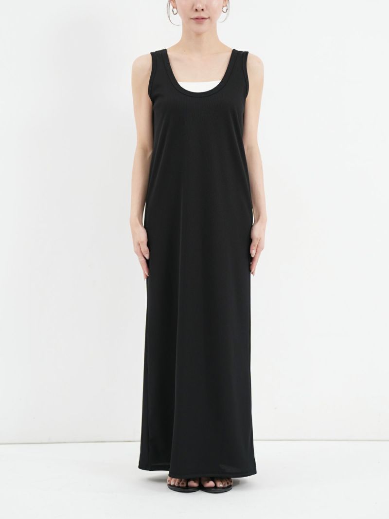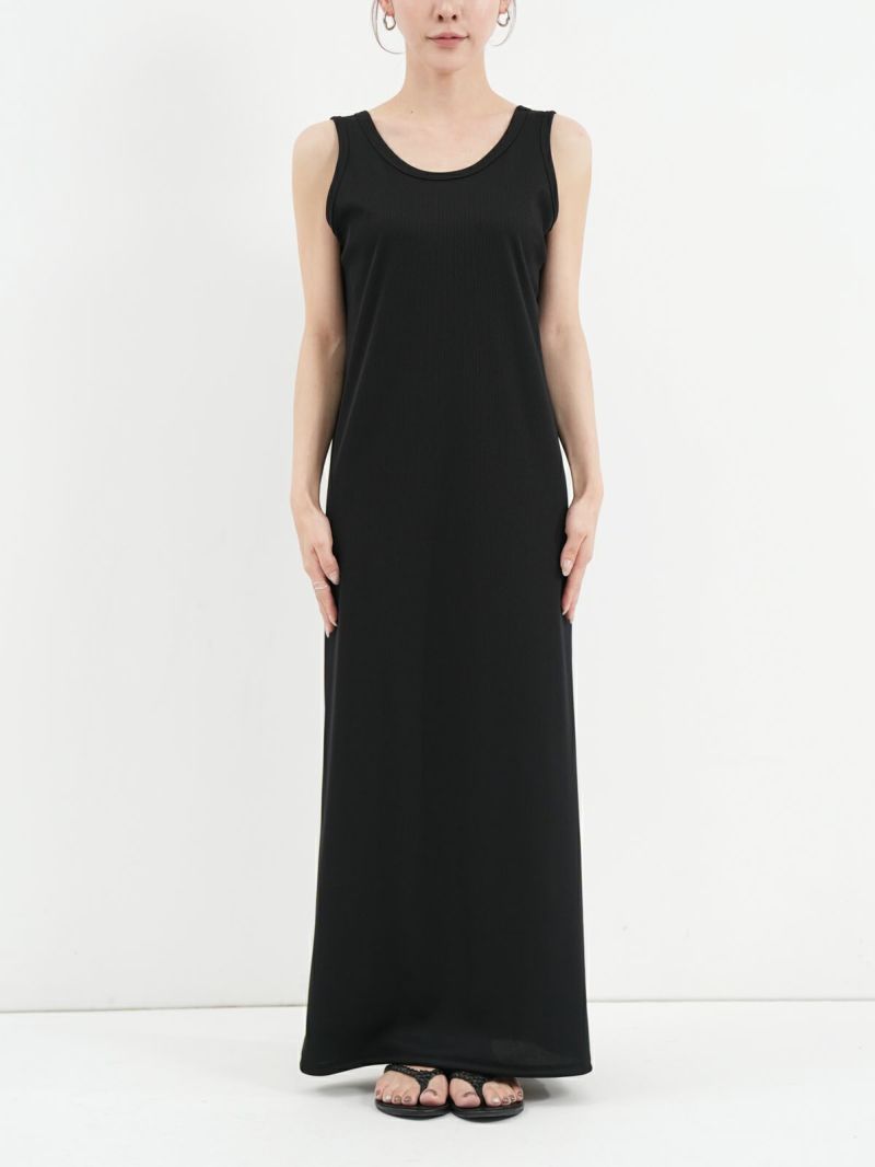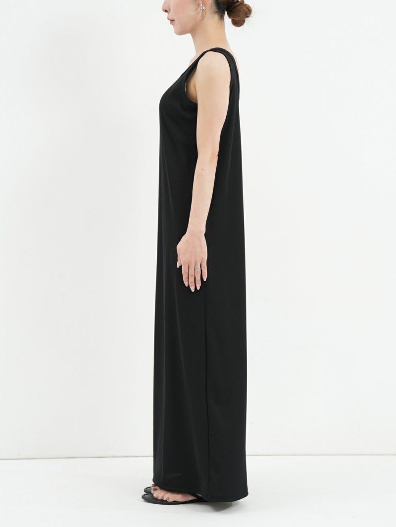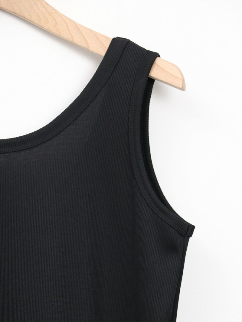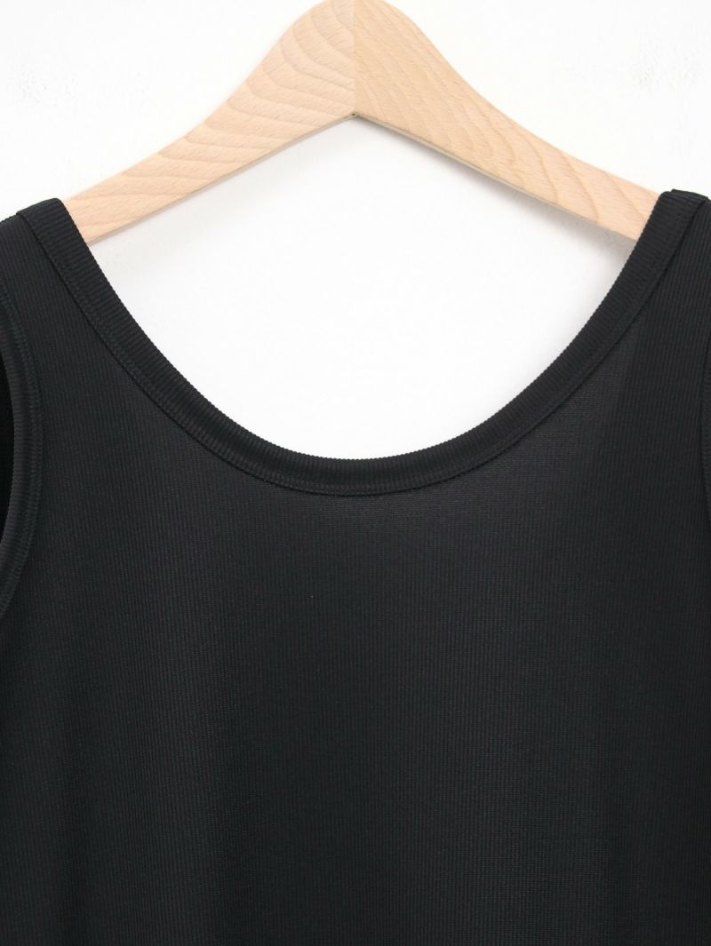 リブ素材のタンクトップワンピース。 程よい光沢と落ち感がありながらもハリ感のある生地を使用。シワになりにくくシルクのような滑らかなタッチとストレッチ性がポイント。1枚ではもちろん、シャツやカットソーを合わせて着ていただくのもおすすめです。