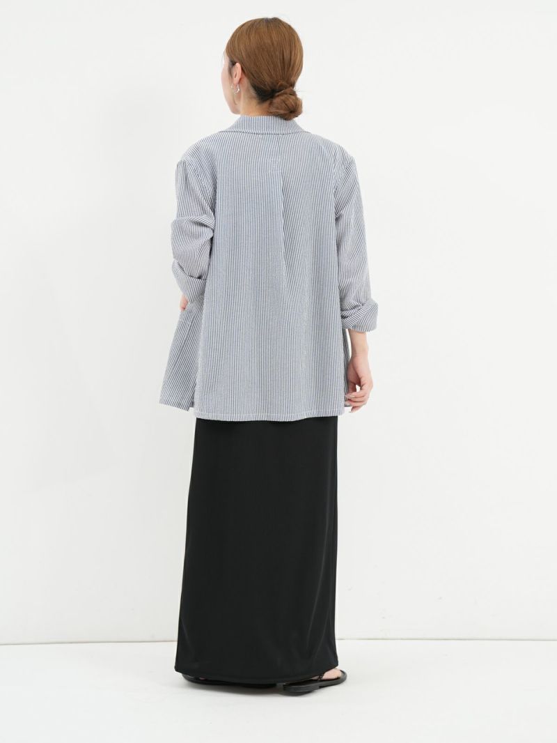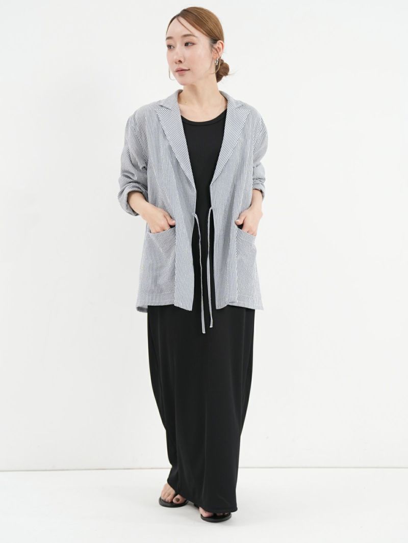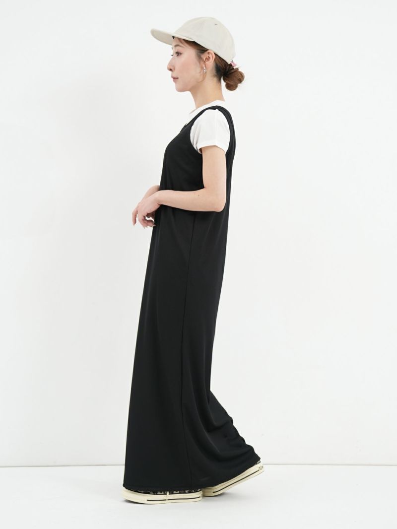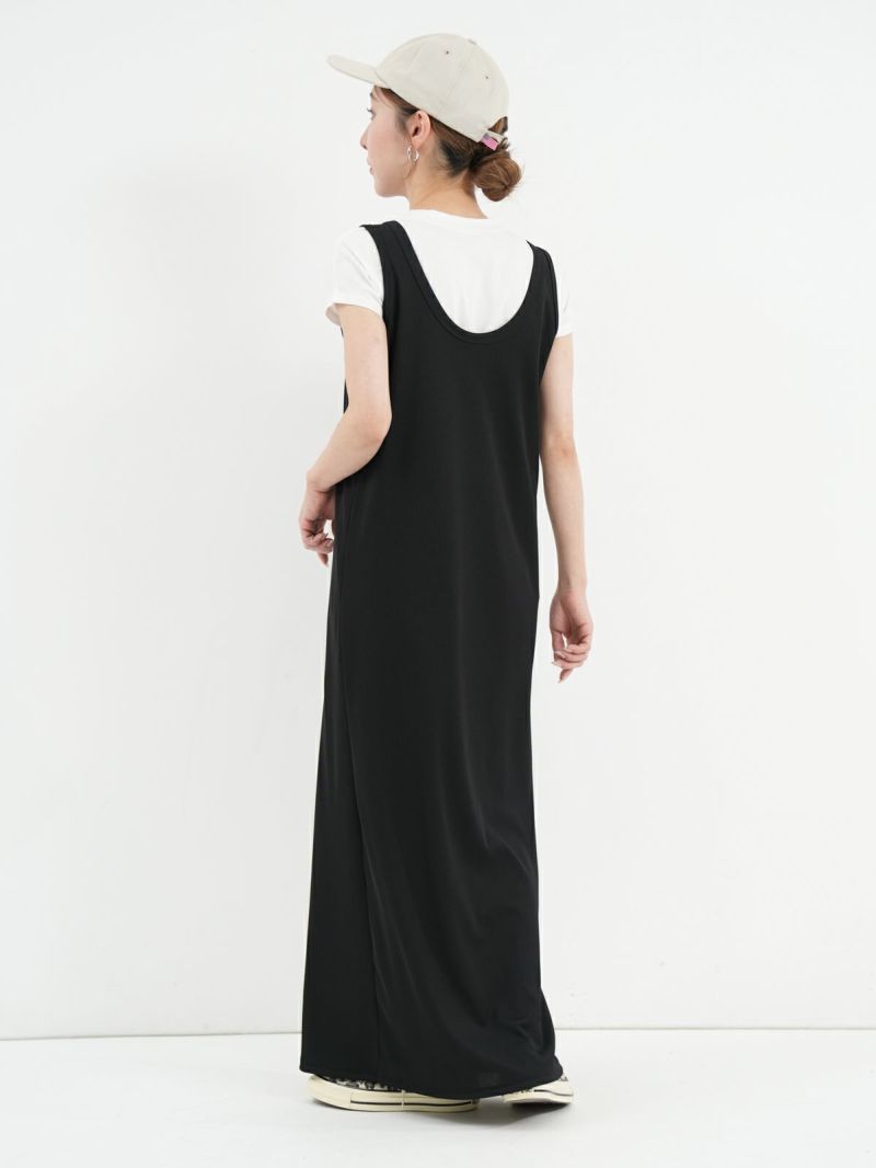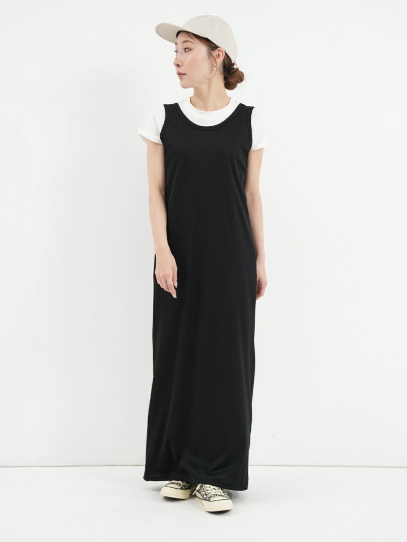 リブ素材のタンクトップワンピース。 程よい光沢と落ち感がありながらもハリ感のある生地を使用。シワになりにくくシルクのような滑らかなタッチとストレッチ性がポイント。1枚ではもちろん、シャツやカットソーを合わせて着ていただくのもおすすめです。