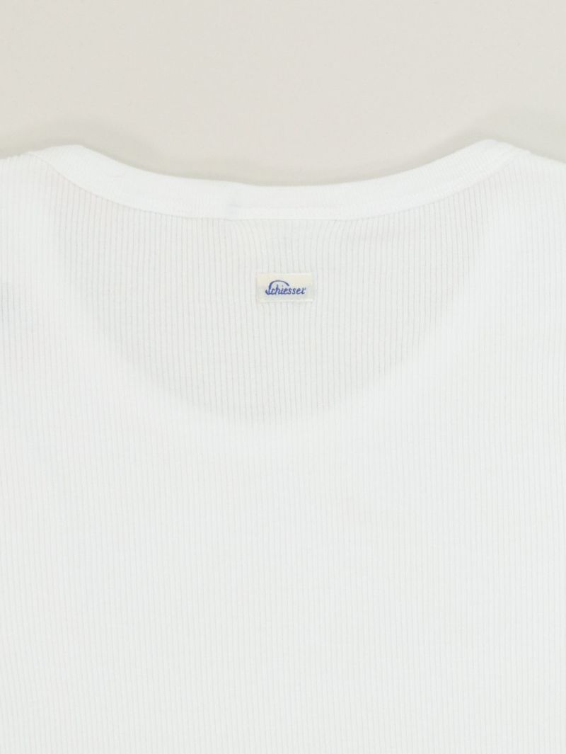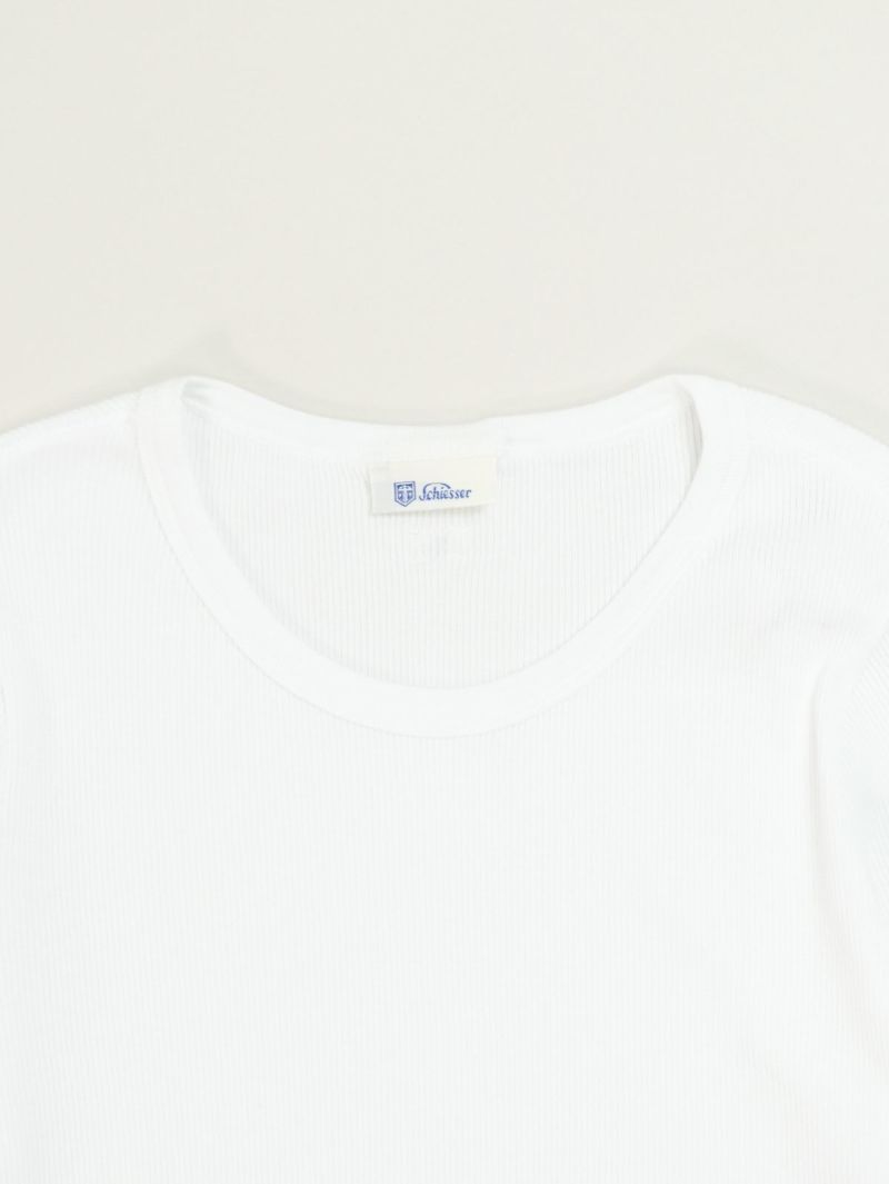 ドイツの老舗ブランドドSCHIESSERのリブTシャツ。 白のTシャツは季節問わずに手に取るアイテム。春は重ね着として、夏は1枚で、秋はベストのインナーに。冬はニットやスウェットの裾や首元からのチラ見え具合が理想的。1枚持っておくと重宝間違いなしのTシャツです。