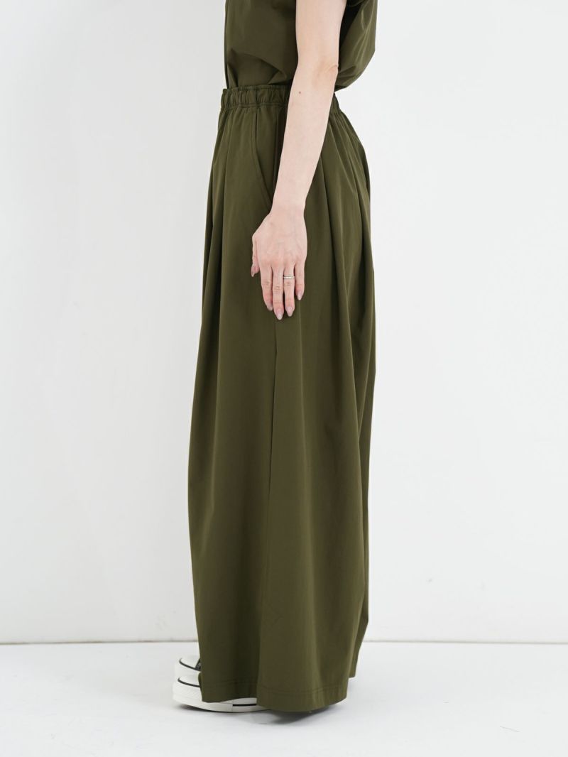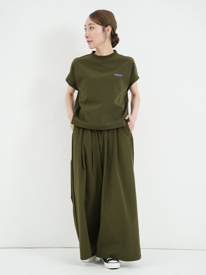 Tシャツはフレンチスリーブですっきりとしたシルエット。 短めの着丈がどんなボトムスに合わせても好バランス。 タックが入っているので動きやすく、気になる腰回りやラインをカバー。 ウエストゴムでイージーに履いていただけます。 スタイリングに迷わないセットアップは、楽ちんでおしゃれ見えしつつ単品使いも可能。 旅行にもぴったりなアイテムで撥水性、4WAYストレッチ、ドライタッチ、UVカット機能も兼ね備えており実用性にも優れています。