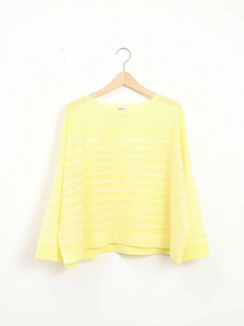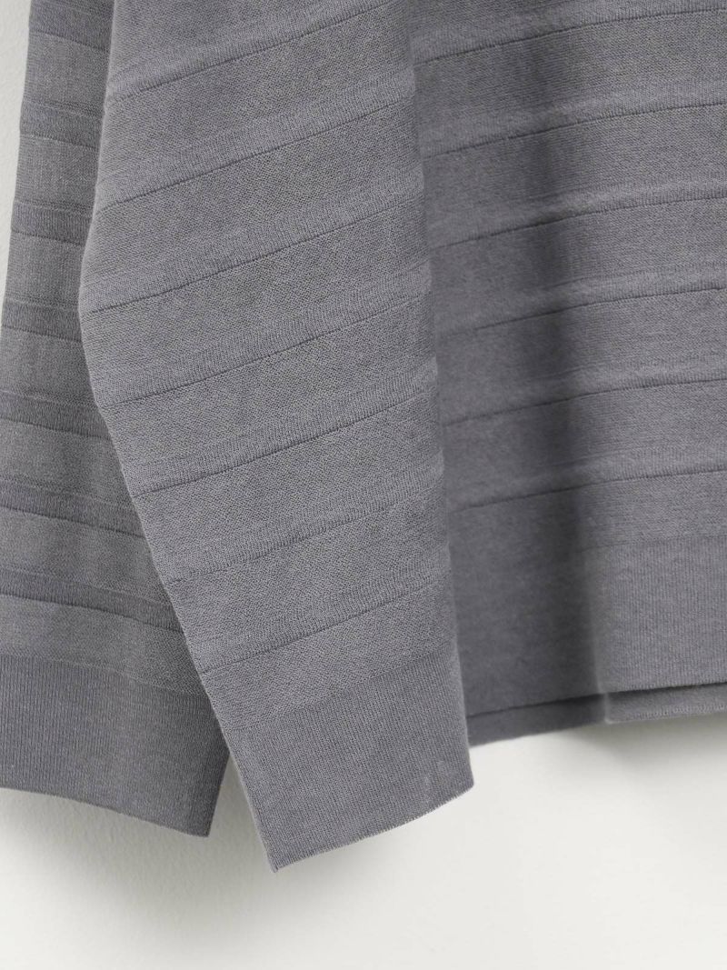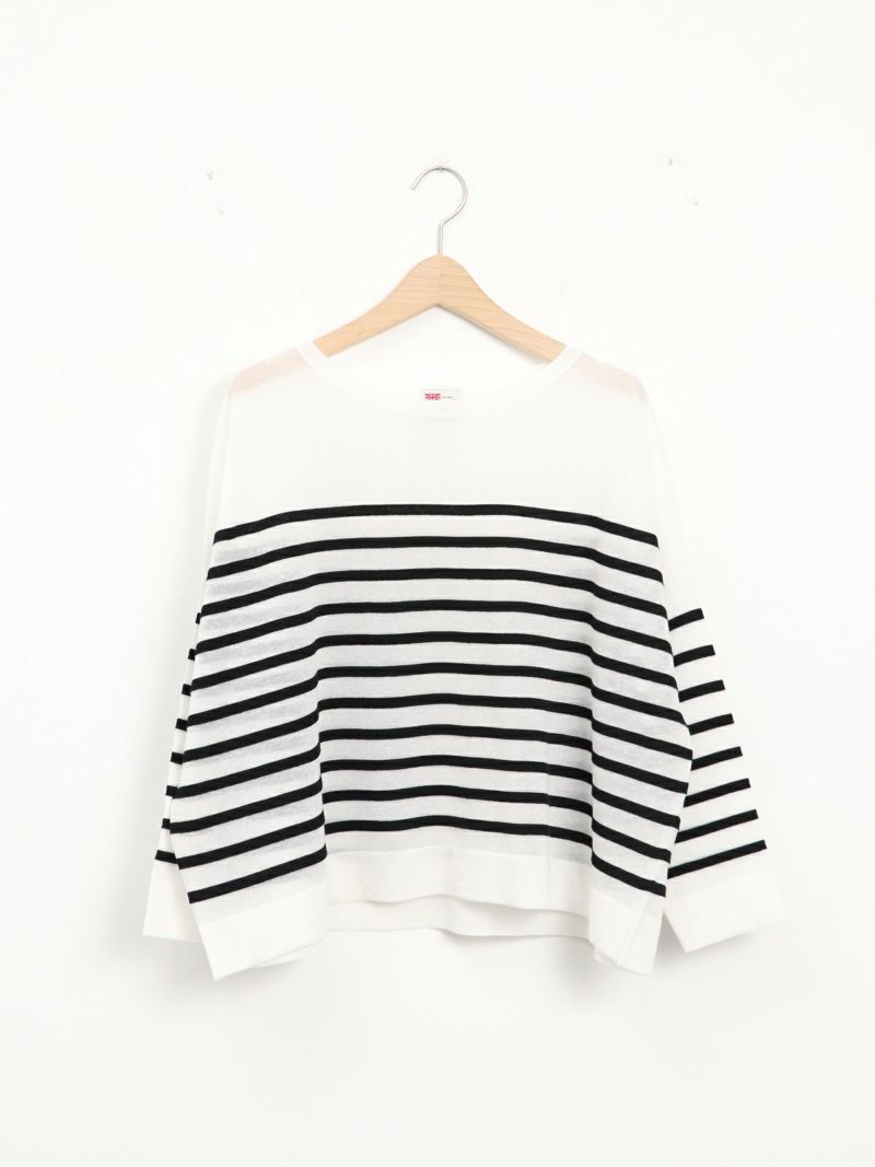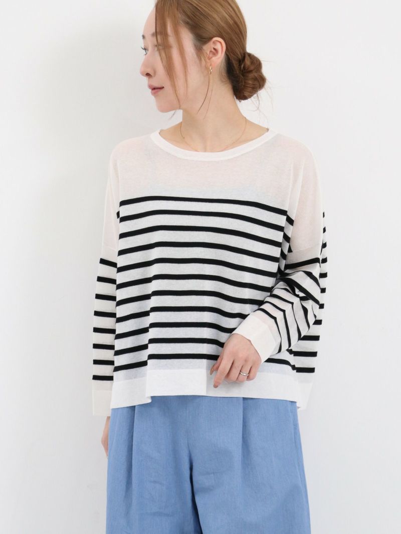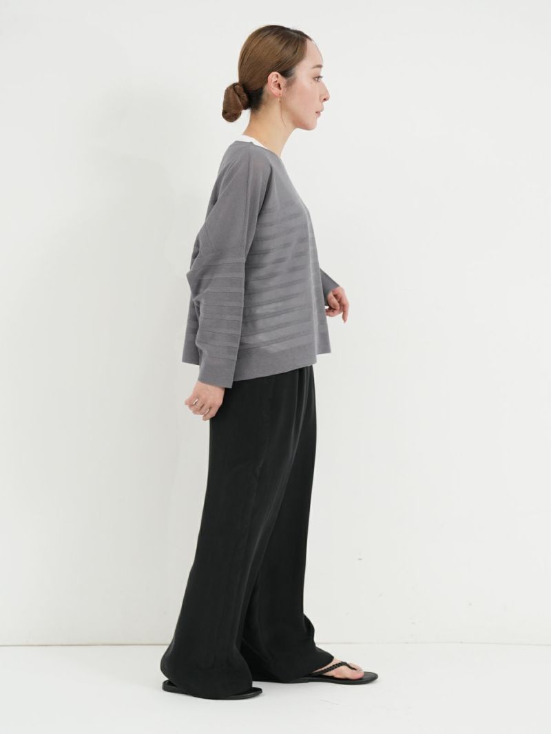 シアーニット素材でドライな手触りが特徴のLYNE KNIT。 ブランド独自のドロップショルダーとゆったりとしたAラインのシルエットが魅力です。コンパクトな丈感でパンツにもスカートにも合わせやすく着回し力抜群のアイテムです。