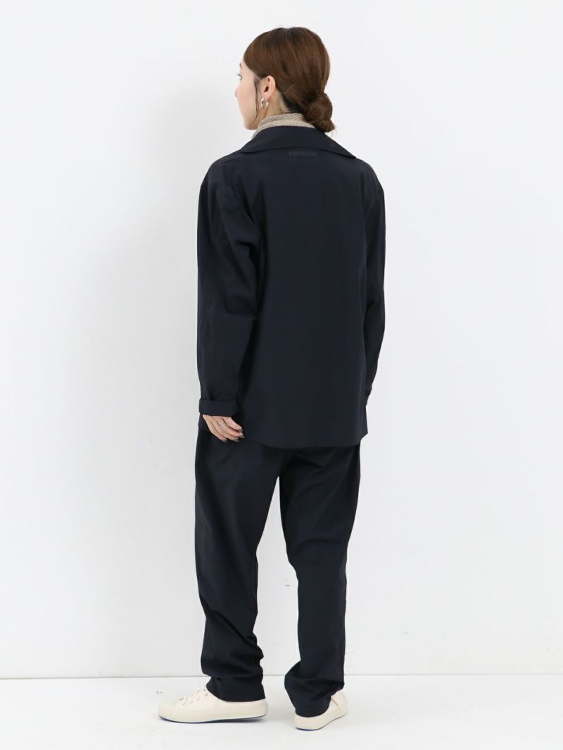 撥水加工が施されたテクニカルな素材を使用。どんなシーンにもぴったりのデザインでありながら、レインウェアとしても活躍。同素材のジャケットとセットアップでのスタリングもおすすめです。