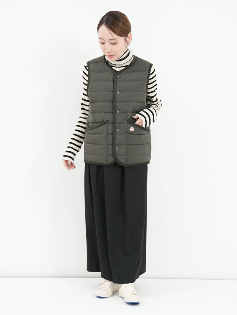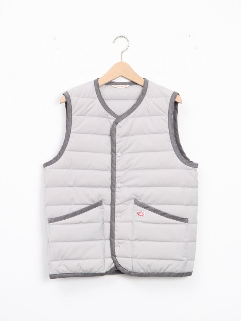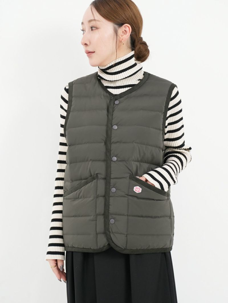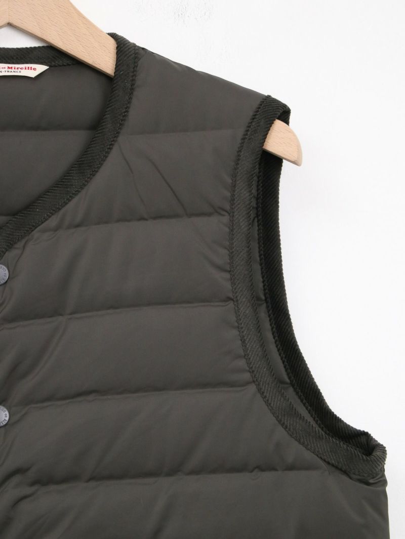 コーデュロイ素材のパイピングがポイントです。キルティング部分はプレス加工になっている為、中のダウンが出ることなく着用できます。インナーベストとしてコートなどとレイヤードしてもおすすめです。