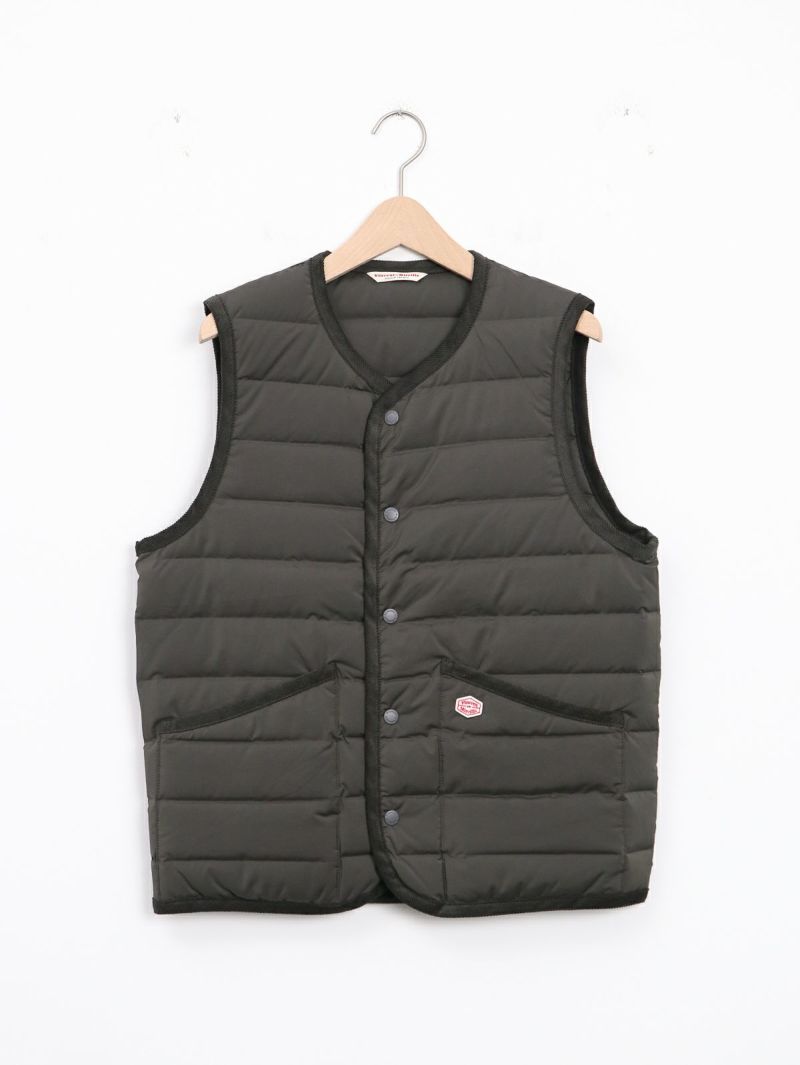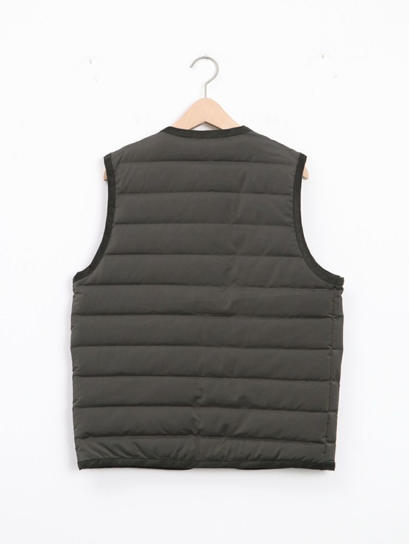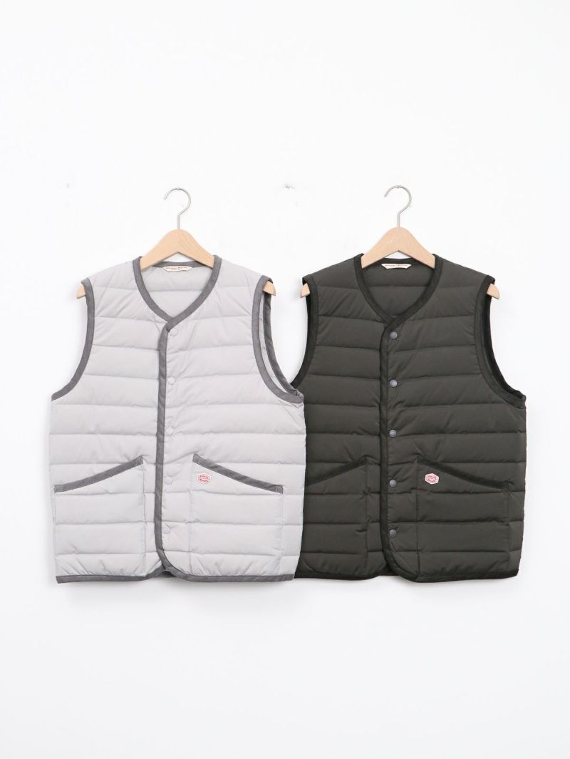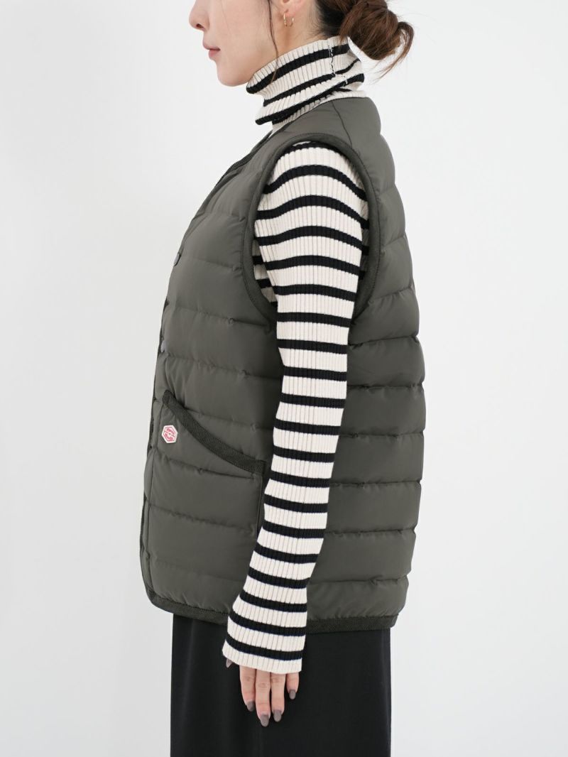コーデュロイ素材のパイピングがポイントです。キルティング部分はプレス加工になっている為、中のダウンが出ることなく着用できます。インナーベストとしてコートなどとレイヤードしてもおすすめです。