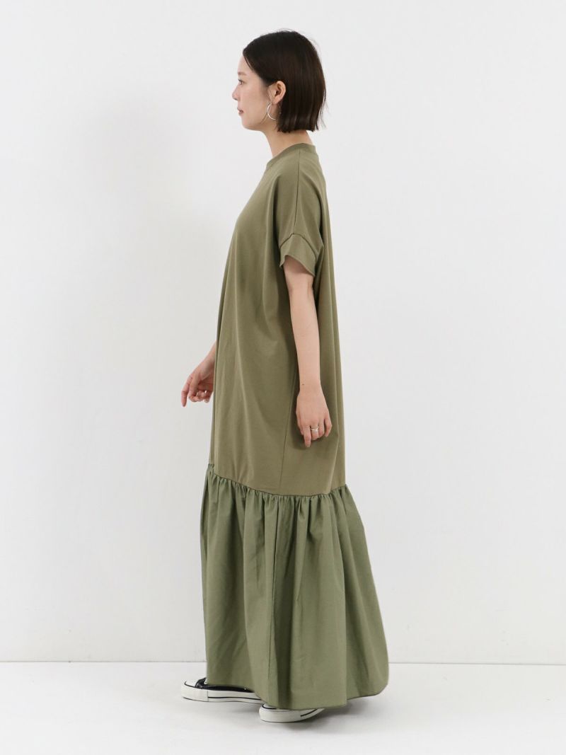 裾のフレアラインが特徴のワンピース。 身頃はやや光沢感がある滑らかな肌触りのカットソー生地を使用し、裾のフレア部分はブラウス生地を使用。素材の違う生地がドッキングした1枚で着映えするワンピースです。