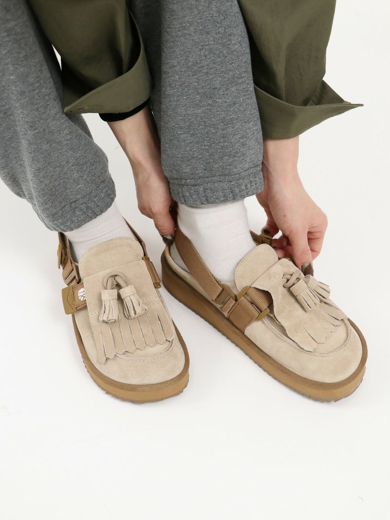 秋冬ムード漂う、SHAKAの新作ミュールシューズ。 リアルスエード×着脱可能なキルトタッセルでトラッドな印象に仕上げた一足です。ストラップとタッセルは取り外し可能で、気分やスタイルに合わせて3WAYで楽しめる万能デザイン。軽量でグリップ力のある新ソールを採用し、安定感のある履き心地も魅力。カジュアルにもドレッシーにも馴染む、秋冬の足元をアップデートする一足です。
