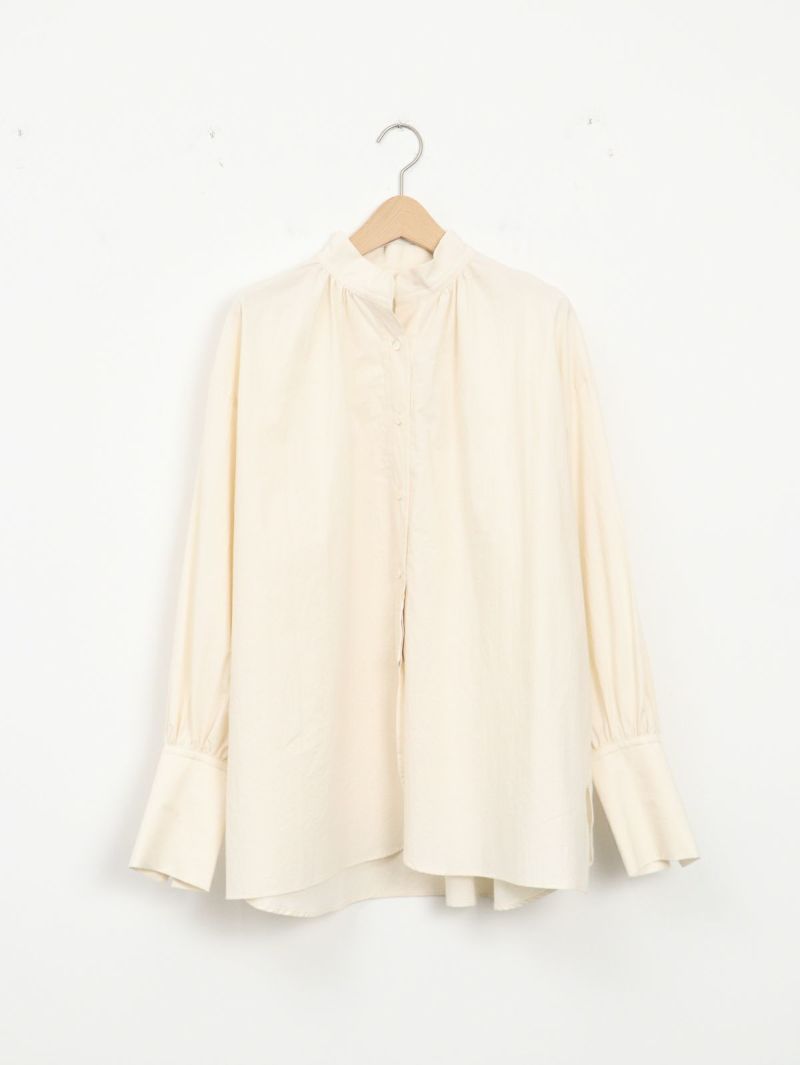 くったりと柔らかなコットン100%素材が心地よい、大人のためのスタンドカラーシャツ。 首周りに施した繊細なギャザーが、さりげないアクセントとなり、一枚で着るだけで顔周りを華やかに見せてくれます。程よくゆとりのあるサイズ感と、ニュアンスが出る袖口のデザインが、シンプルながらもこなれた雰囲気を演出します。