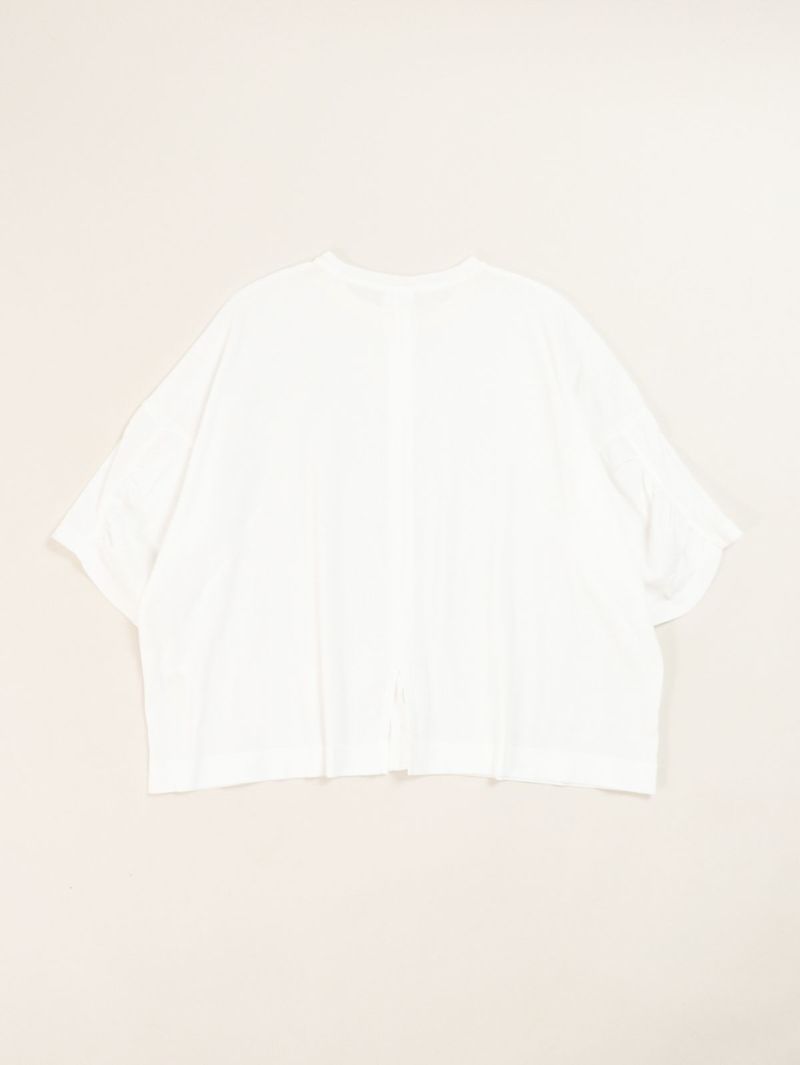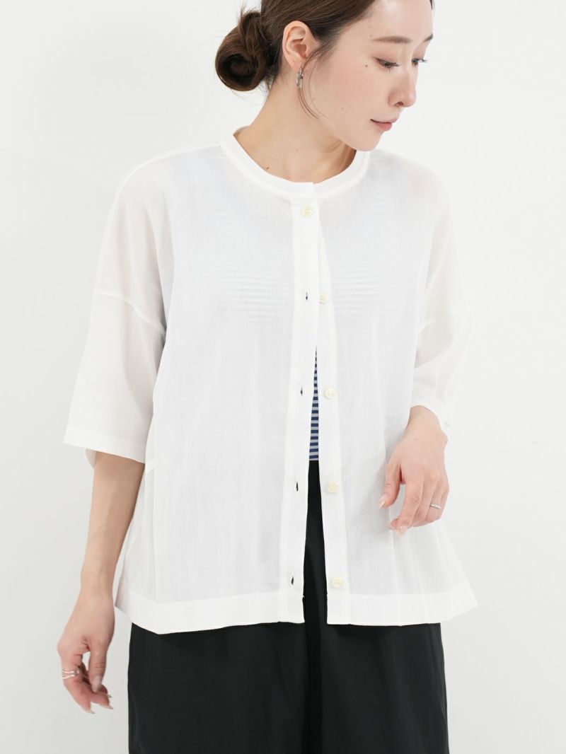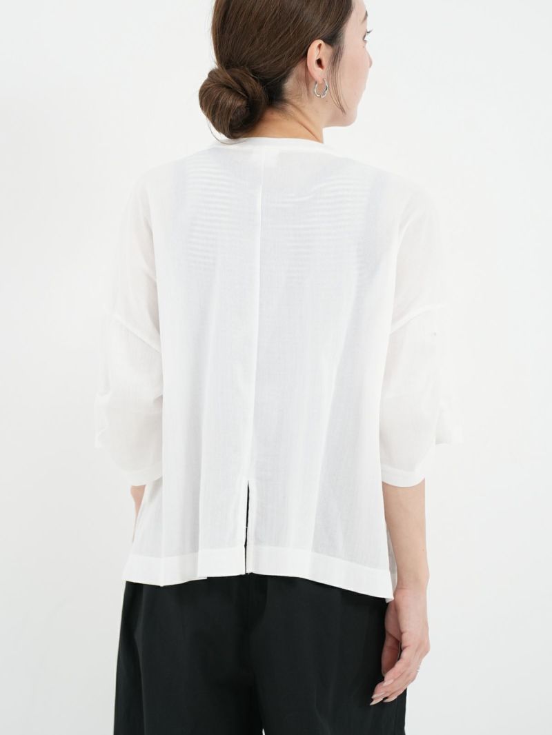綿100%素材でガーゼのような肌触りのシャツ。 袖はギャザーが入り、肘あたりまで隠れるデザイン。シャツでありながらTシャツのような着やすさも兼ね備え、一枚着でも前を開けて羽織としても活躍します。