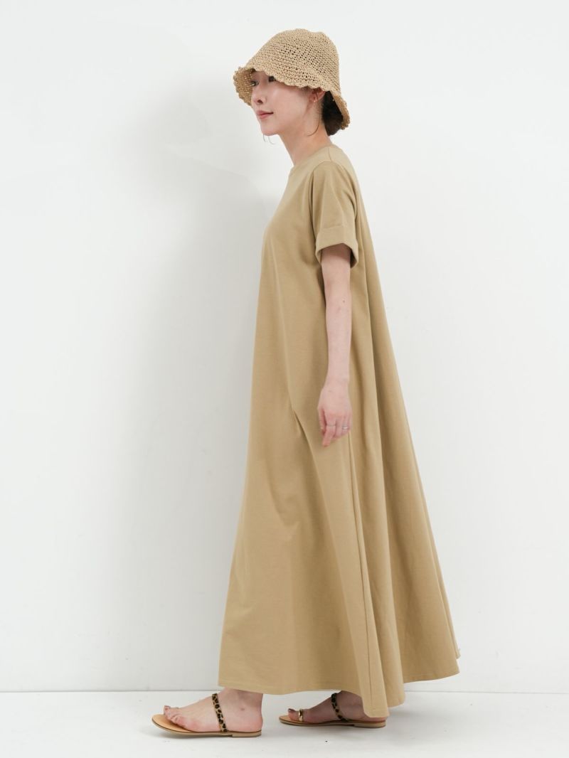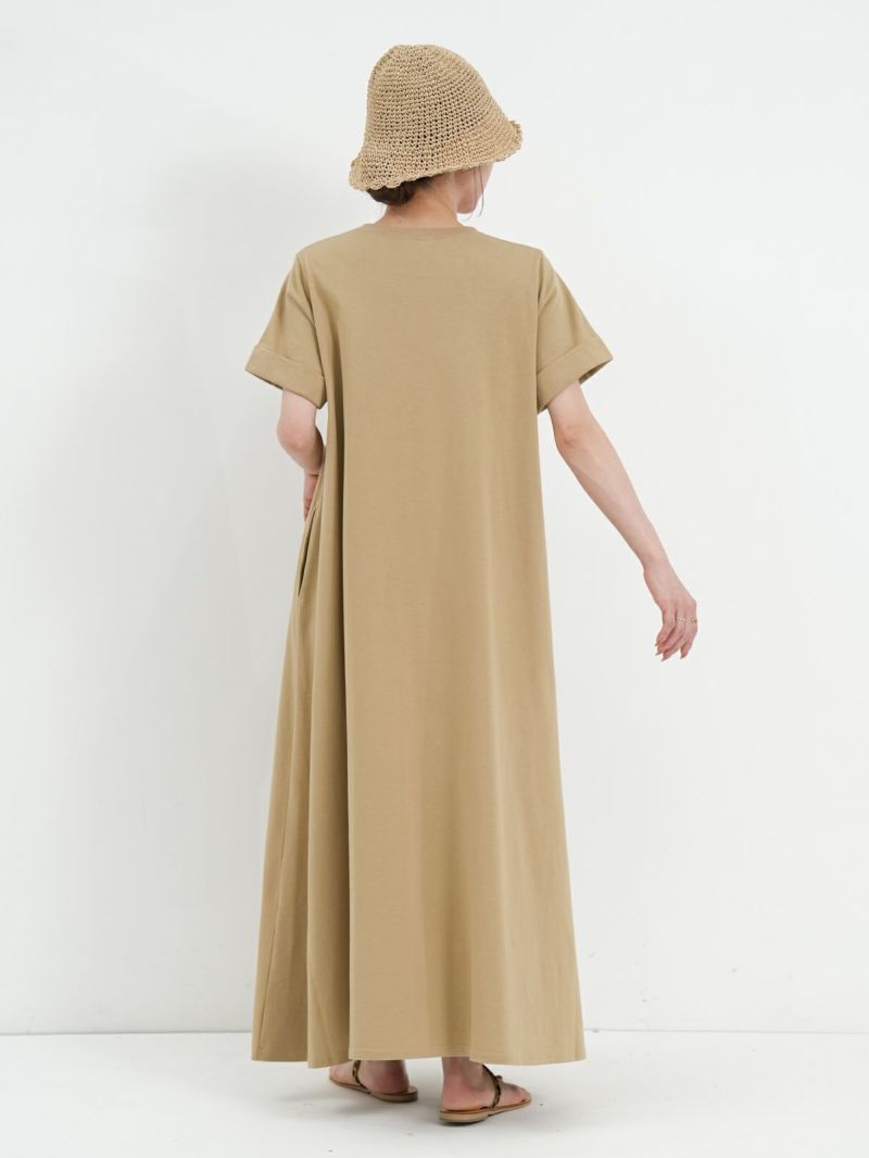 国内生地/国内縫製で品質に拘った1着。 足首まで有るロング丈のワンピースなので存在感があり、1枚で様になります。シンプルながら袖の折り返しがちょっとしたアクセントに◎しっかりした生地感なので、裾にかけてふわっと広がるきれいなAラインシルエットが実感できます。両サイドには便利なポケット付きなのも嬉しいポイント。
