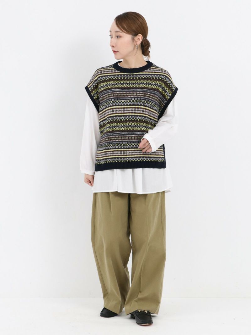 やわらかな風合いのコットン糸を使用したベスト。 前身頃は明るい配色がポイントのジャガード柄、後身頃は畦編みと前後で編地の違う1枚です。インナー次第で秋口から冬まで長く着用出来ます。