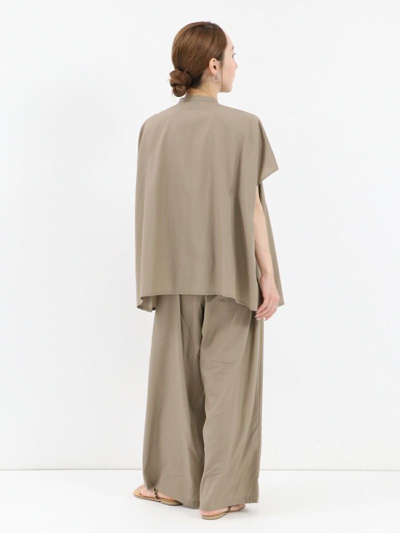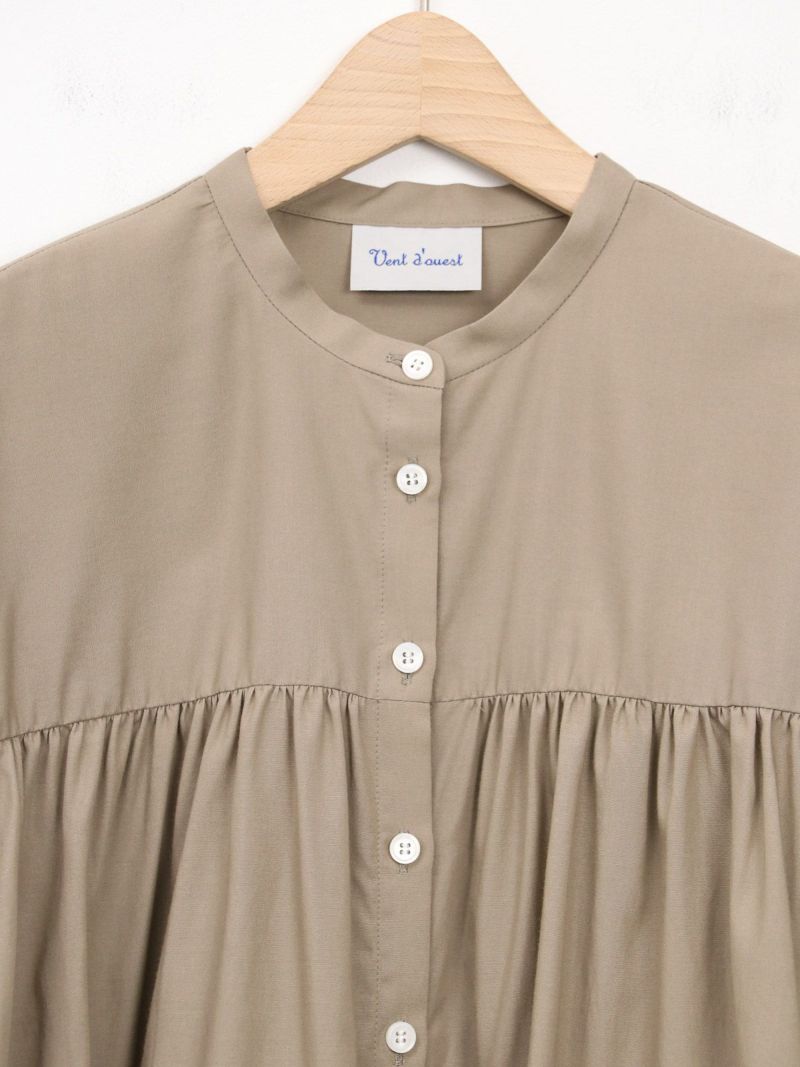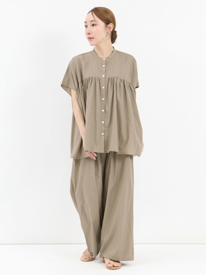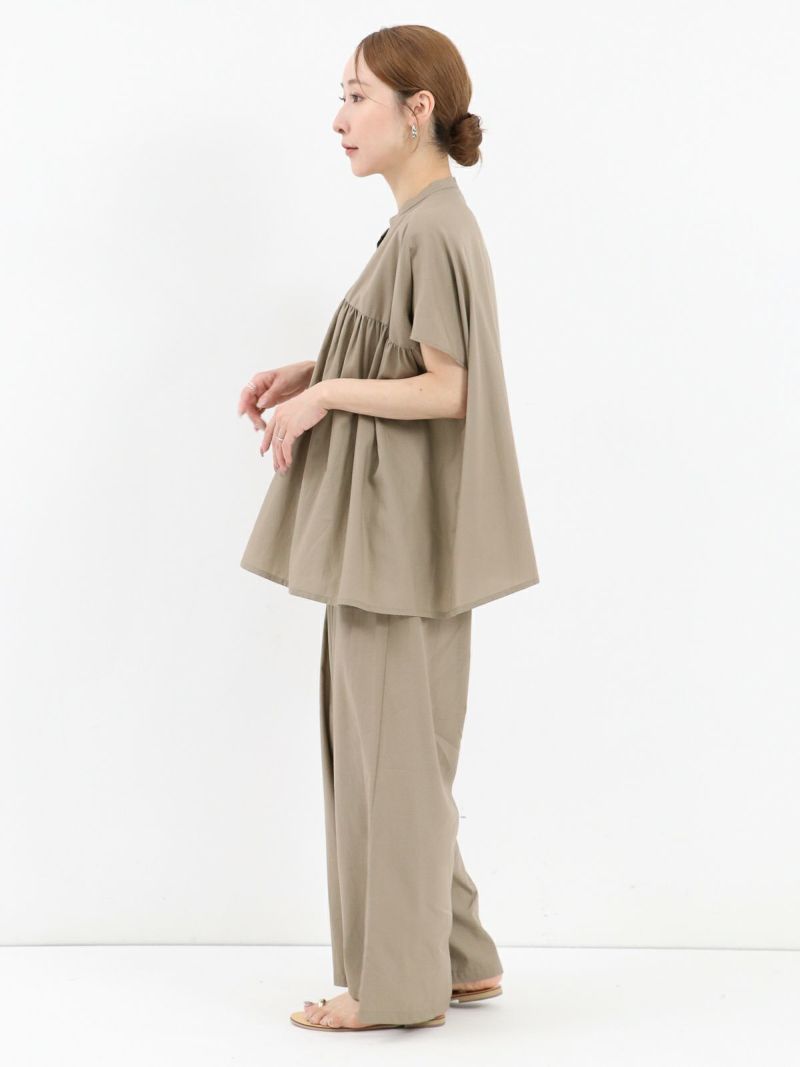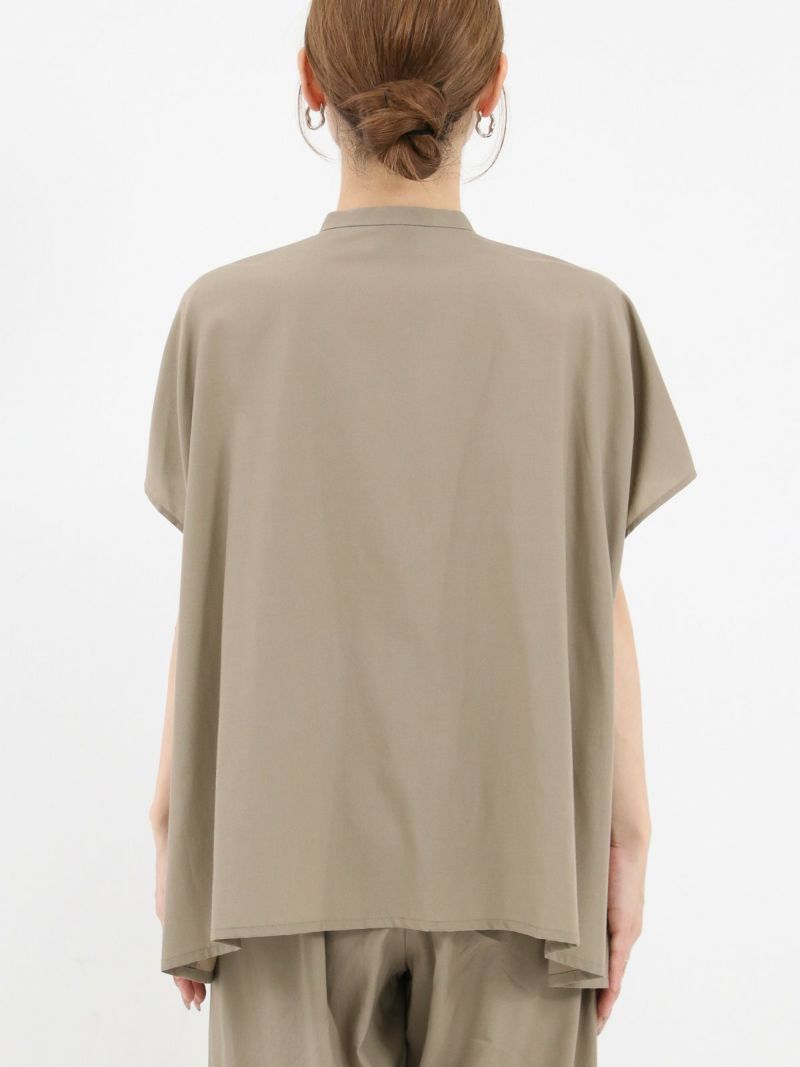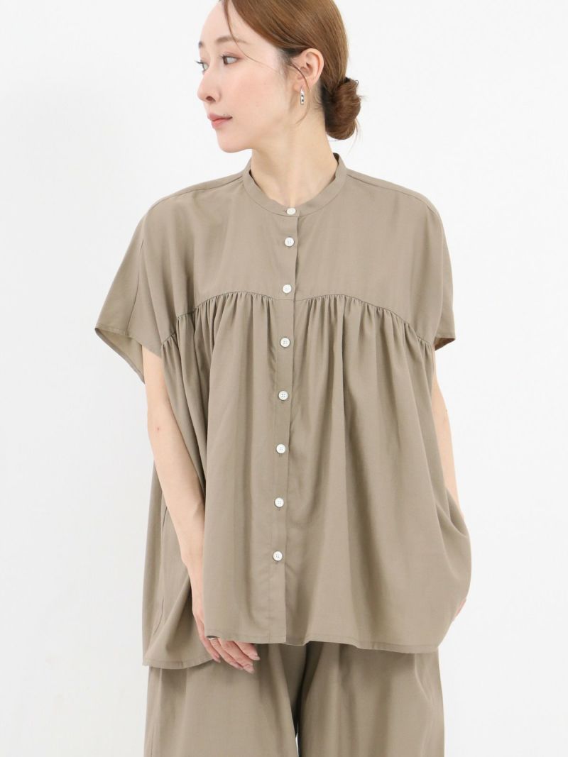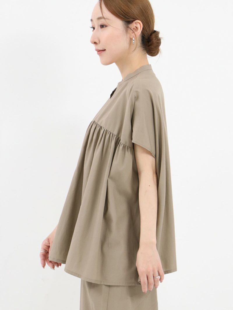 胸下の切り替えからギャザーでふんわりと広がるブラウス。 首元はバンドカラーですっきり見え。フレンチスリーブですが身幅が広いためしっかりと袖が落ちてくれて羽織なしでも着やすいシルエットです。