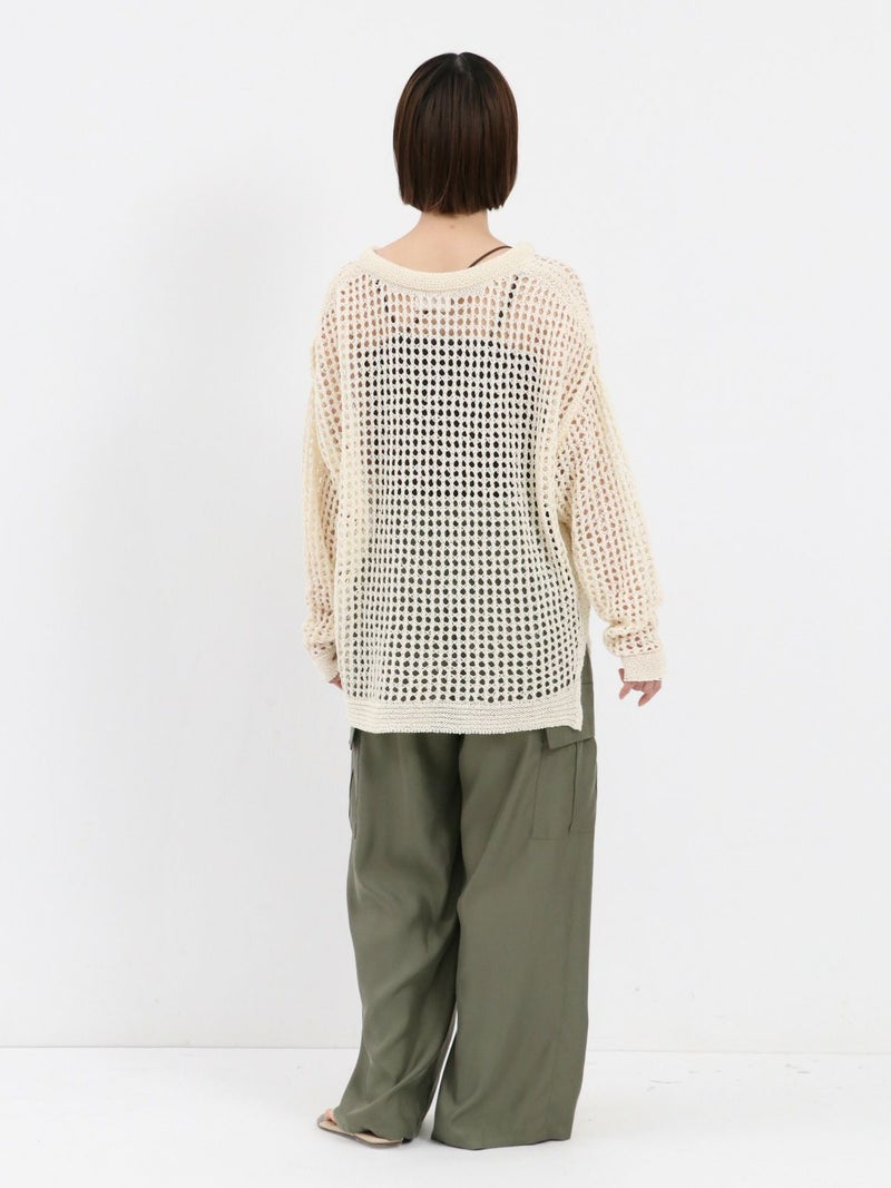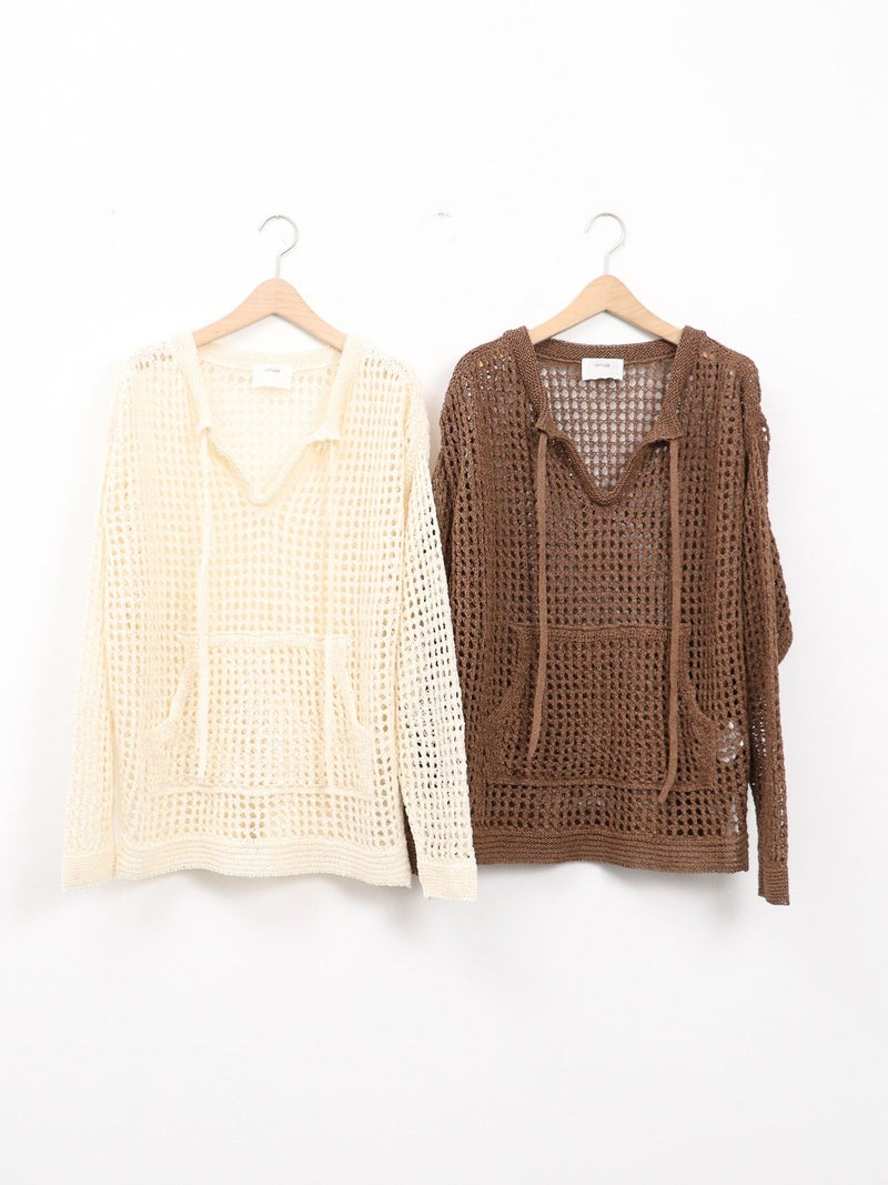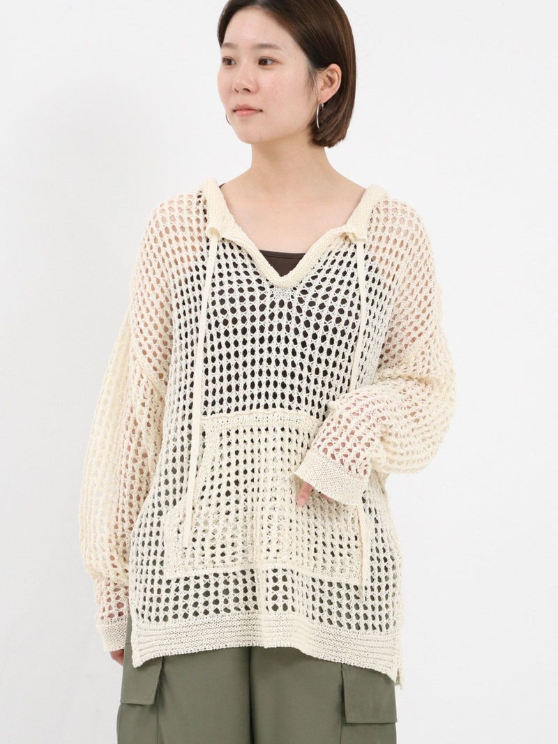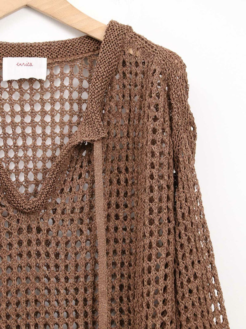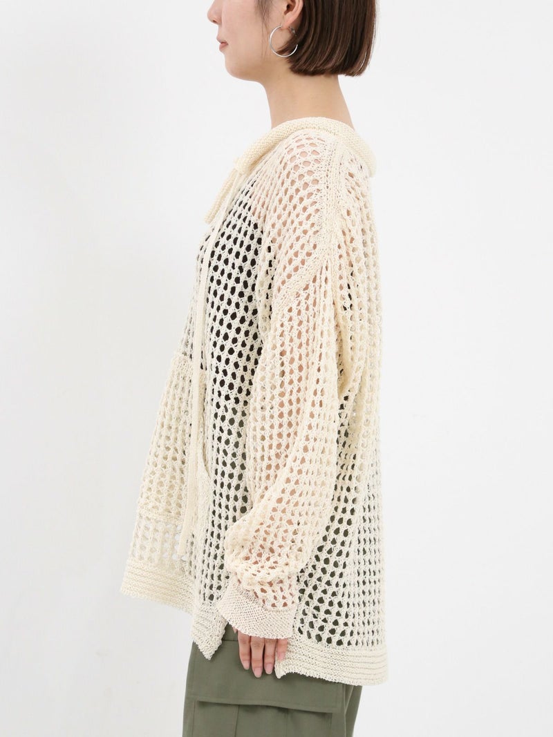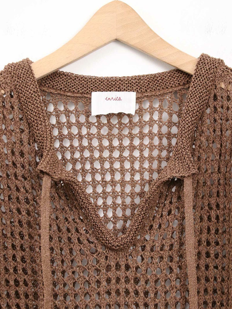 enricaのメッシュニットプルオーバー。 コード付きのスキッパーデザインとざっくりと編まれた透かし編みがトレンド感をプラス。和紙混糸を使用し、素材特有のシャリ感があるため涼しく着ていただけます。キャミソールやタンクトップを合わせたヘルシーな肌見せスタイルがおすすめです。