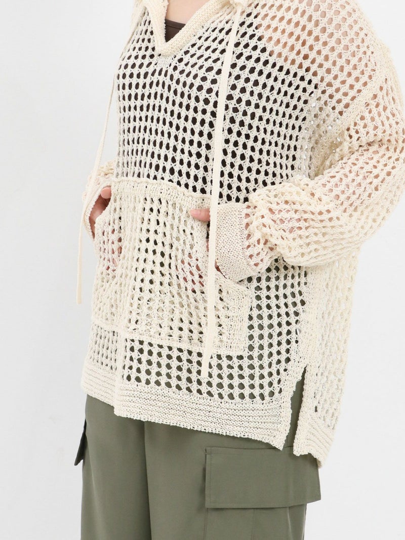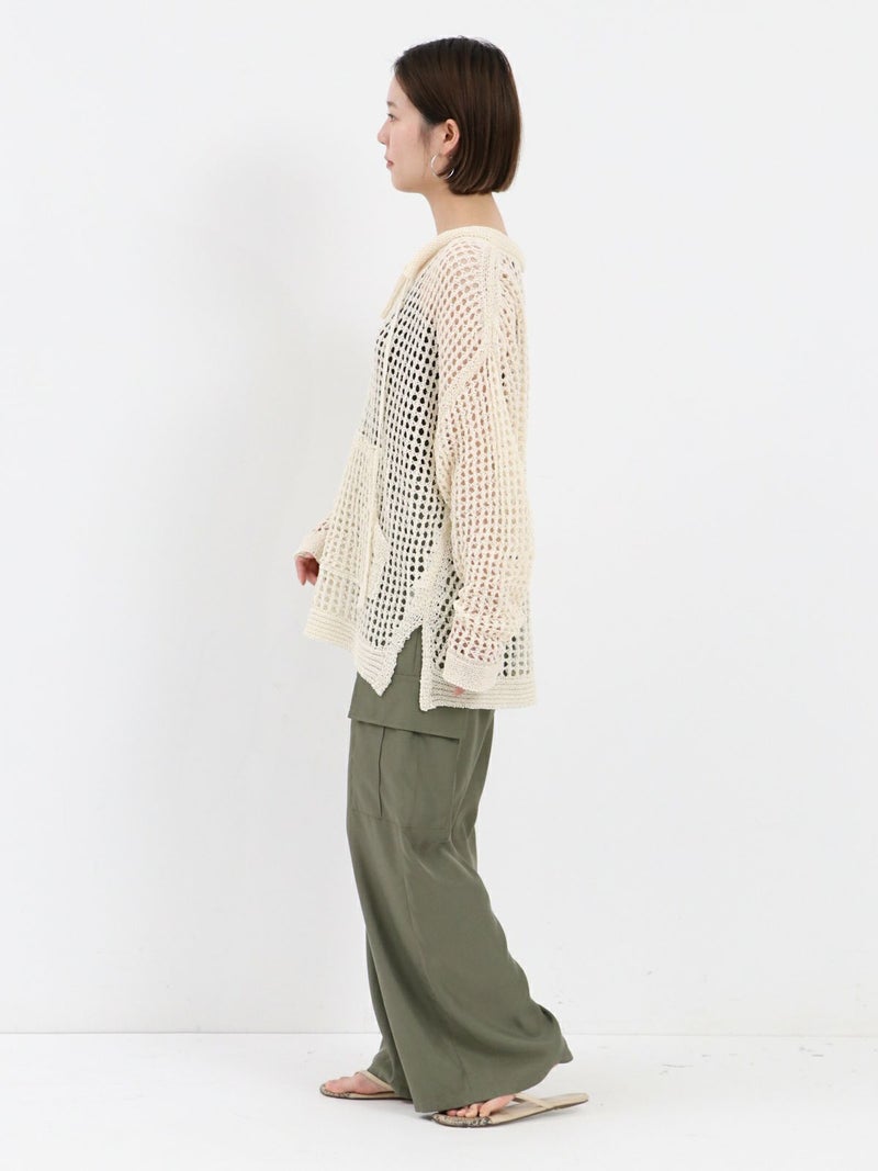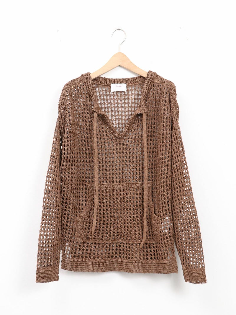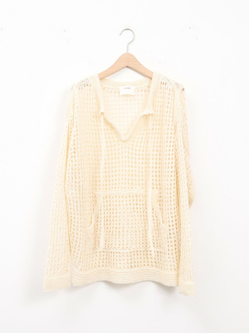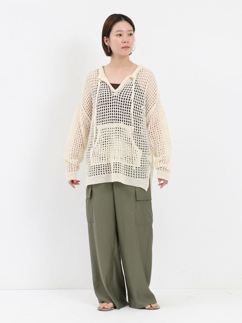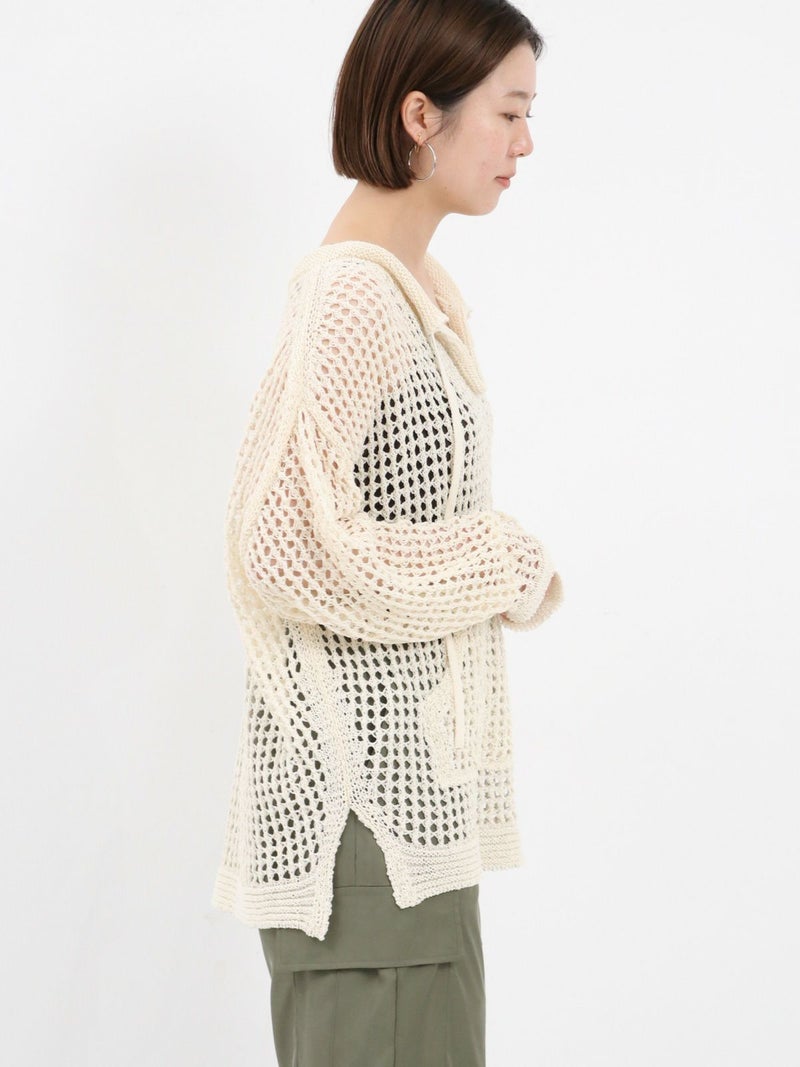 enricaのメッシュニットプルオーバー。 コード付きのスキッパーデザインとざっくりと編まれた透かし編みがトレンド感をプラス。和紙混糸を使用し、素材特有のシャリ感があるため涼しく着ていただけます。キャミソールやタンクトップを合わせたヘルシーな肌見せスタイルがおすすめです。