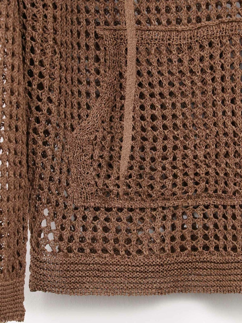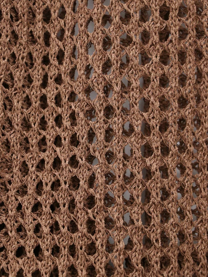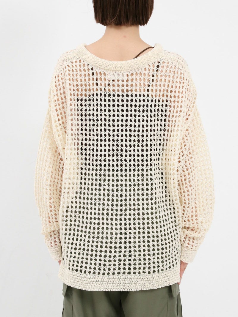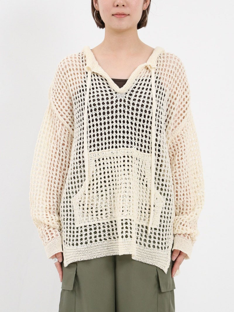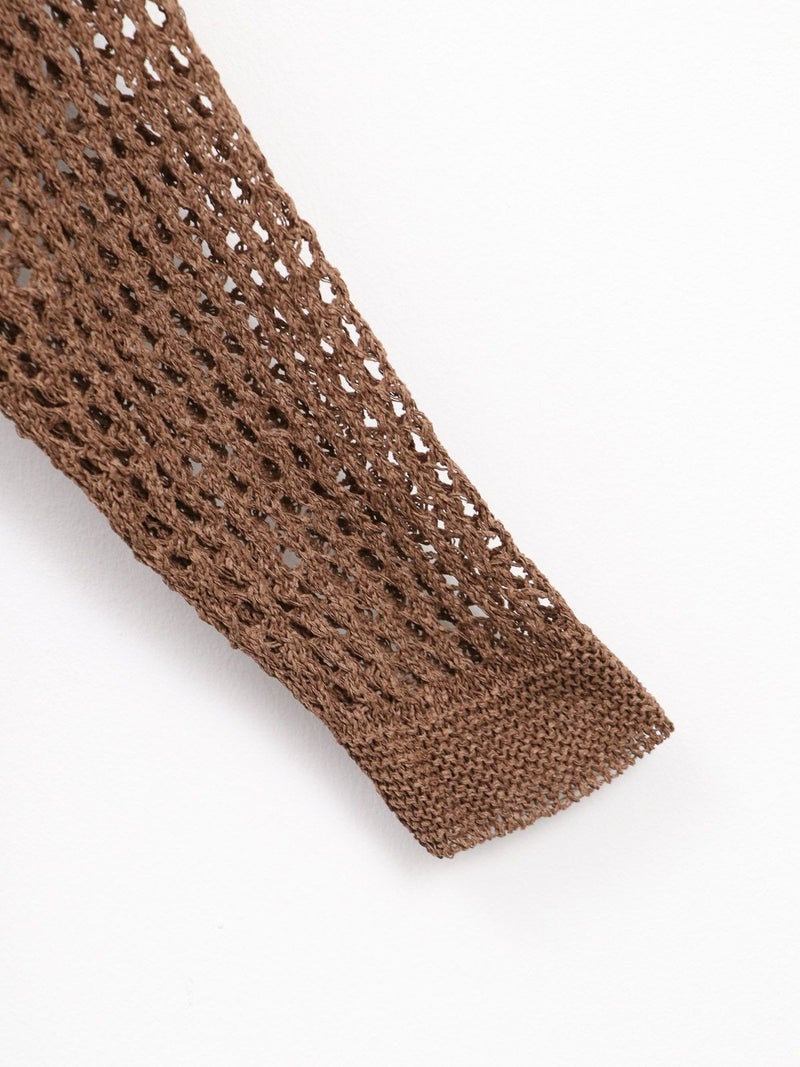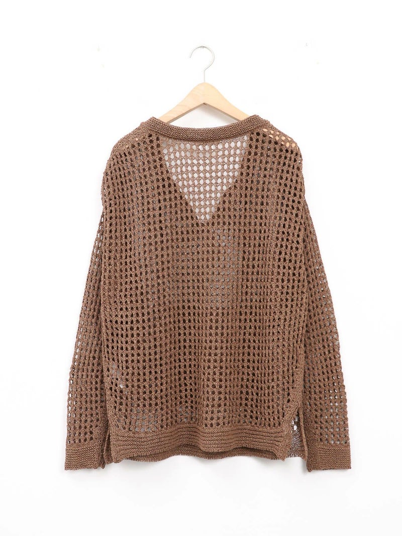 enricaのメッシュニットプルオーバー。 コード付きのスキッパーデザインとざっくりと編まれた透かし編みがトレンド感をプラス。和紙混糸を使用し、素材特有のシャリ感があるため涼しく着ていただけます。キャミソールやタンクトップを合わせたヘルシーな肌見せスタイルがおすすめです。