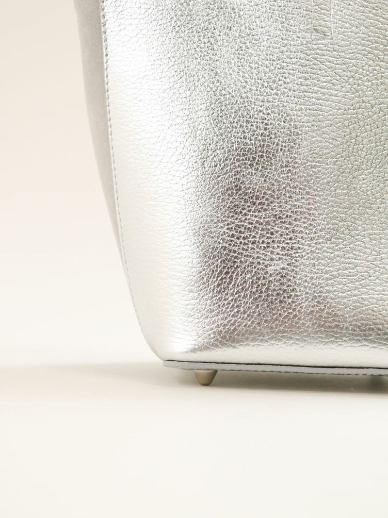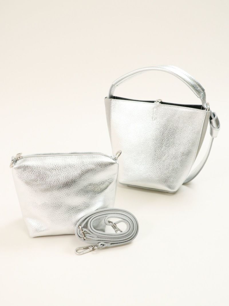 上品な艶とシボ感のあるレザーを使用しており、サイドに垂らしてぐるりと結んだハンドルや、スエードの切り替えがアクセント。着脱可能なショルダーストラップ付きで斜め掛けもでき、サイドのボタンで形を変えられるのも◎ストラップを取り付けてポシェットにもなる同素材のポーチ付きで幅広く活躍するアイテムです。
