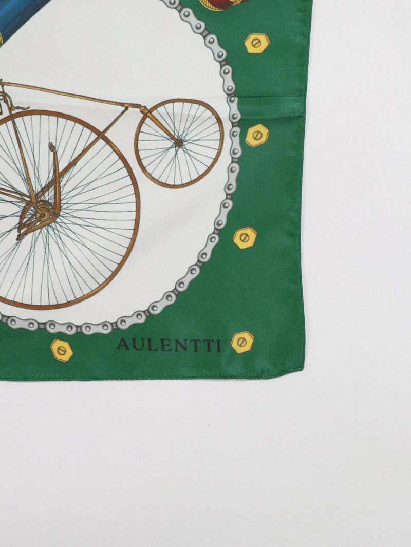 自転車をモチーフにしたクラシック柄の大判スカーフ。 ポリエステル100%ながらも高級感のある滑らかな肌触り。首元に巻いたり、バッグに取り付けたりと様々なシーンやコーディネートのアクセントに◎