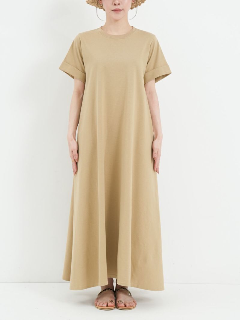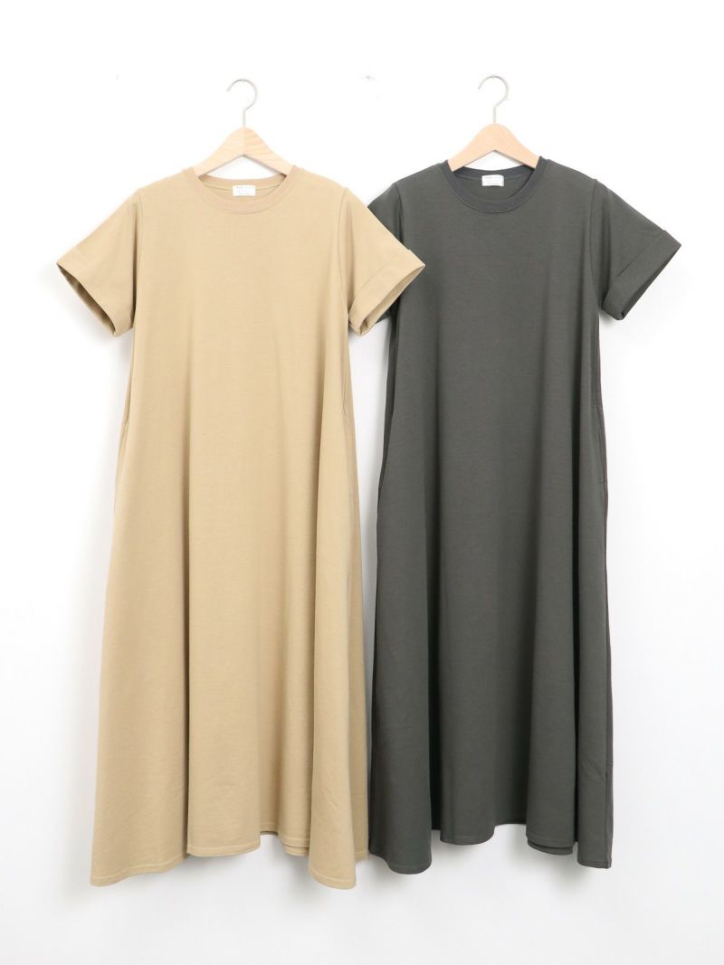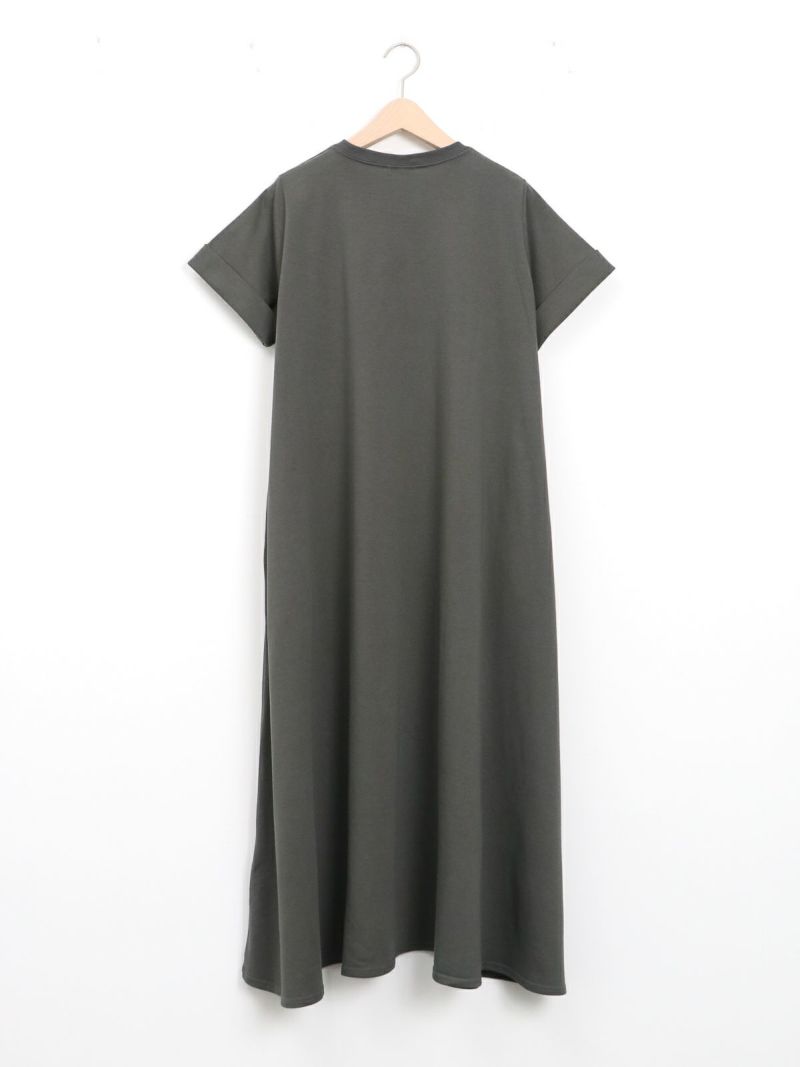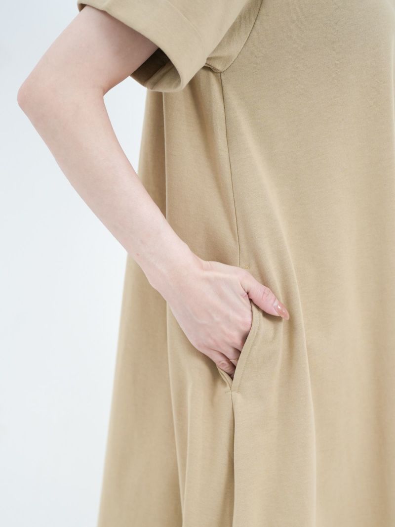 国内生地/国内縫製で品質に拘った1着。 足首まで有るロング丈のワンピースなので存在感があり、1枚で様になります。シンプルながら袖の折り返しがちょっとしたアクセントに◎しっかりした生地感なので、裾にかけてふわっと広がるきれいなAラインシルエットが実感できます。両サイドには便利なポケット付きなのも嬉しいポイント。