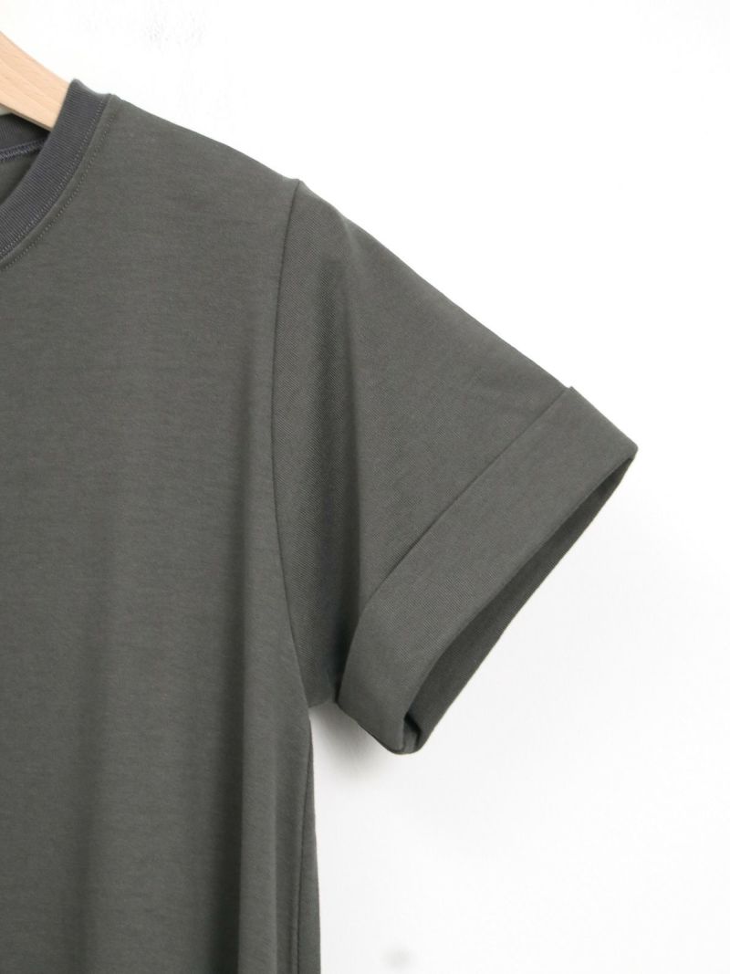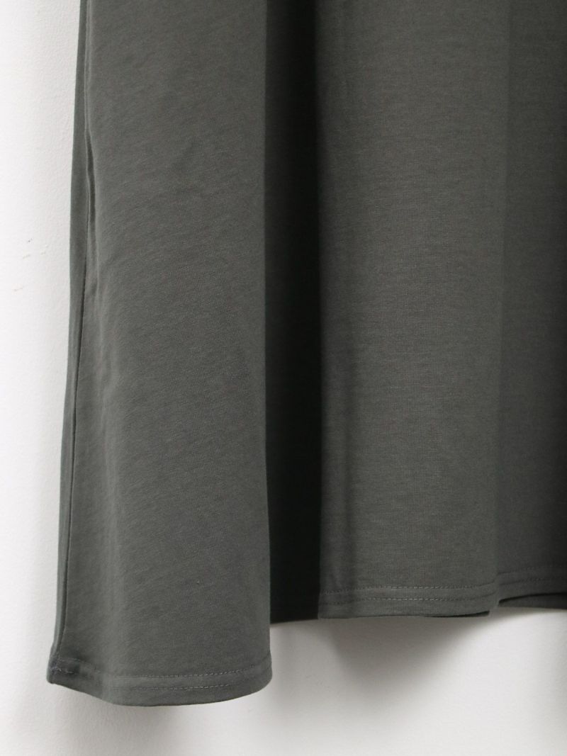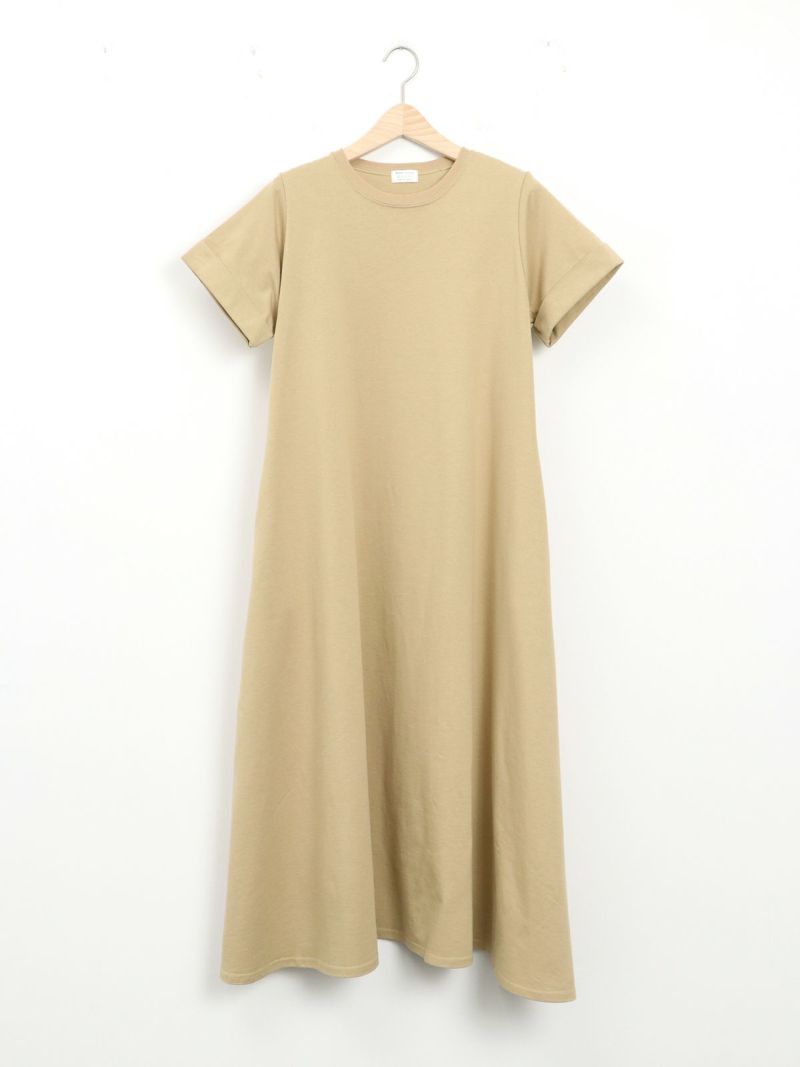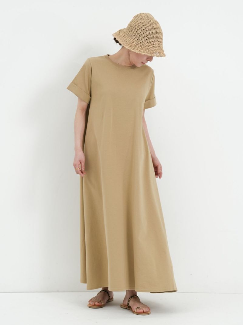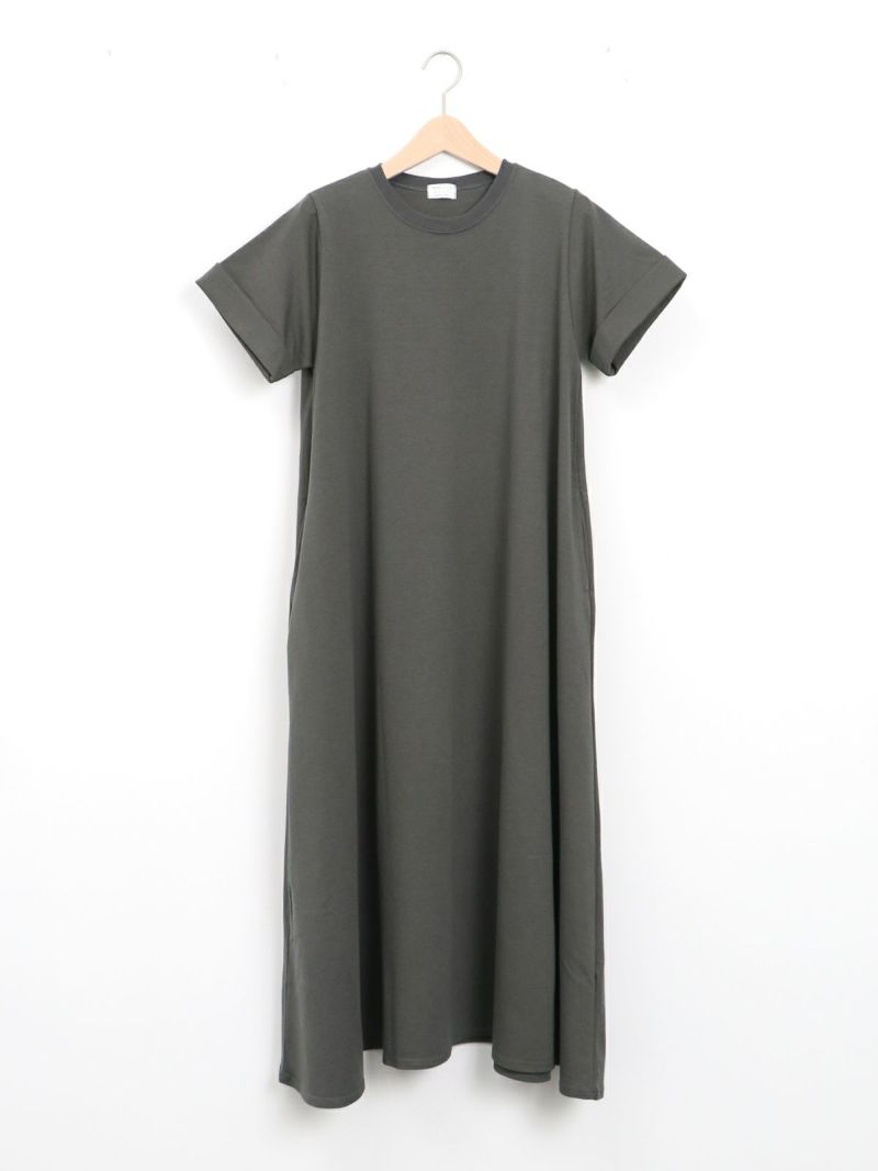 国内生地/国内縫製で品質に拘った1着。 足首まで有るロング丈のワンピースなので存在感があり、1枚で様になります。シンプルながら袖の折り返しがちょっとしたアクセントに◎しっかりした生地感なので、裾にかけてふわっと広がるきれいなAラインシルエットが実感できます。両サイドには便利なポケット付きなのも嬉しいポイント。