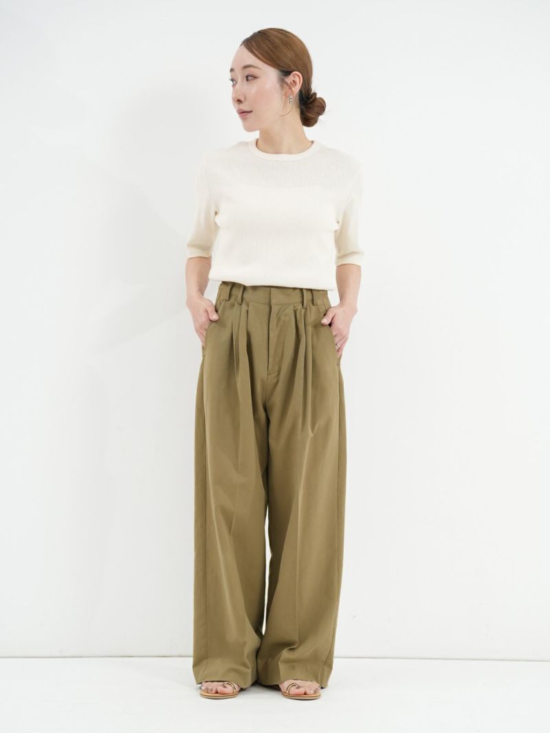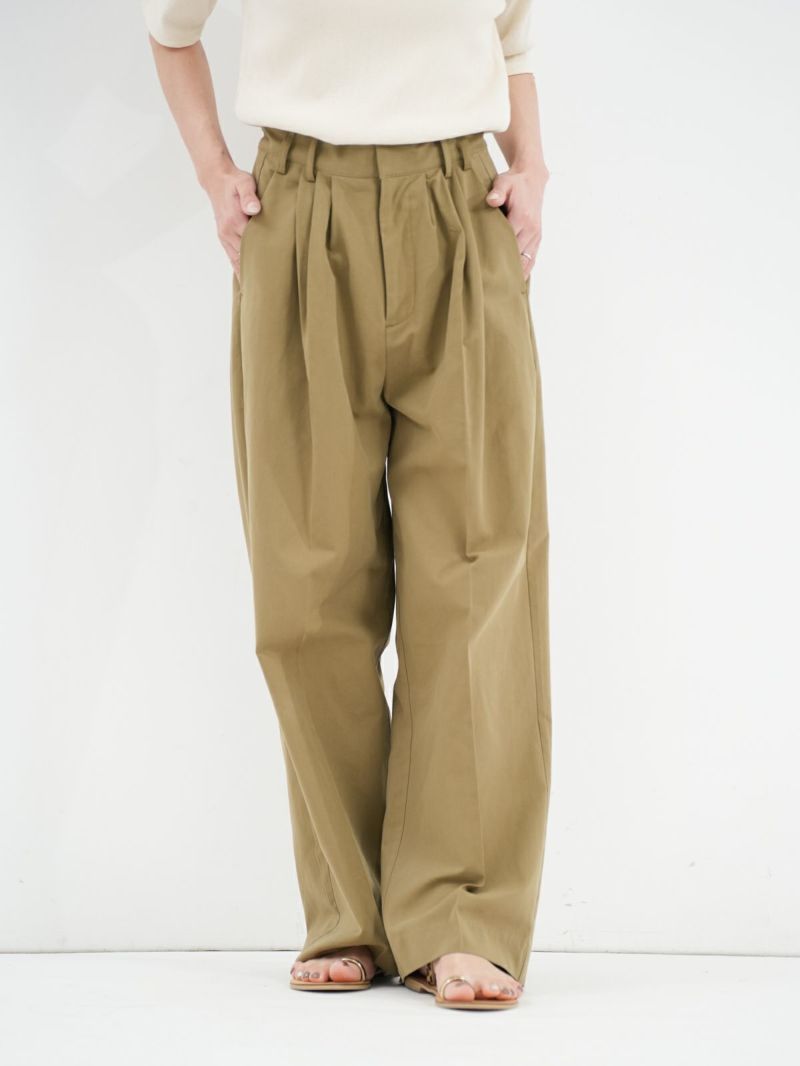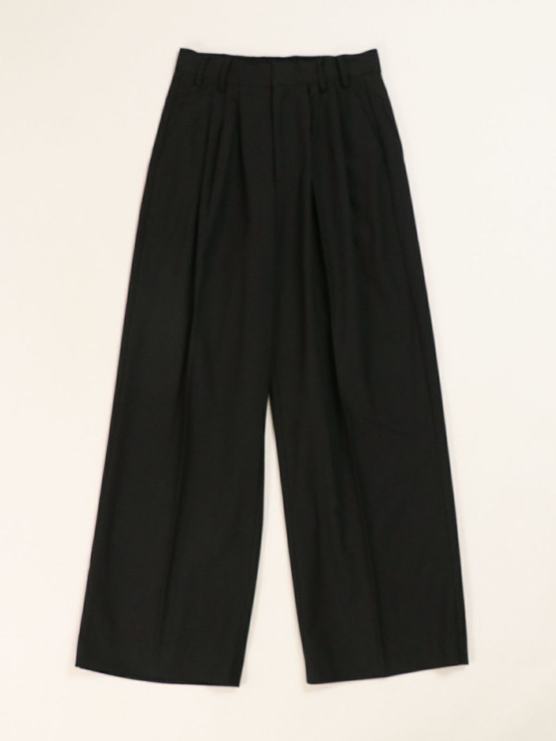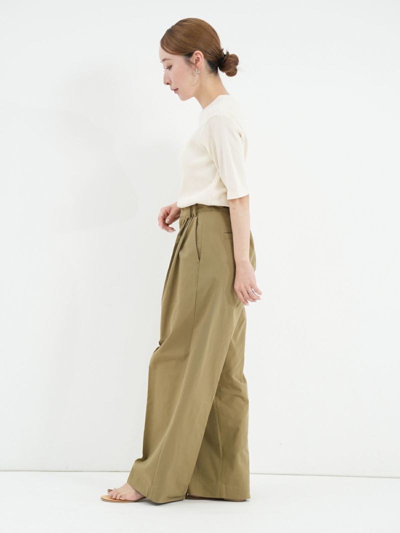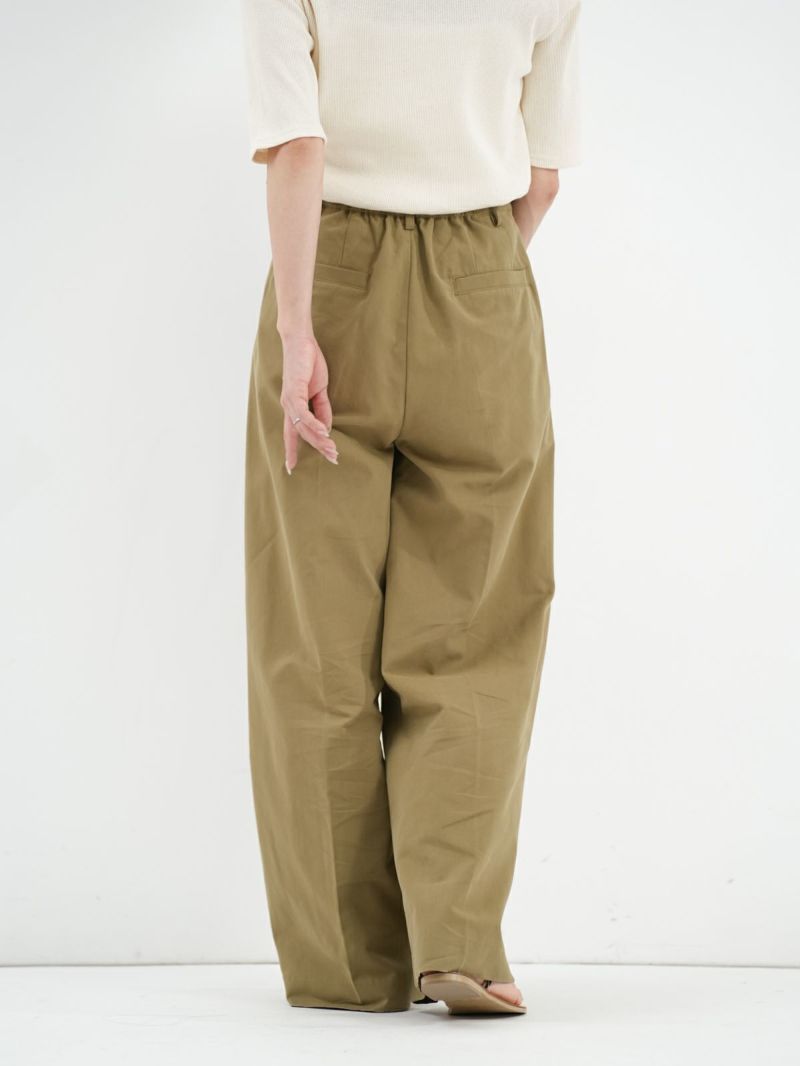 フロントにタックを入れ、コクーンシルエットを出した立体的なパンツ。 ウエストは後ろゴム仕様で、内側にはコードがついているので調整が可能です。存在感のあるワイドシルエットは、シンプルなトップスとのコーデがおすすめです。