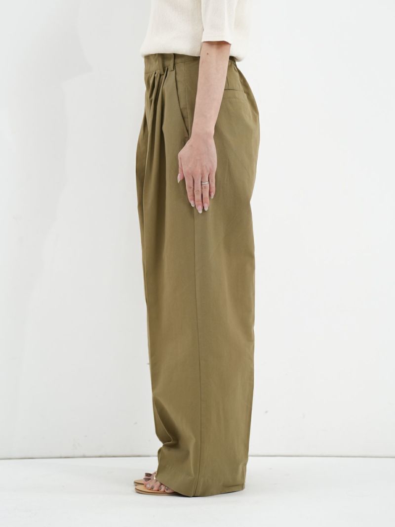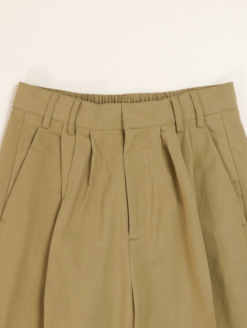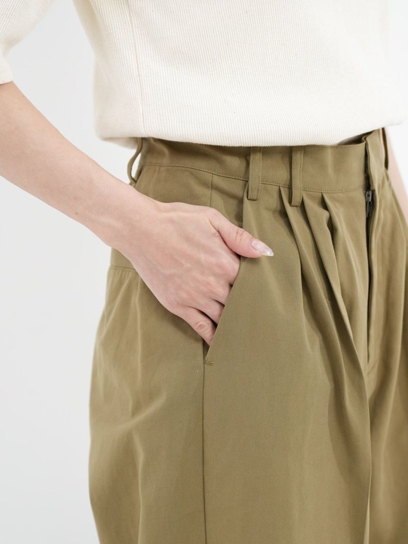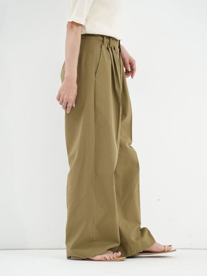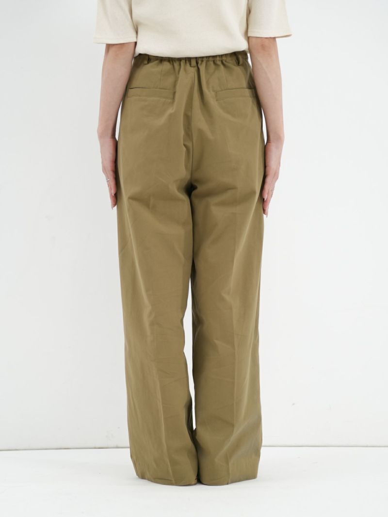 フロントにタックを入れ、コクーンシルエットを出した立体的なパンツ。 ウエストは後ろゴム仕様で、内側にはコードがついているので調整が可能です。存在感のあるワイドシルエットは、シンプルなトップスとのコーデがおすすめです。