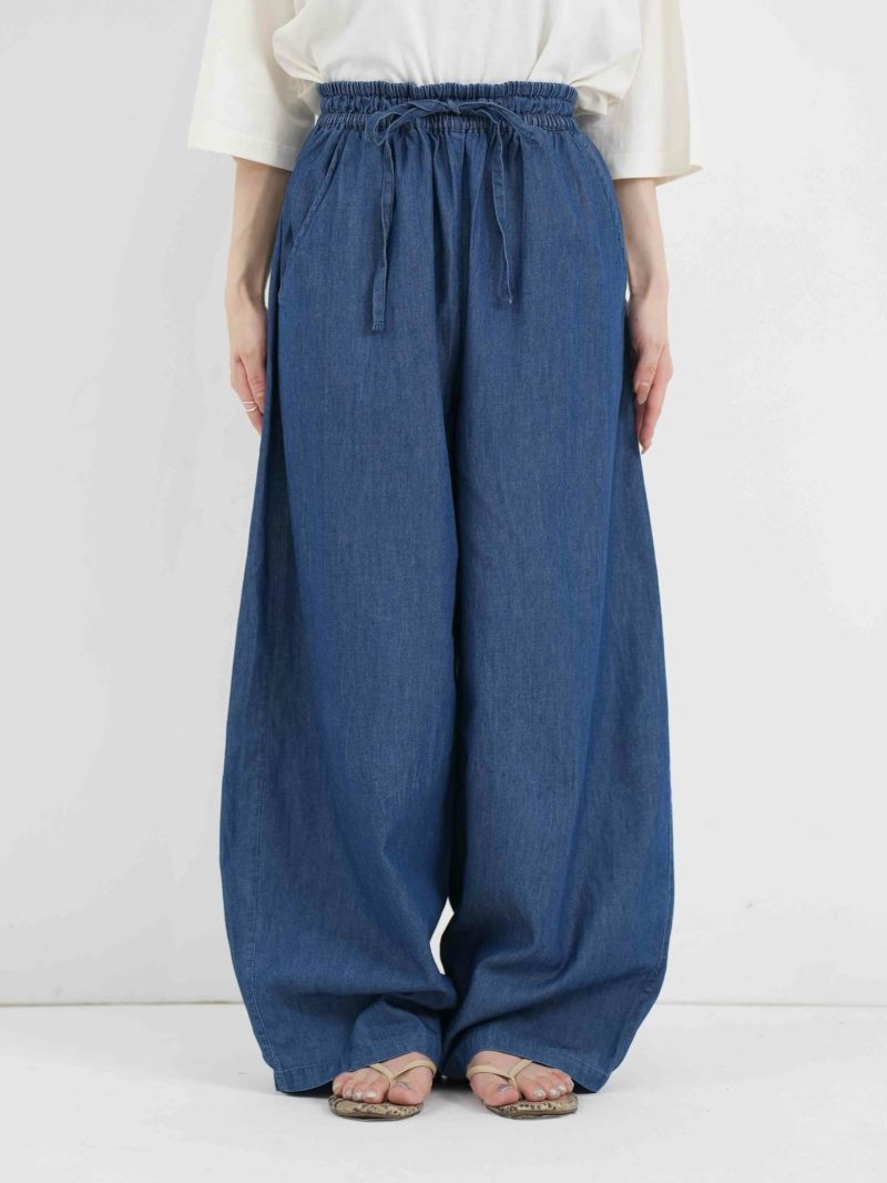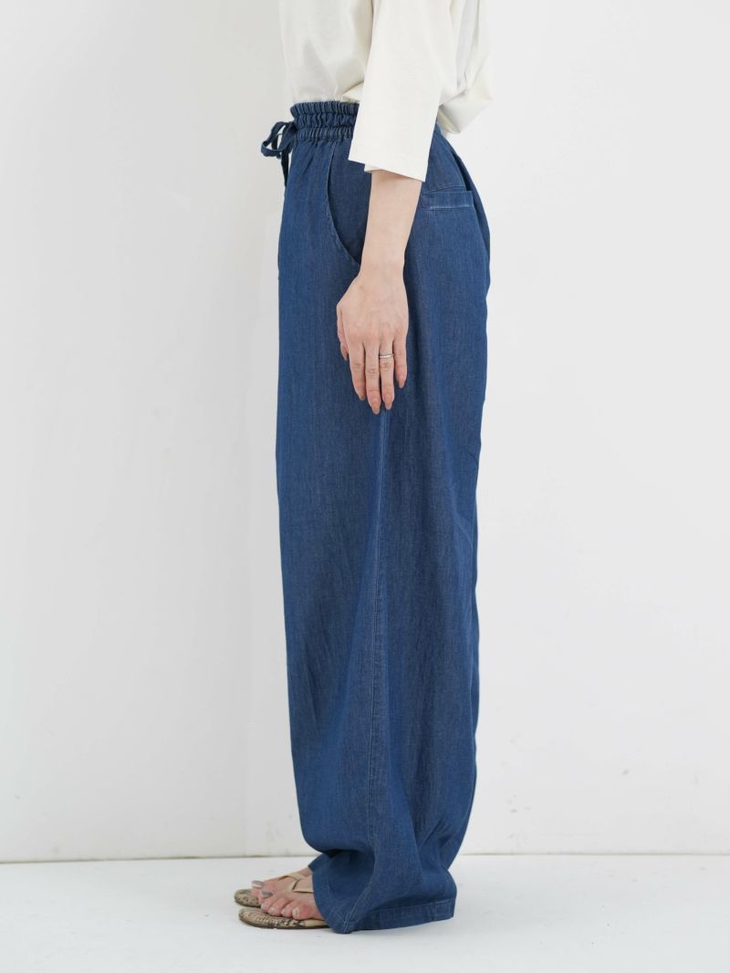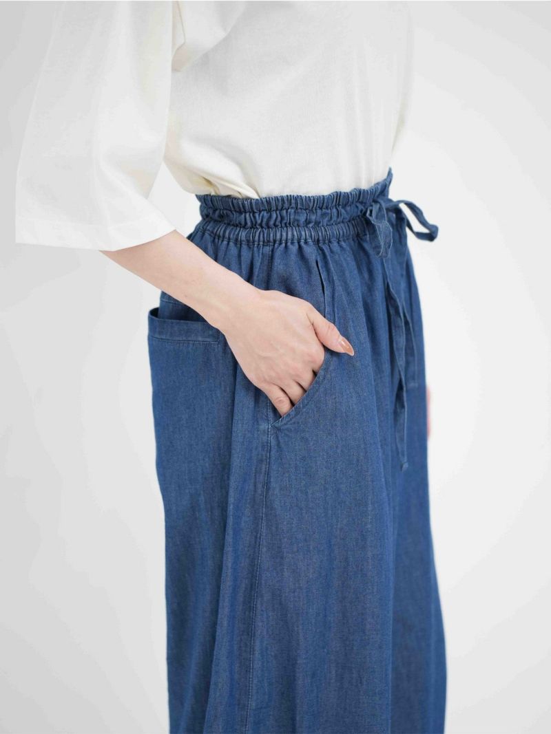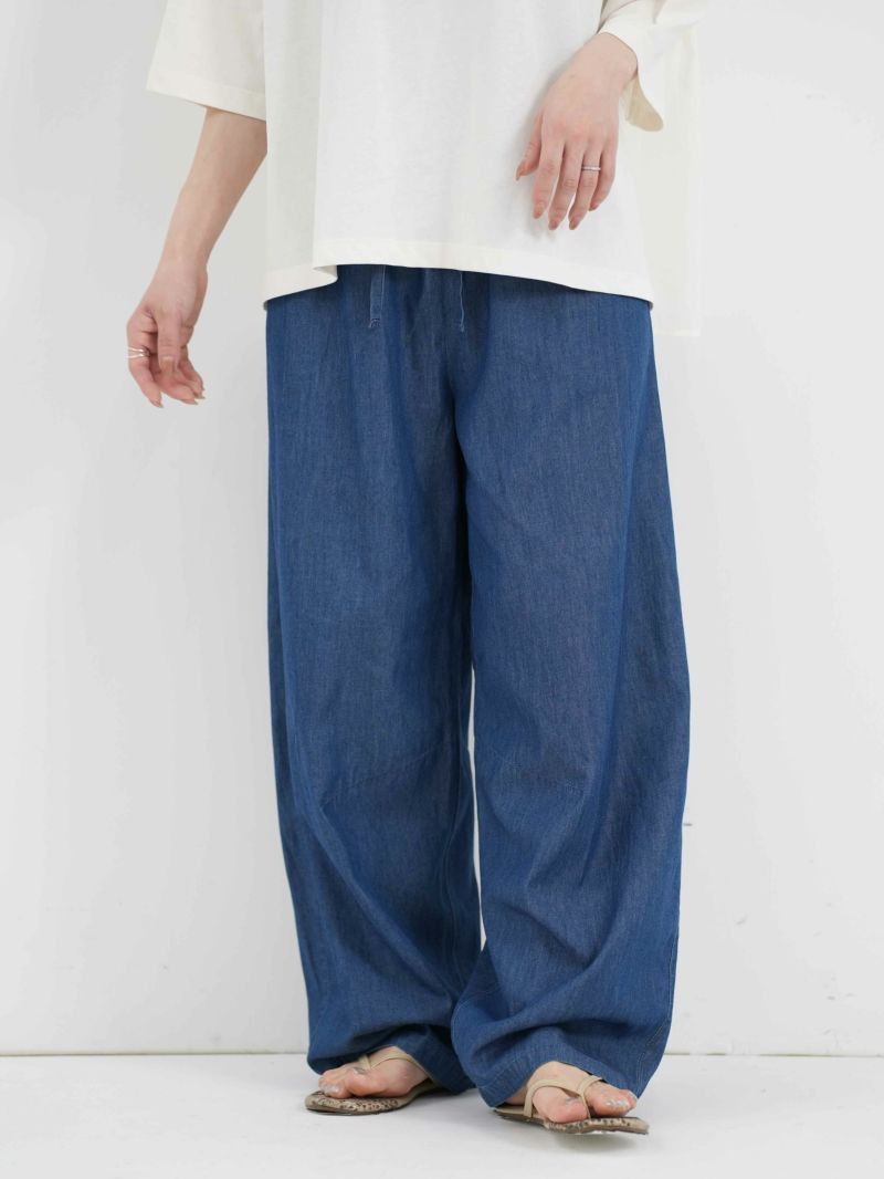 軽いライトデニムで暑い時期にサラッと履いていただけます。トレンドのデザインで、どんなトップスとも合わせやすい新万能ボトムです。