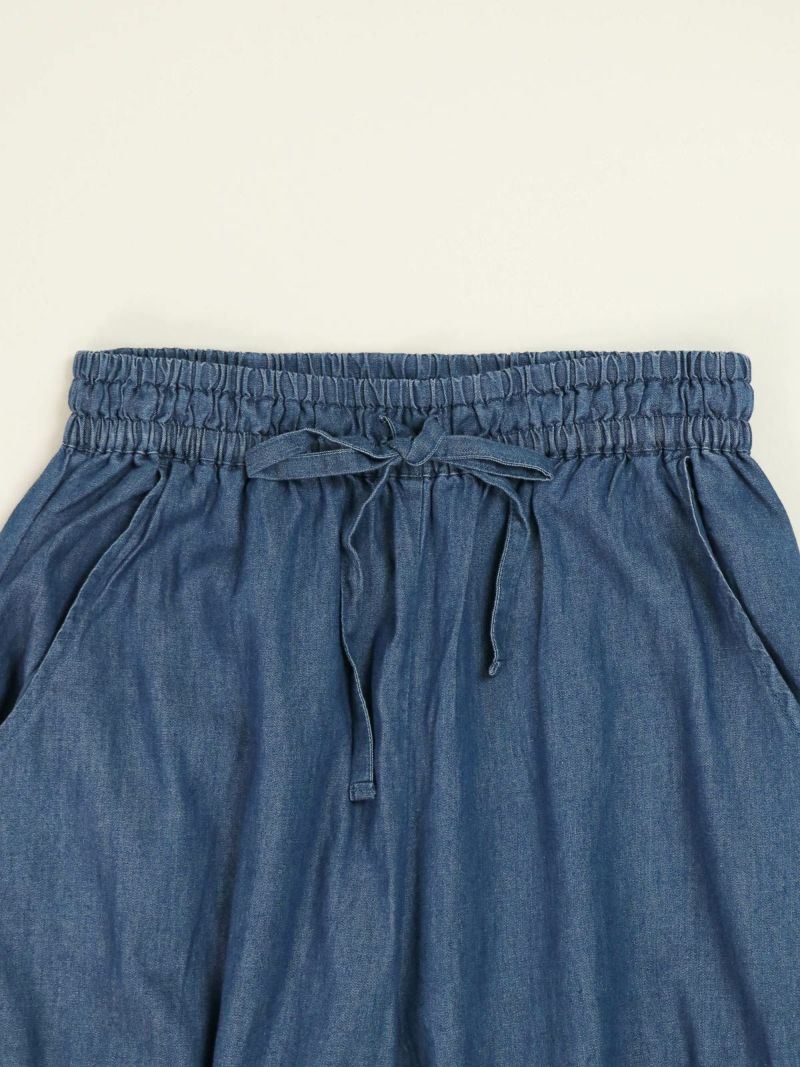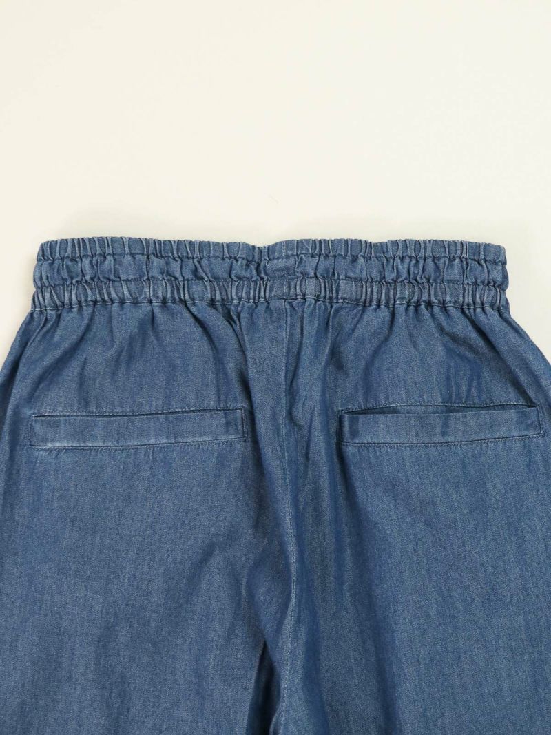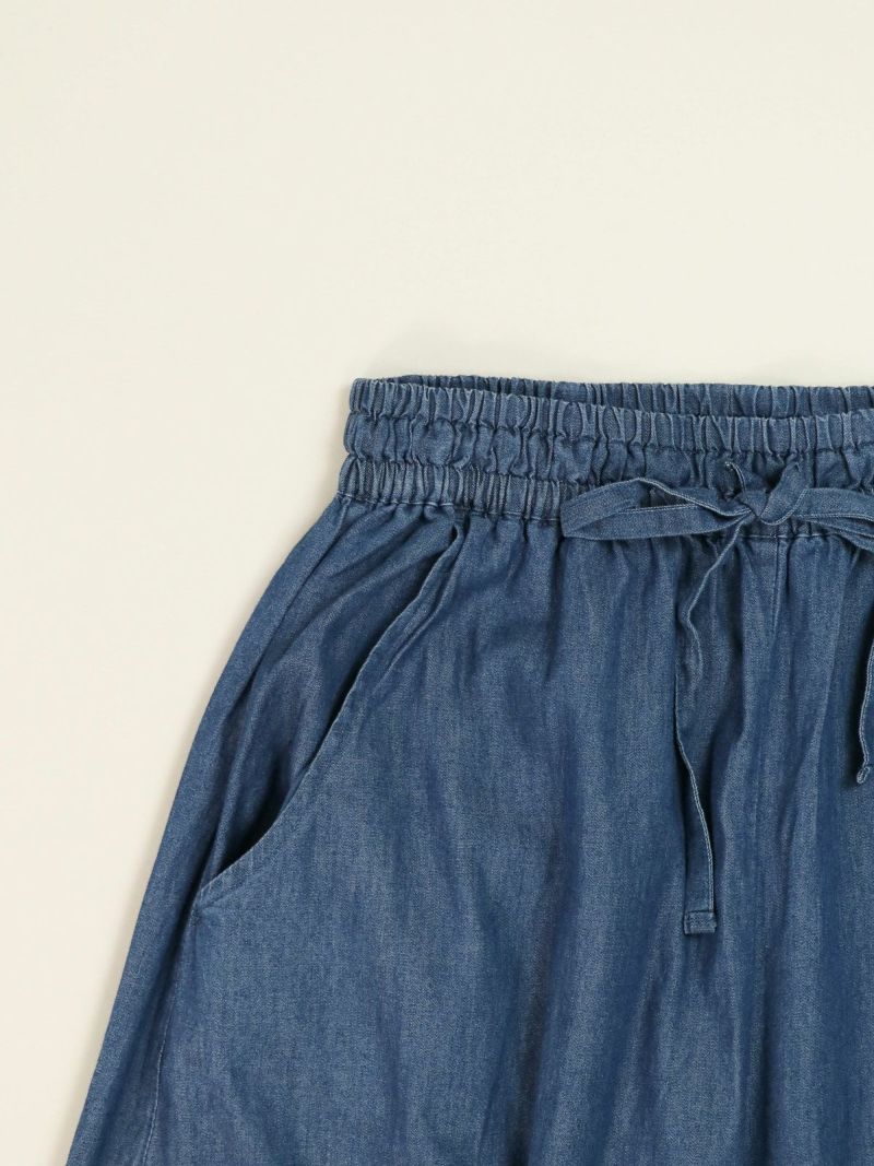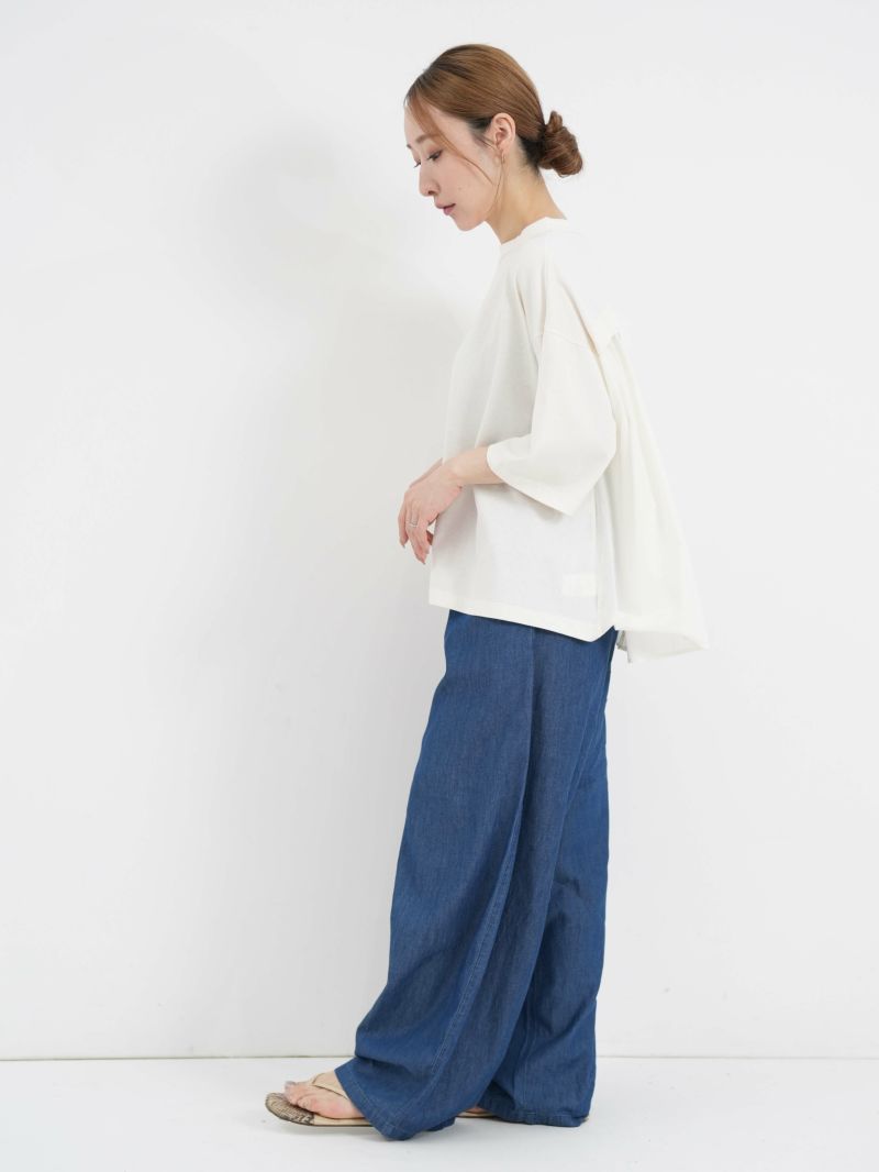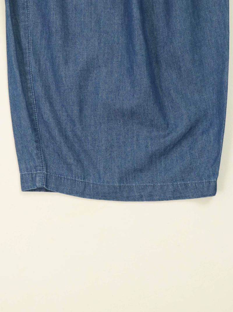 軽いライトデニムで暑い時期にサラッと履いていただけます。トレンドのデザインで、どんなトップスとも合わせやすい新万能ボトムです。