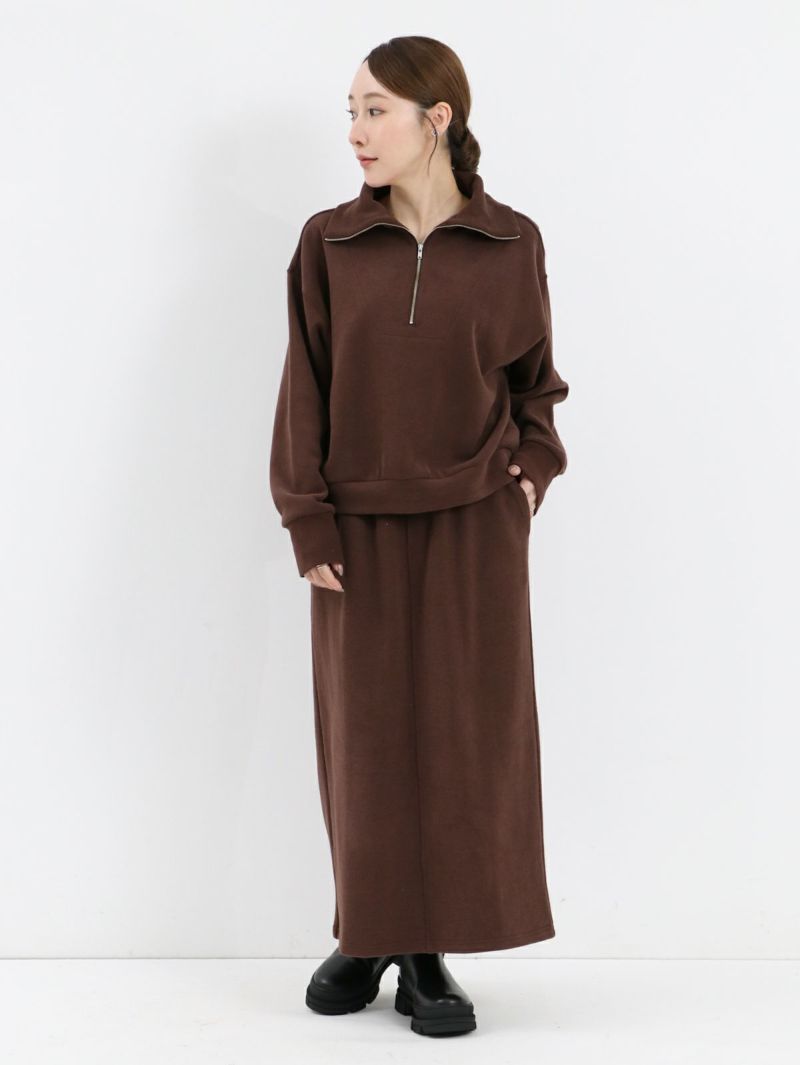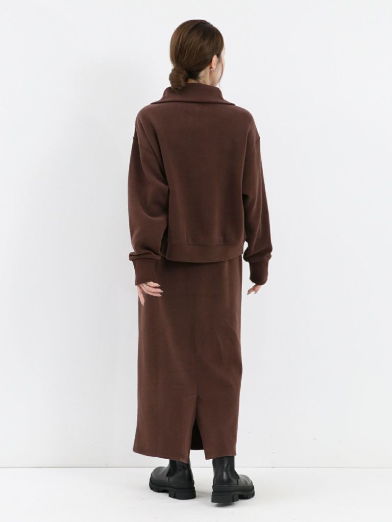 適度な厚みで身体のラインを拾わず立体感が出ます。ジップの開け具合で首元のニュアンスの変化を楽しめ、インにシャツやタートルネックなどを合わせたレイヤードスタイルもおすすめです。同素材のスカートとのセットアップ着用も可能。