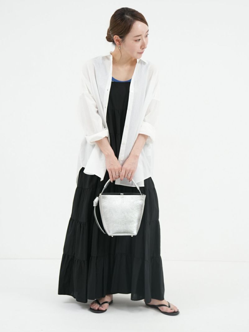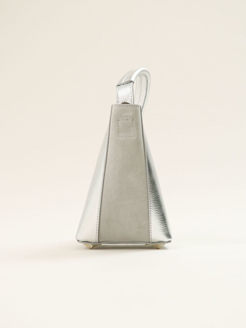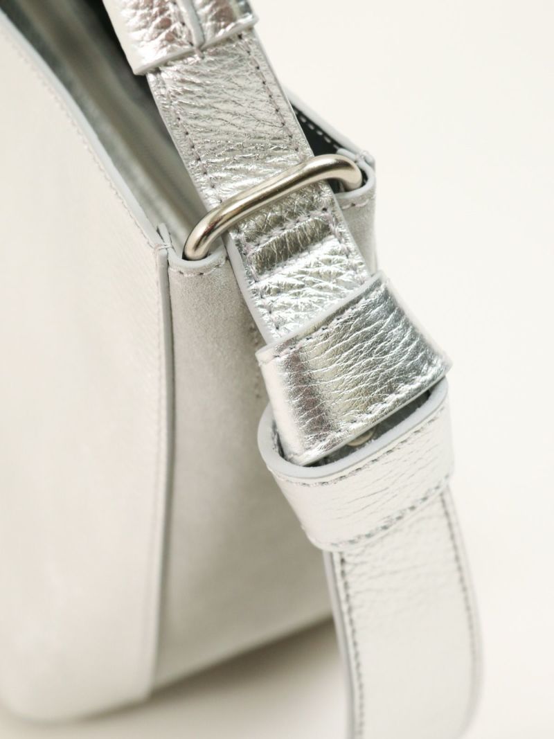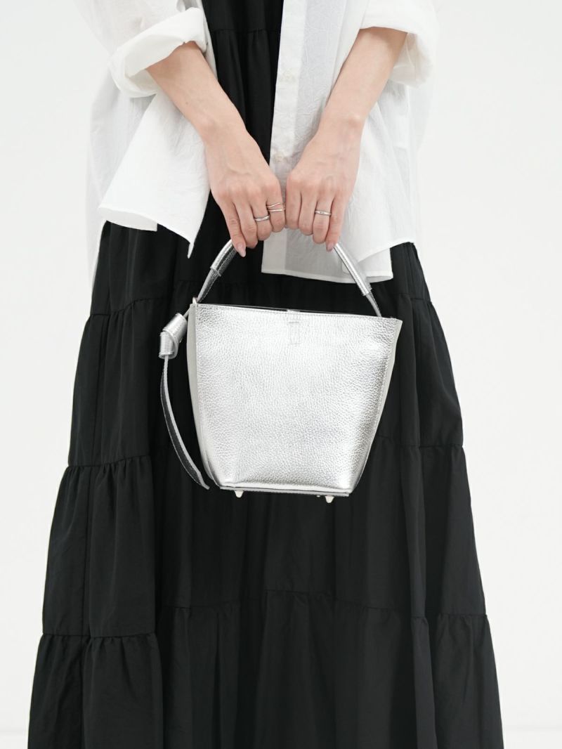 上品な艶とシボ感のあるレザーを使用しており、サイドに垂らしてぐるりと結んだハンドルや、スエードの切り替えがアクセント。着脱可能なショルダーストラップ付きで斜め掛けもでき、サイドのボタンで形を変えられるのも◎ストラップを取り付けてポシェットにもなる同素材のポーチ付きで幅広く活躍するアイテムです。