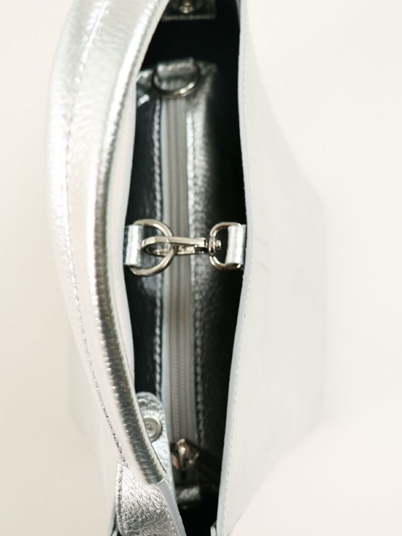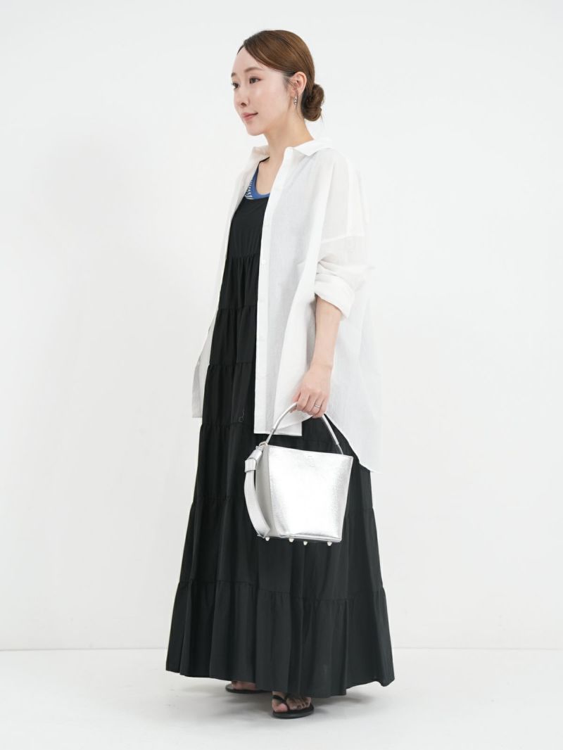 上品な艶とシボ感のあるレザーを使用しており、サイドに垂らしてぐるりと結んだハンドルや、スエードの切り替えがアクセント。着脱可能なショルダーストラップ付きで斜め掛けもでき、サイドのボタンで形を変えられるのも◎ストラップを取り付けてポシェットにもなる同素材のポーチ付きで幅広く活躍するアイテムです。