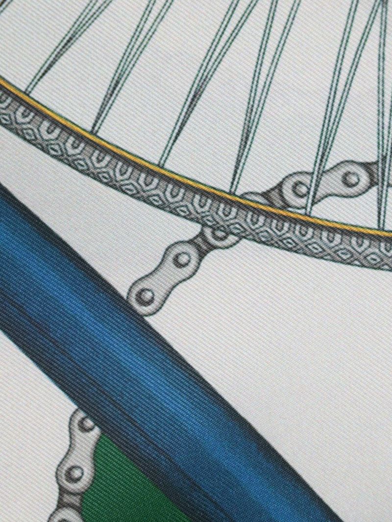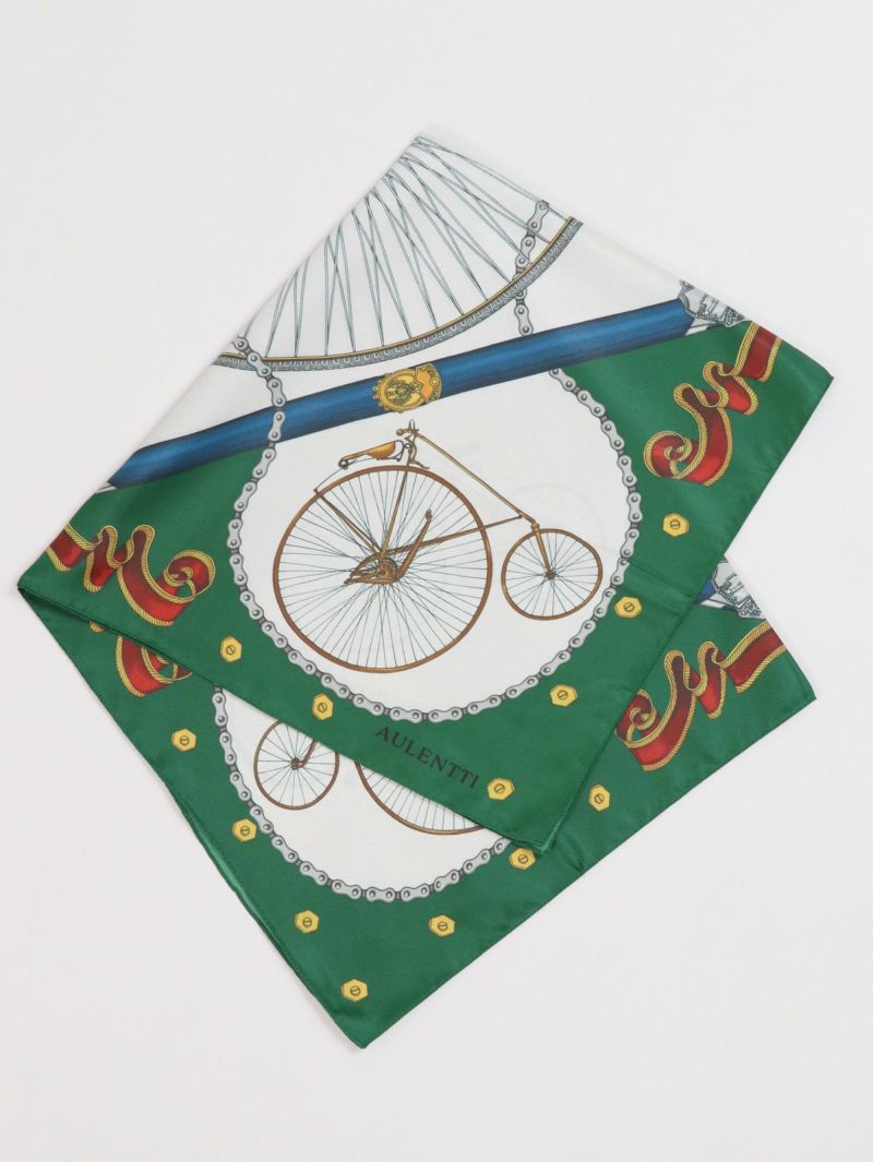 自転車をモチーフにしたクラシック柄の大判スカーフ。 ポリエステル100%ながらも高級感のある滑らかな肌触り。首元に巻いたり、バッグに取り付けたりと様々なシーンやコーディネートのアクセントに◎