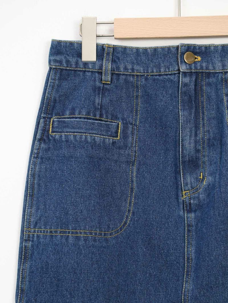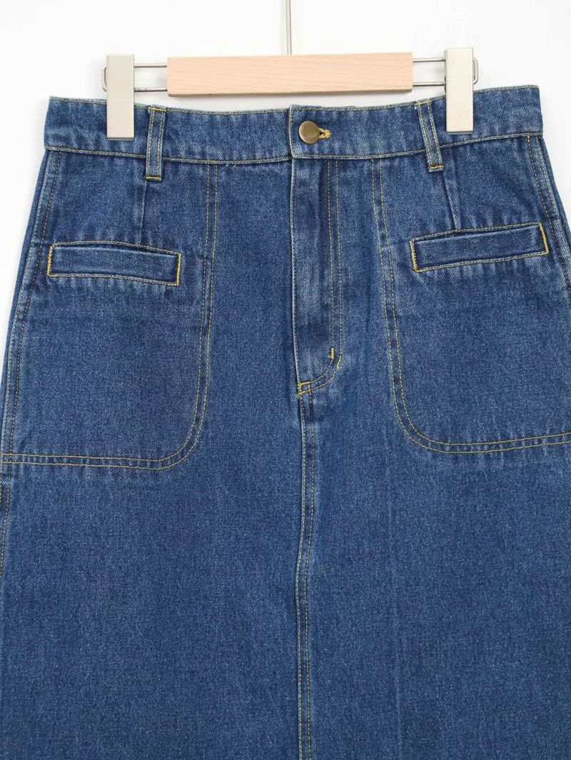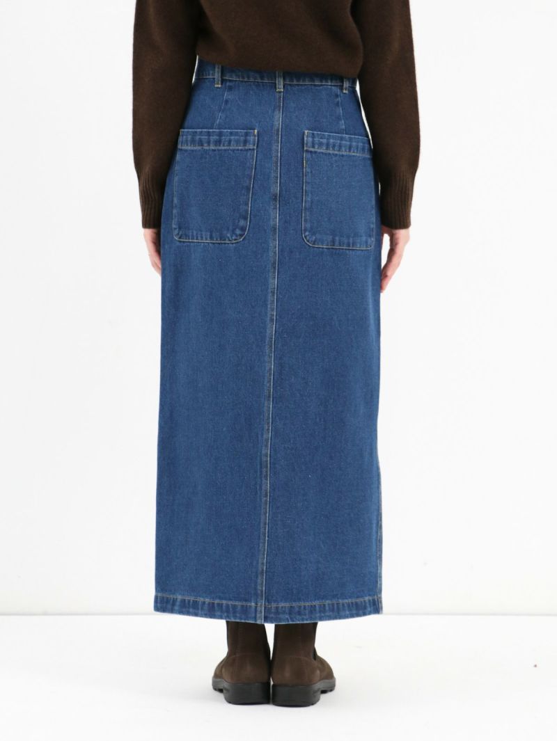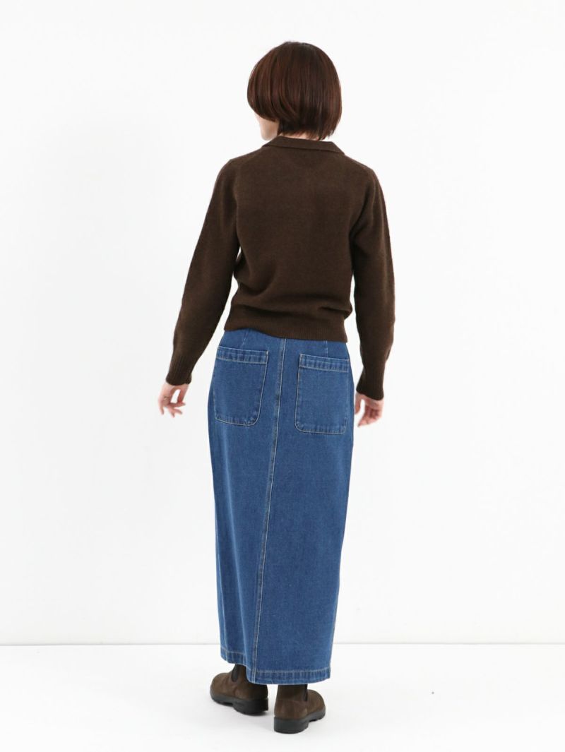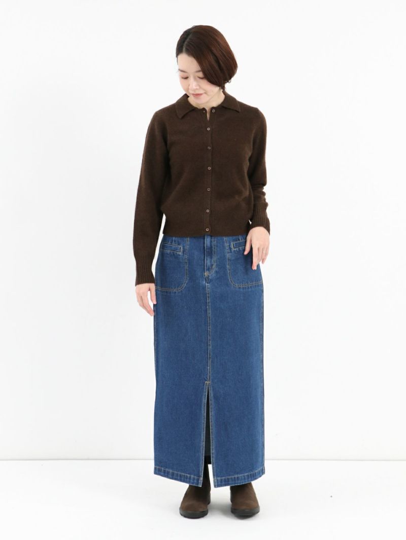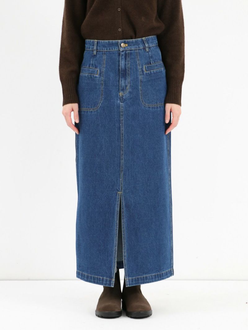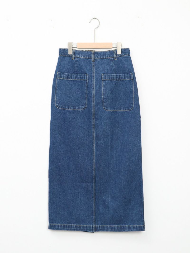 柔らかい素材のデニムを使用したロングスカート。 フロントスリットが抜け感と動きやすさをプラス。カジュアルなトップスからきれいめなスタイリングまで幅広くあわせられる万能アイテムです。