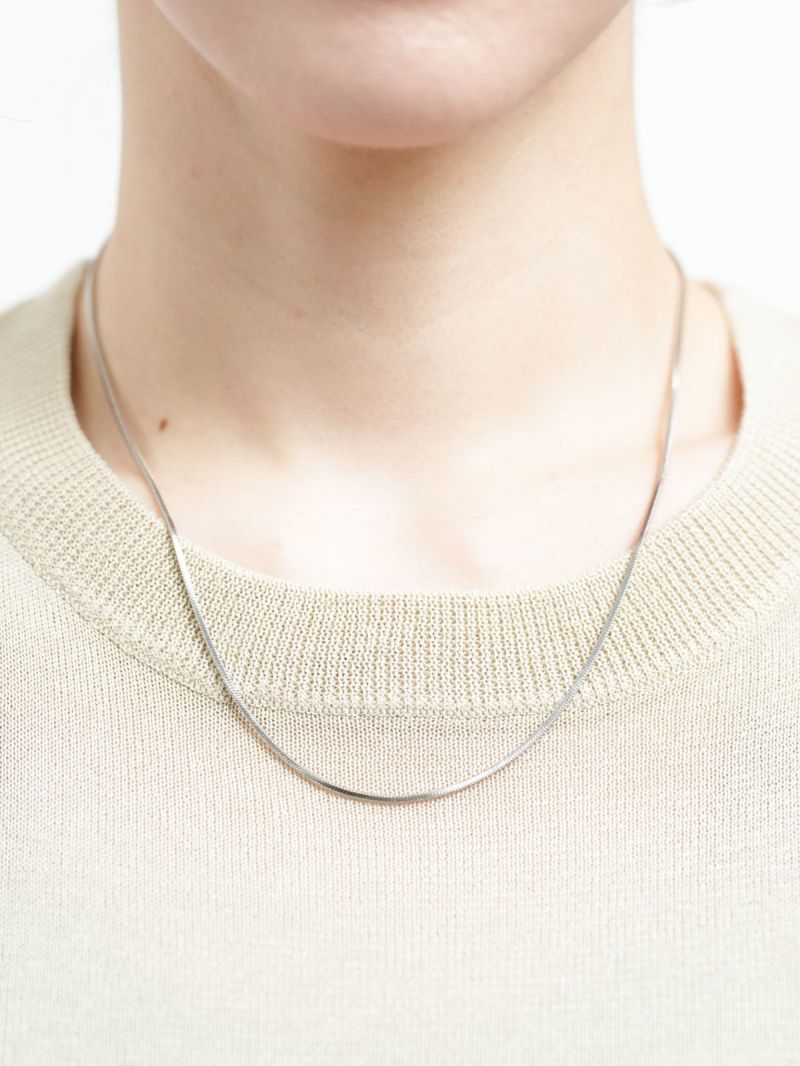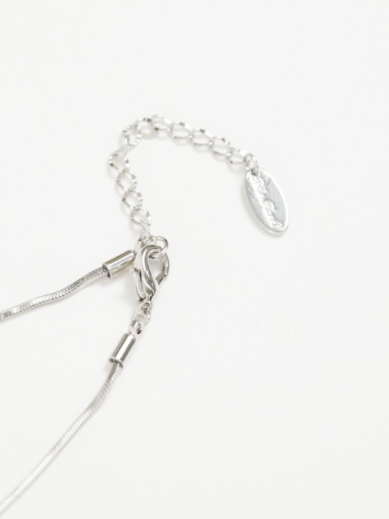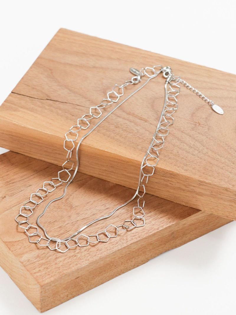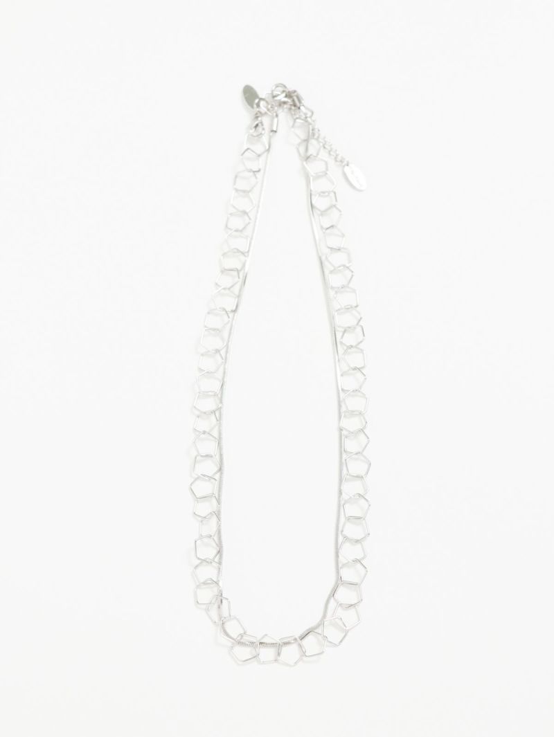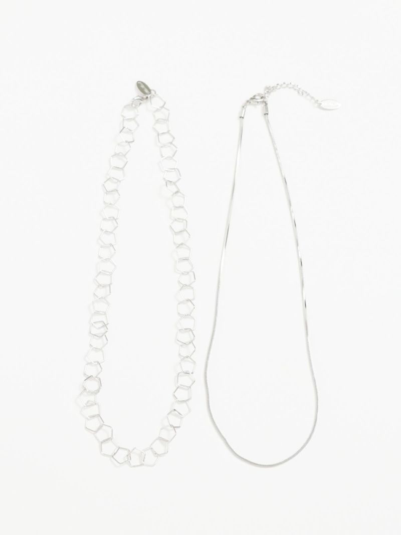 2本のチェーンがSETになったネックレス。 華奢で滑らかなスネークチェーンは単品でどんなファッションにも使えるカッコ可愛い1本。五角形のペンタゴンチェーンは光の当たり具合できらりと光ります。留め具で止める長さが調整出来るのでブレスレットにも◎