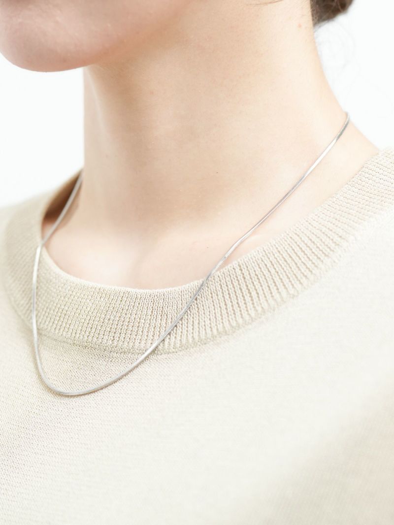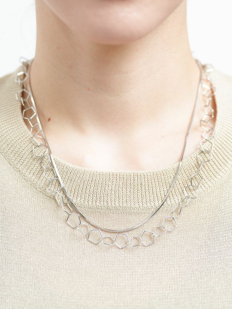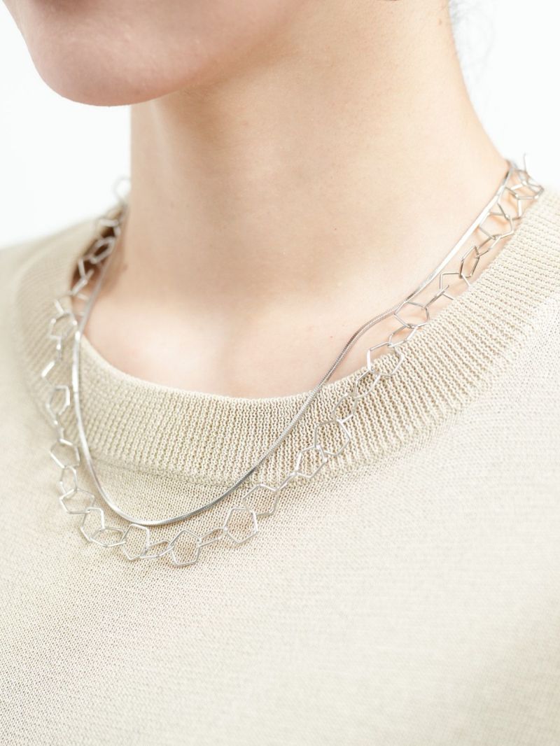 2本のチェーンがSETになったネックレス。 華奢で滑らかなスネークチェーンは単品でどんなファッションにも使えるカッコ可愛い1本。五角形のペンタゴンチェーンは光の当たり具合できらりと光ります。留め具で止める長さが調整出来るのでブレスレットにも◎
