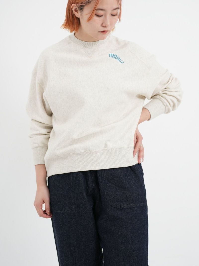 肌触り柔らかなスウェットプルオーバー。 ベビー裏毛で季節の変わり目に程よい生地感です。肩と袖に切り替えがあるのと、胸元のロゴがポイントです。