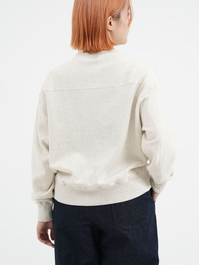 肌触り柔らかなスウェットプルオーバー。 ベビー裏毛で季節の変わり目に程よい生地感です。肩と袖に切り替えがあるのと、胸元のロゴがポイントです。