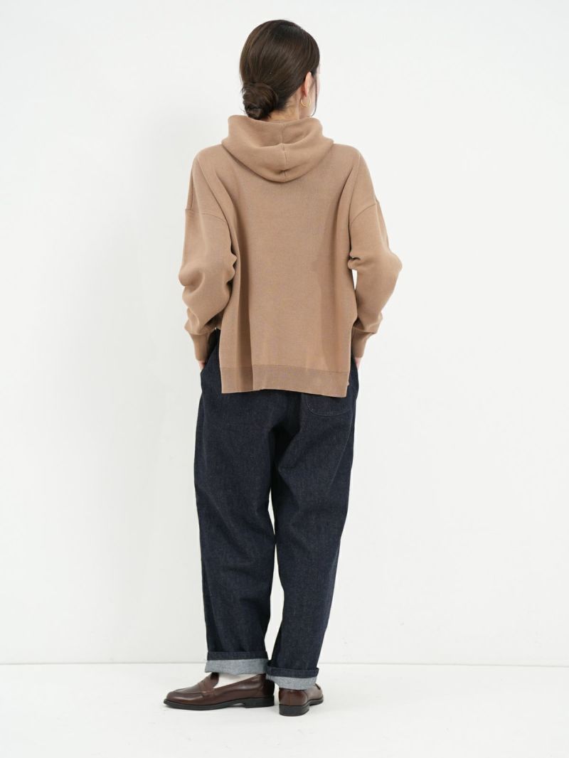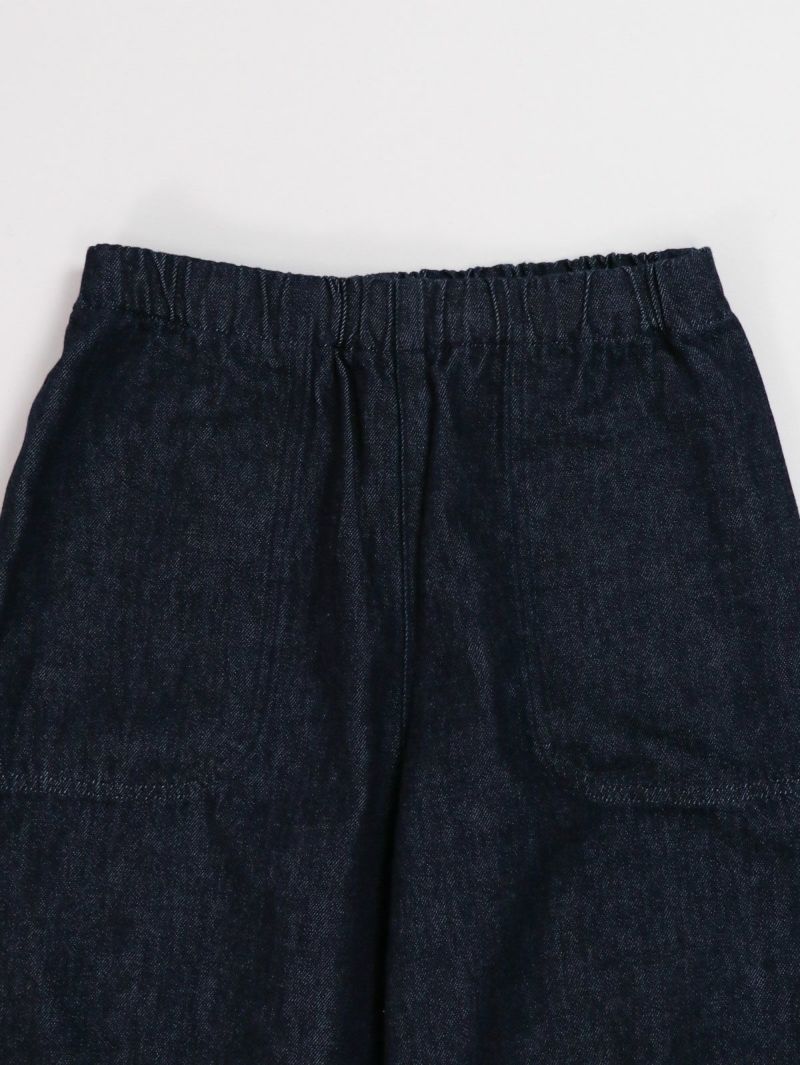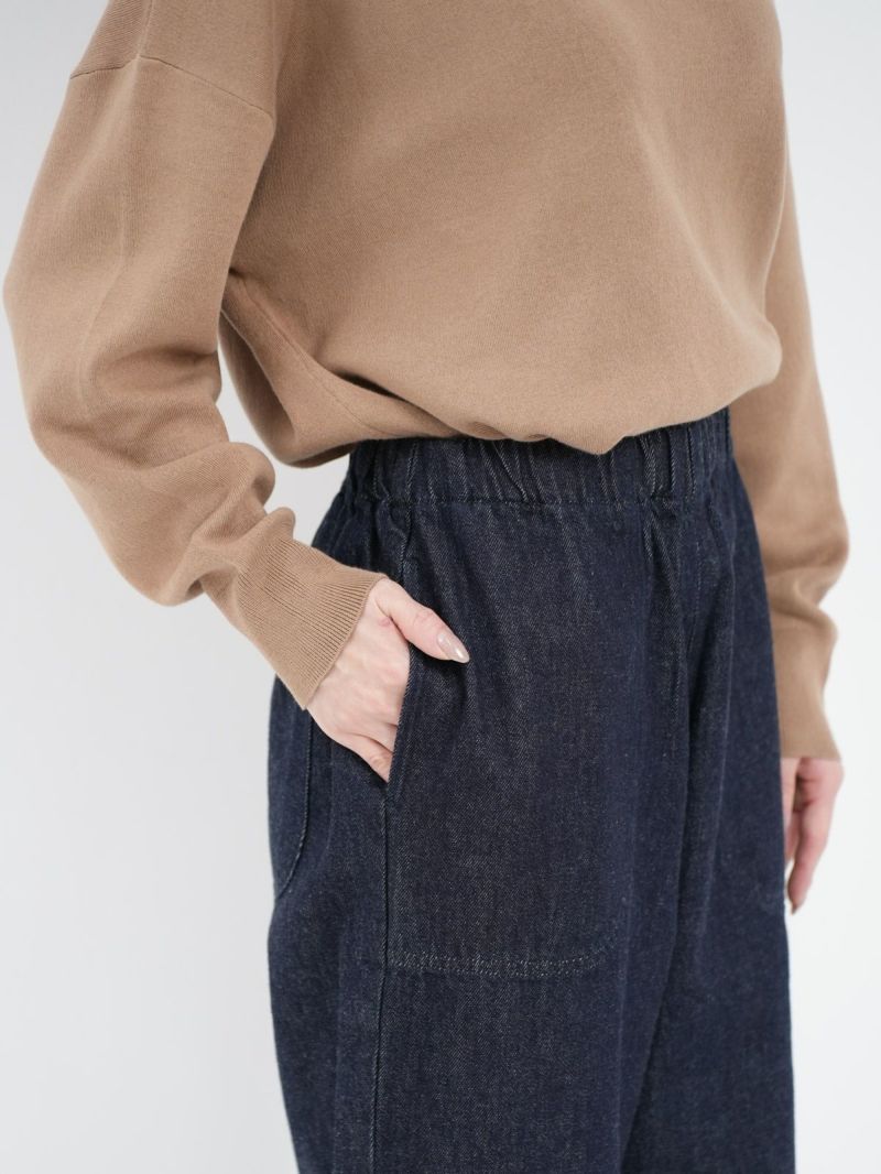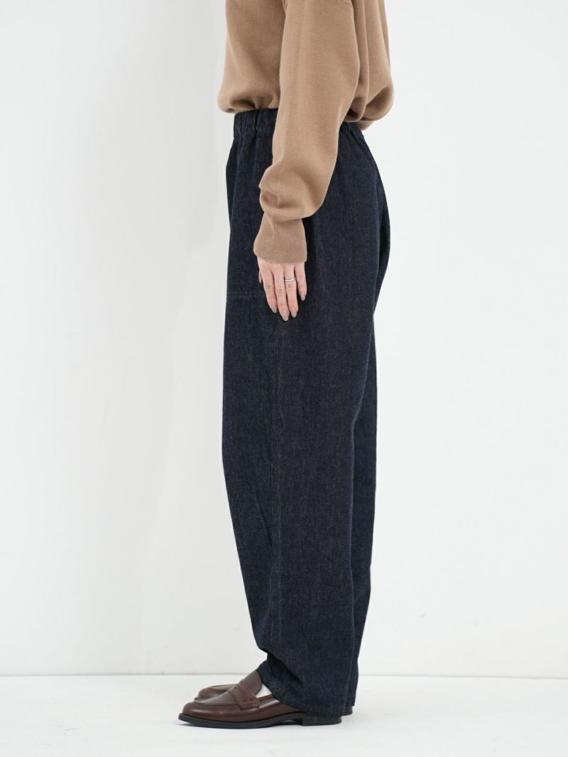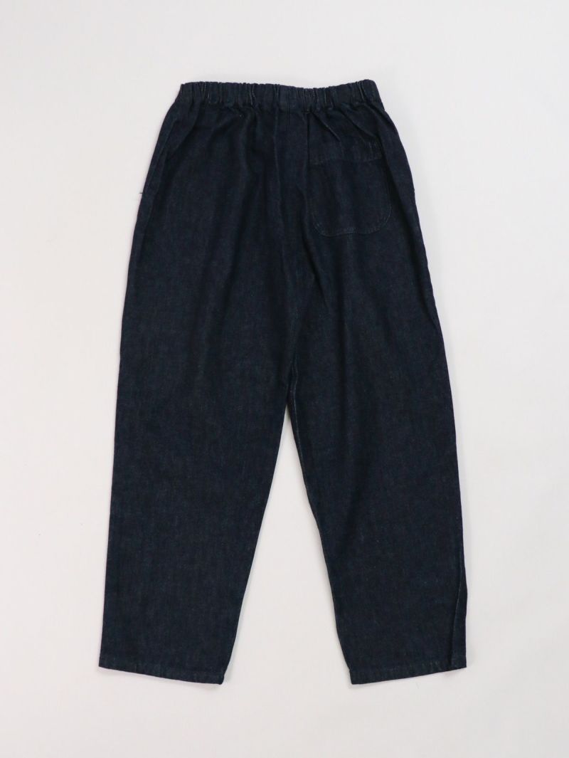 インディゴ染めの深みのある色合いとごわつきのないソフトな肌触りが魅力のパンツ。 ウエストがゴム使用になっているため締め付け感がなく楽な着心地で、ストレートに近いテーパードシルエットです。