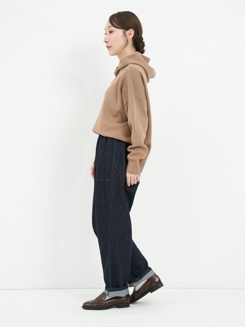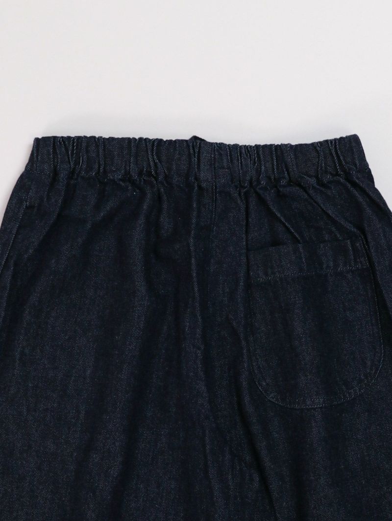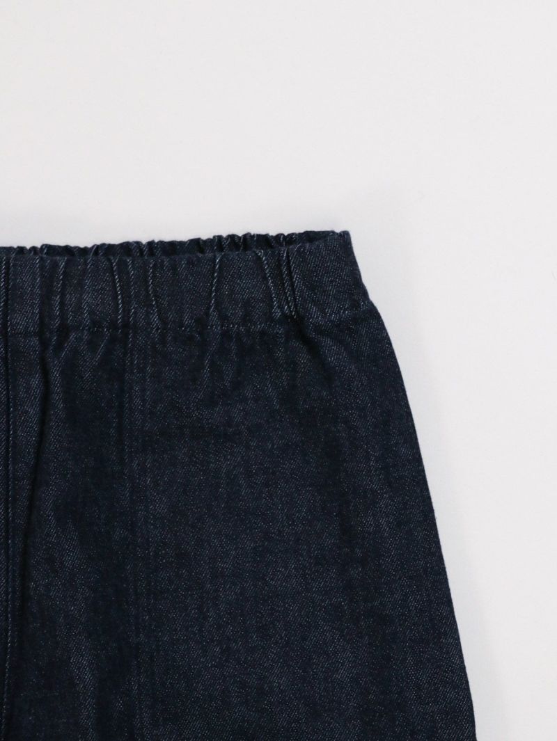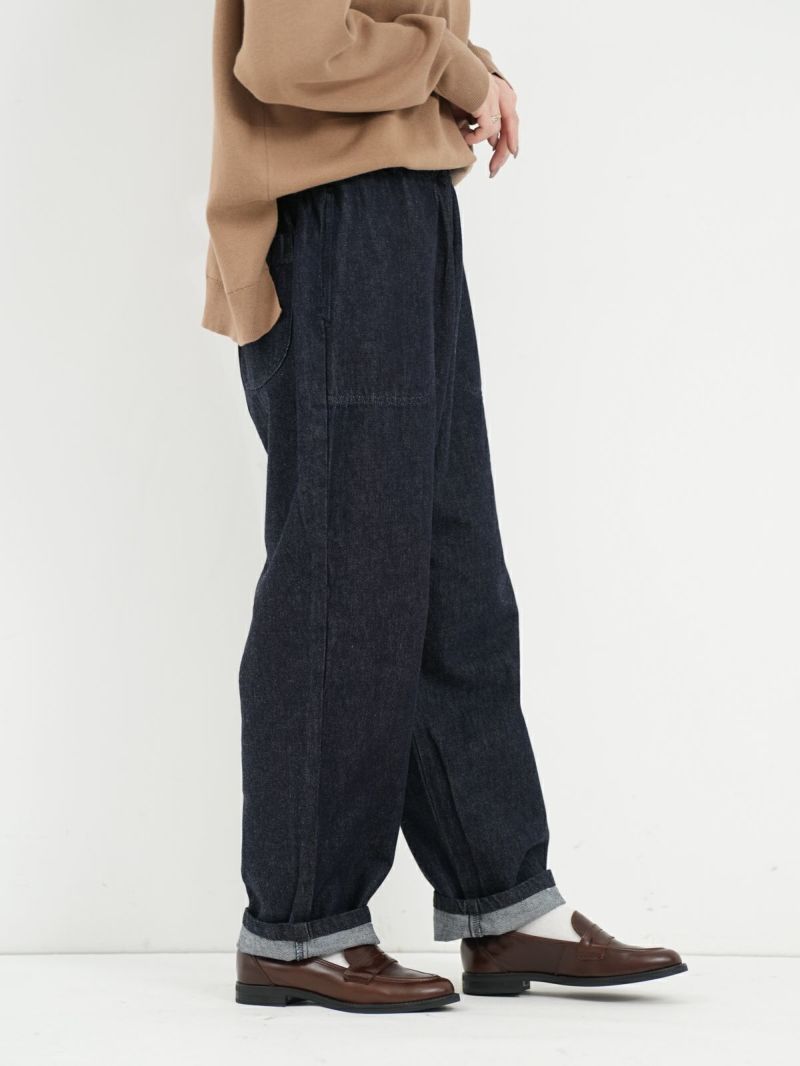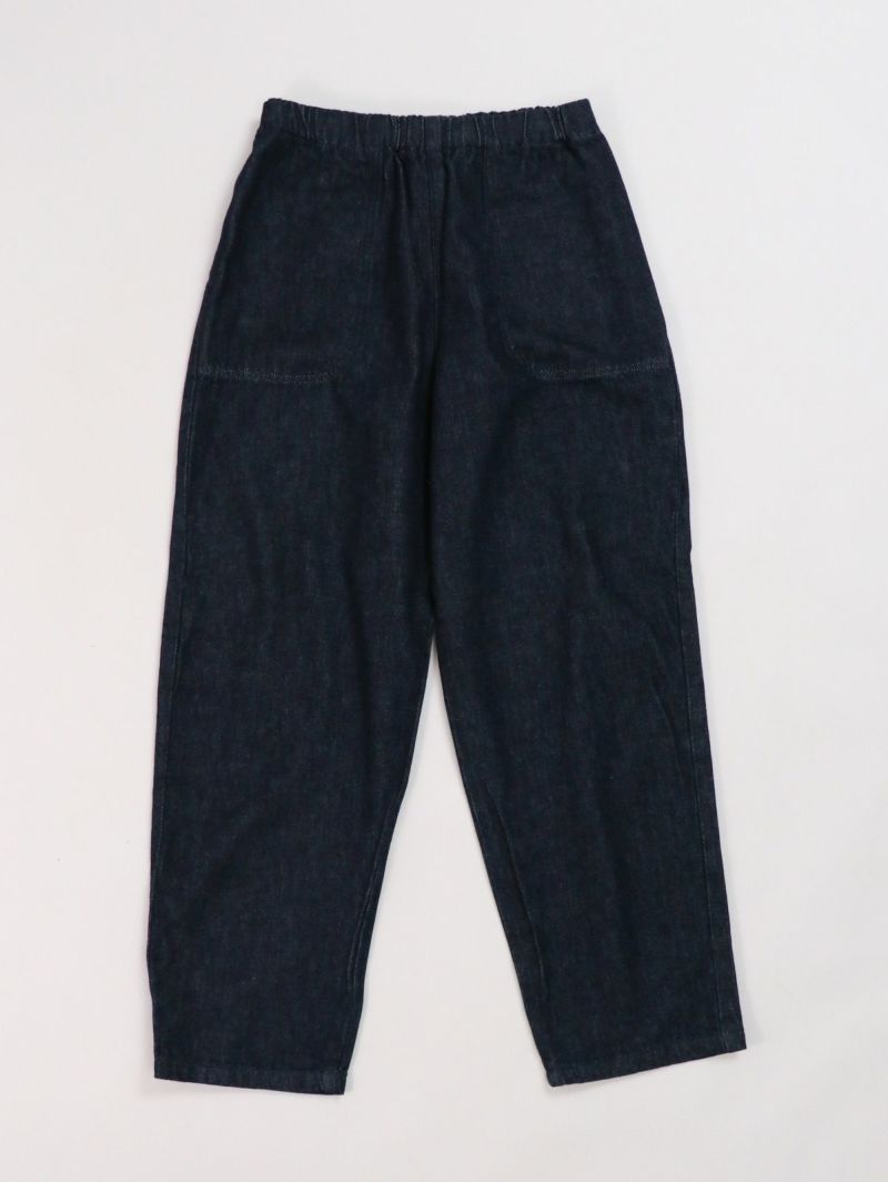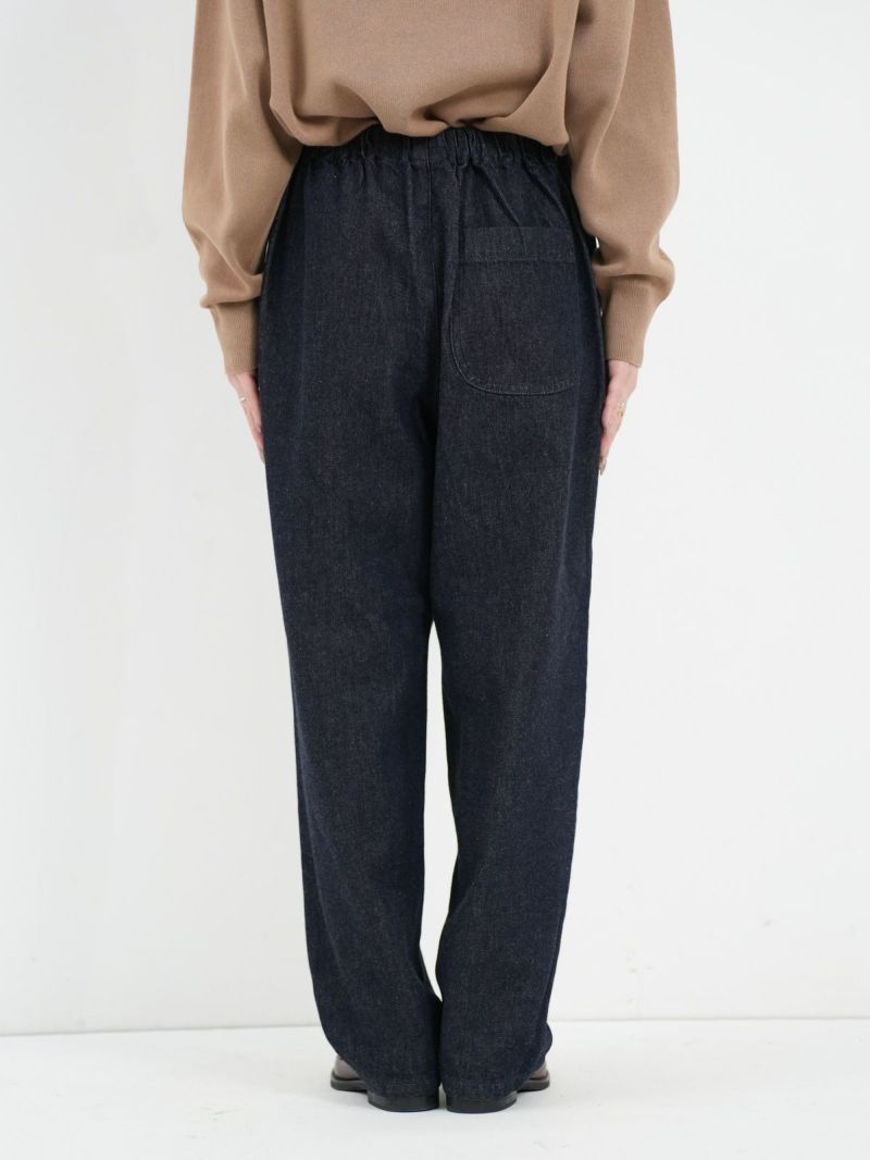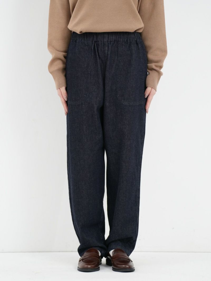 インディゴ染めの深みのある色合いとごわつきのないソフトな肌触りが魅力のパンツ。 ウエストがゴム使用になっているため締め付け感がなく楽な着心地で、ストレートに近いテーパードシルエットです。