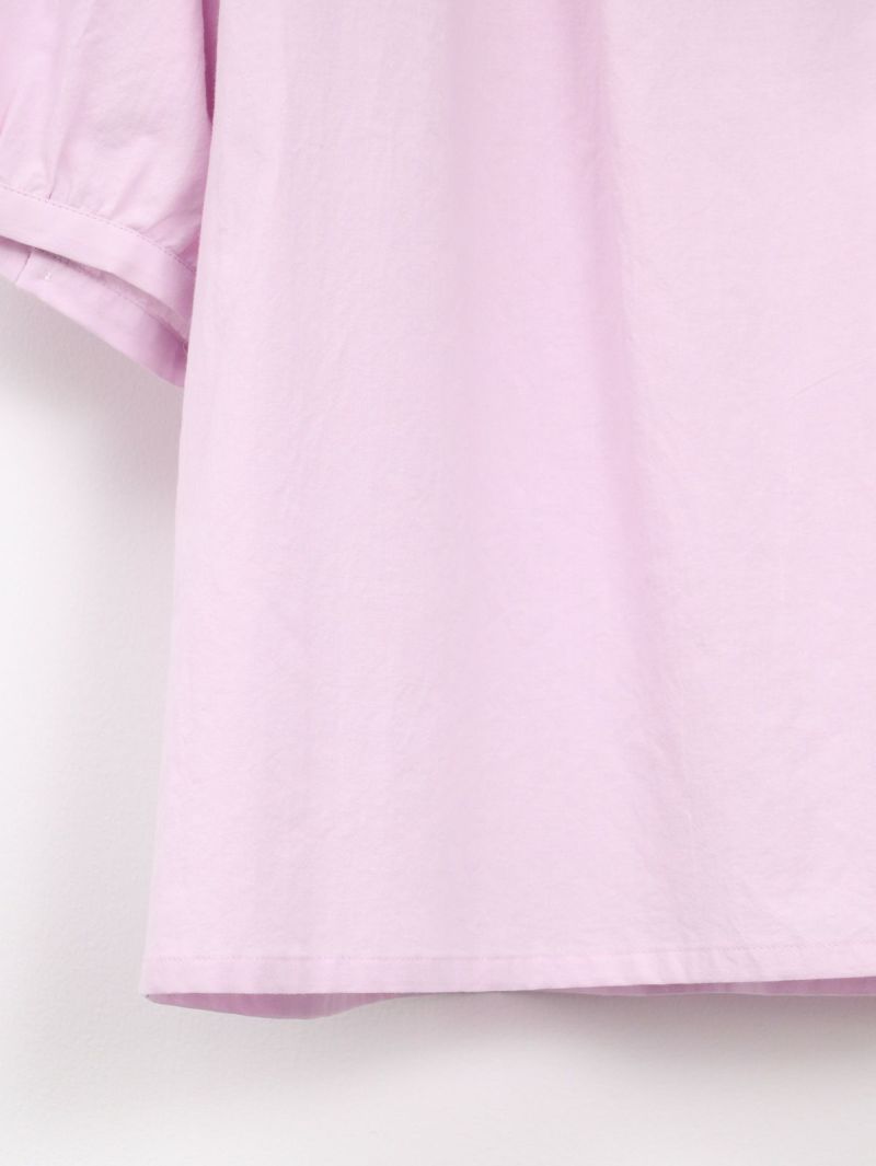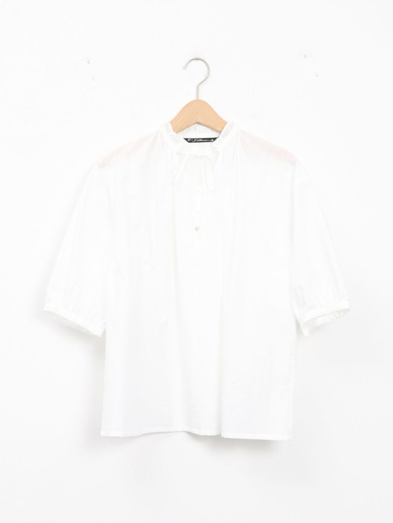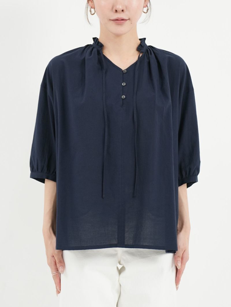 軽く、優しい肌触りの綿ローンを使用したブラウス。 襟元のフリルがさりげないポイントです。リボンは結んでも垂らしても。すっきりとした着丈で、ボトムインせずともバランス良く着ていただけます。