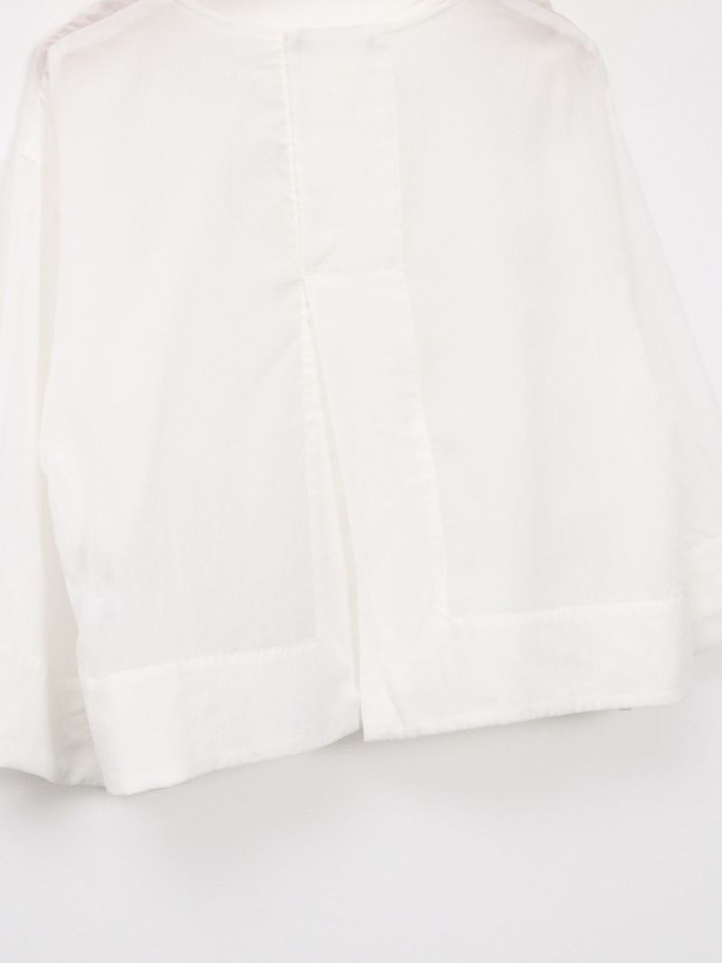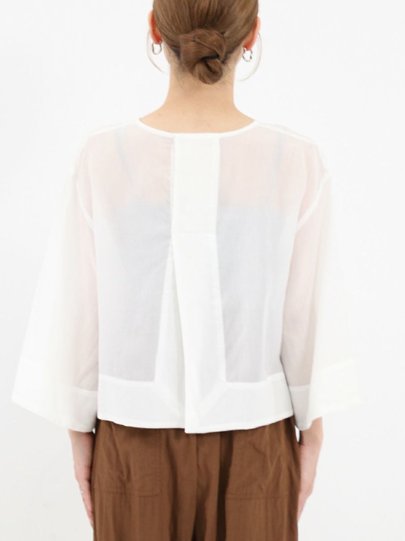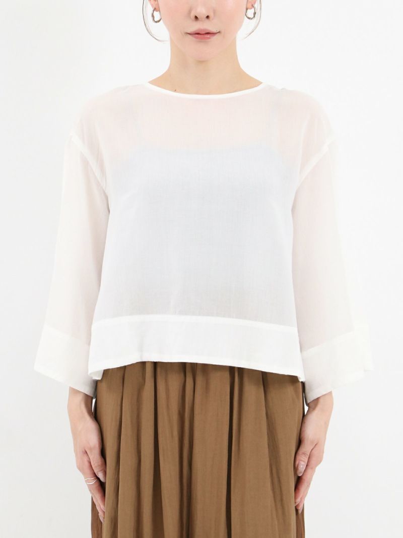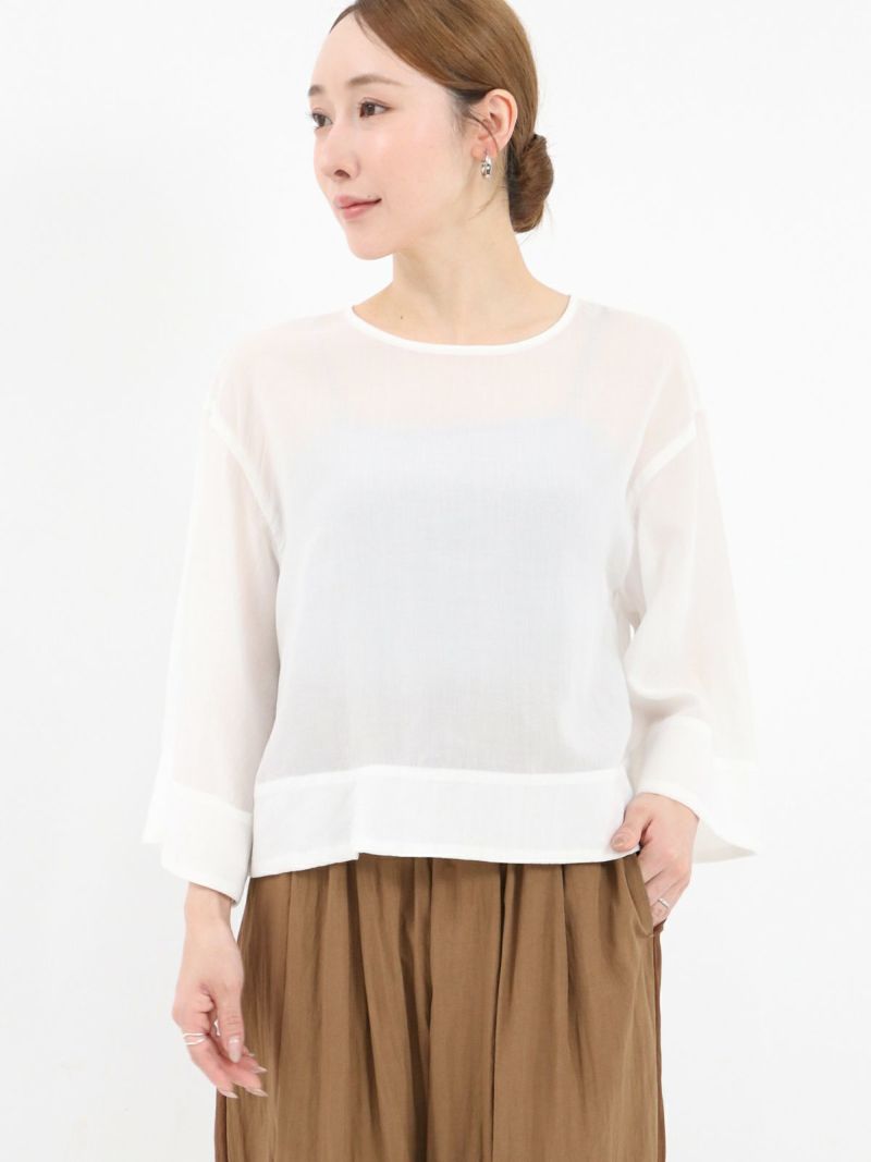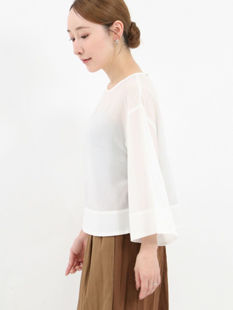しなやかで肌なじみが良く、通気性にも優れたプルオーバータイプのブラウス。 シンプルながら、ワイドスリーブとバックスリットがモードなアクセントに。後ろはスナップボタン仕様で、着脱がしやすくなっています。トレンドのクロップド丈は、ワイドパンツやロングスカートとのコーデがおすすめです。