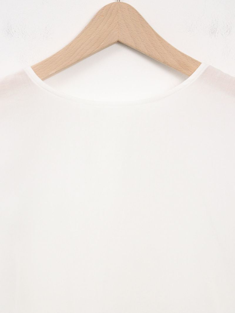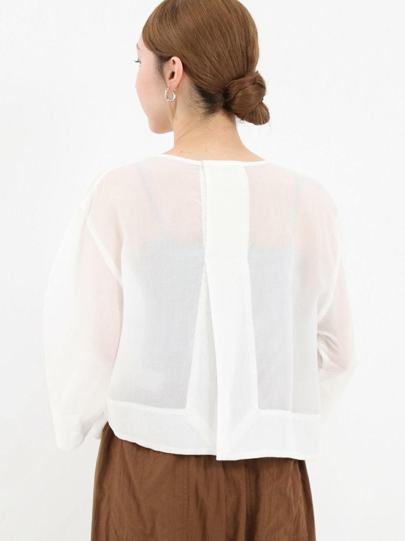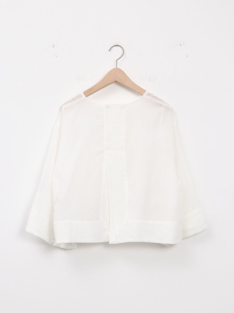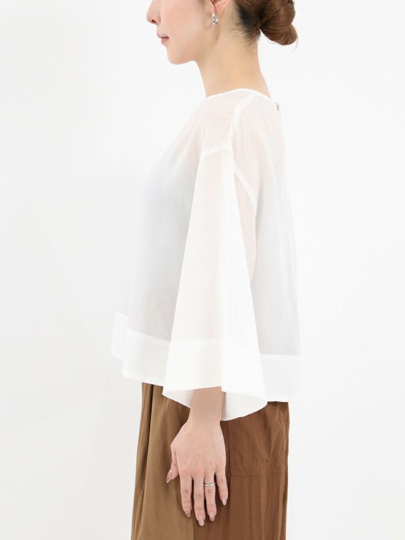 しなやかで肌なじみが良く、通気性にも優れたプルオーバータイプのブラウス。 シンプルながら、ワイドスリーブとバックスリットがモードなアクセントに。後ろはスナップボタン仕様で、着脱がしやすくなっています。トレンドのクロップド丈は、ワイドパンツやロングスカートとのコーデがおすすめです。