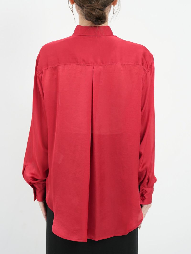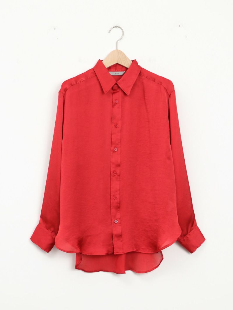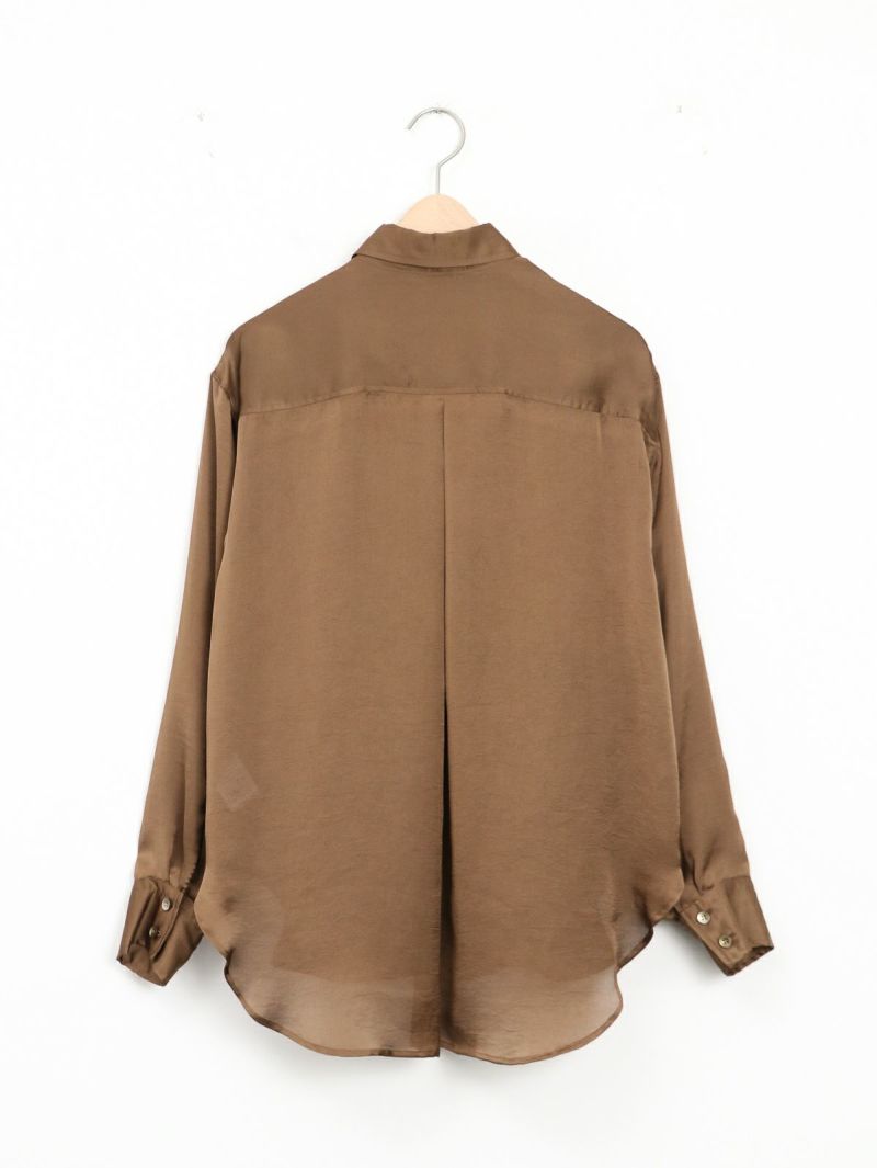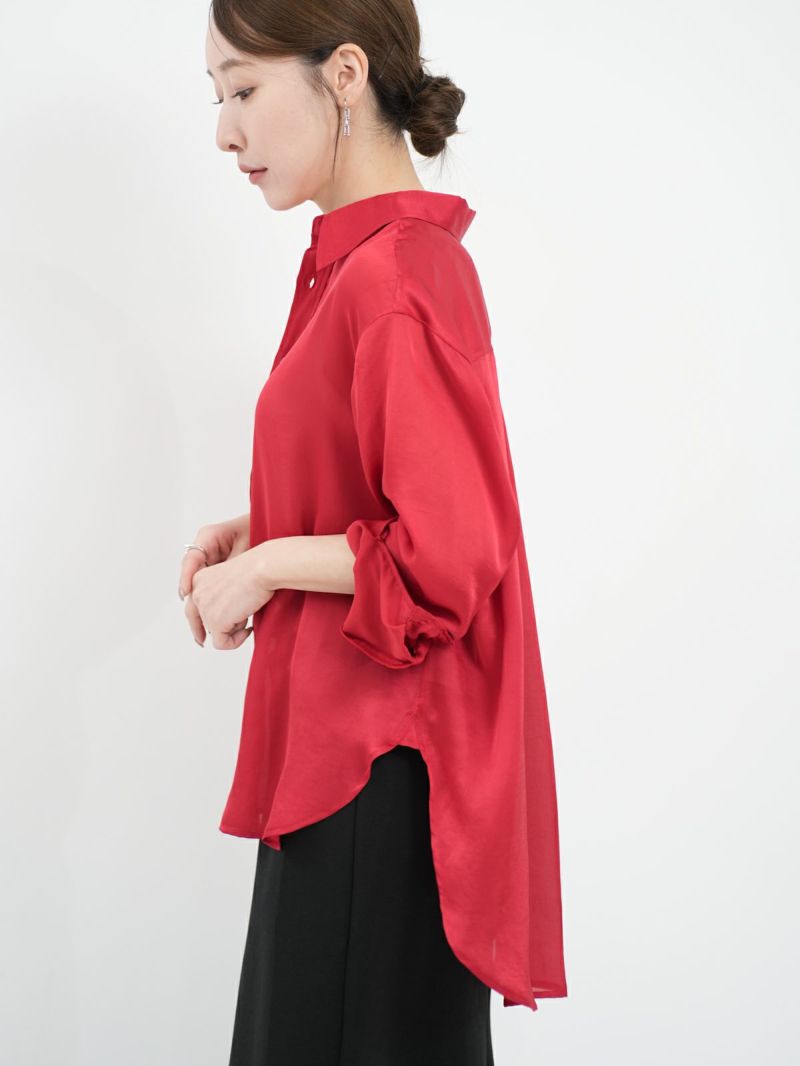 独特の透け感が特徴的なサテンオーガンジーシャツ。 程よいゆったりめのシルエットで羽織りとしても◎シンプルなアイテムにプラスで、一気に華やかなコーディネートが楽しめます♪